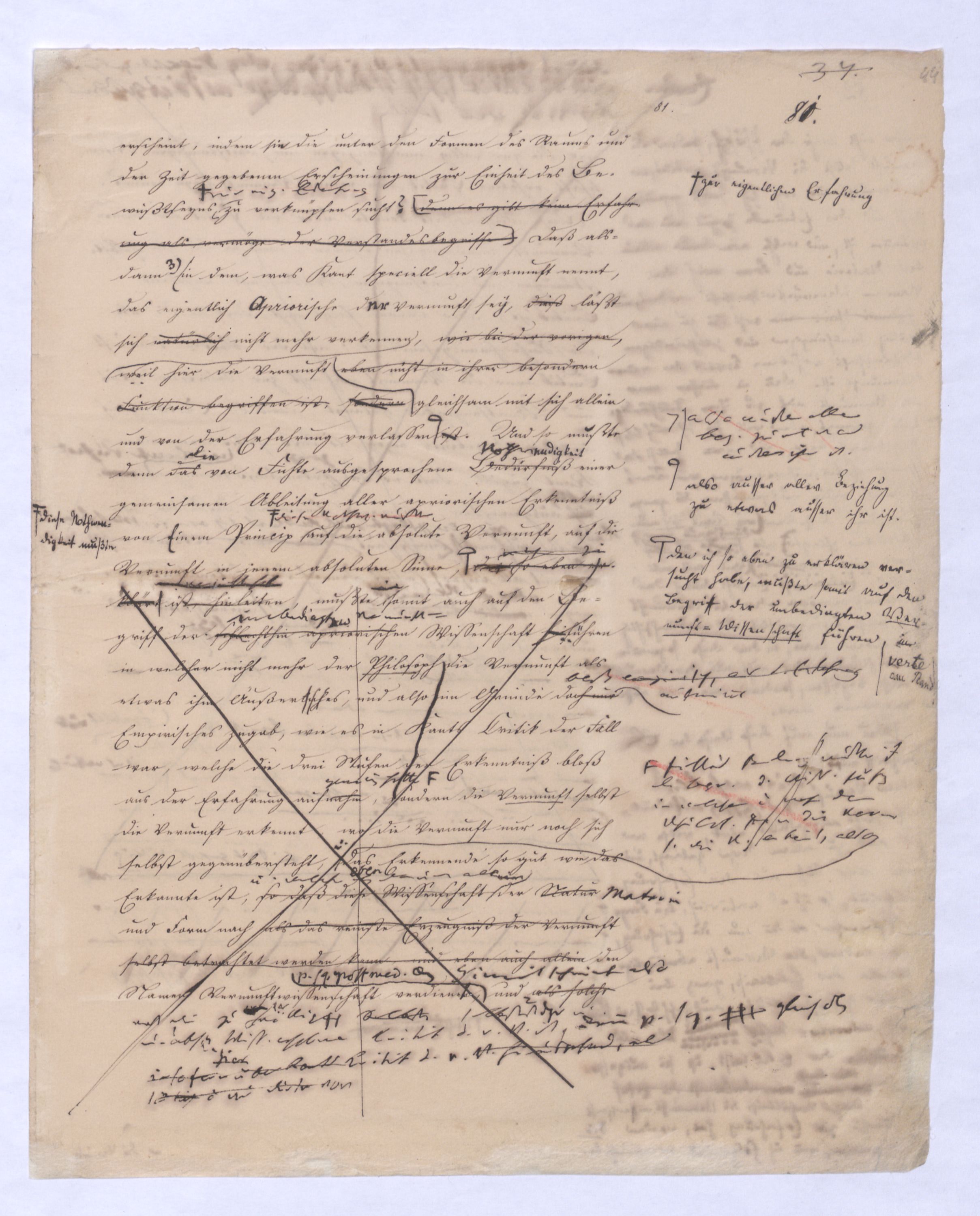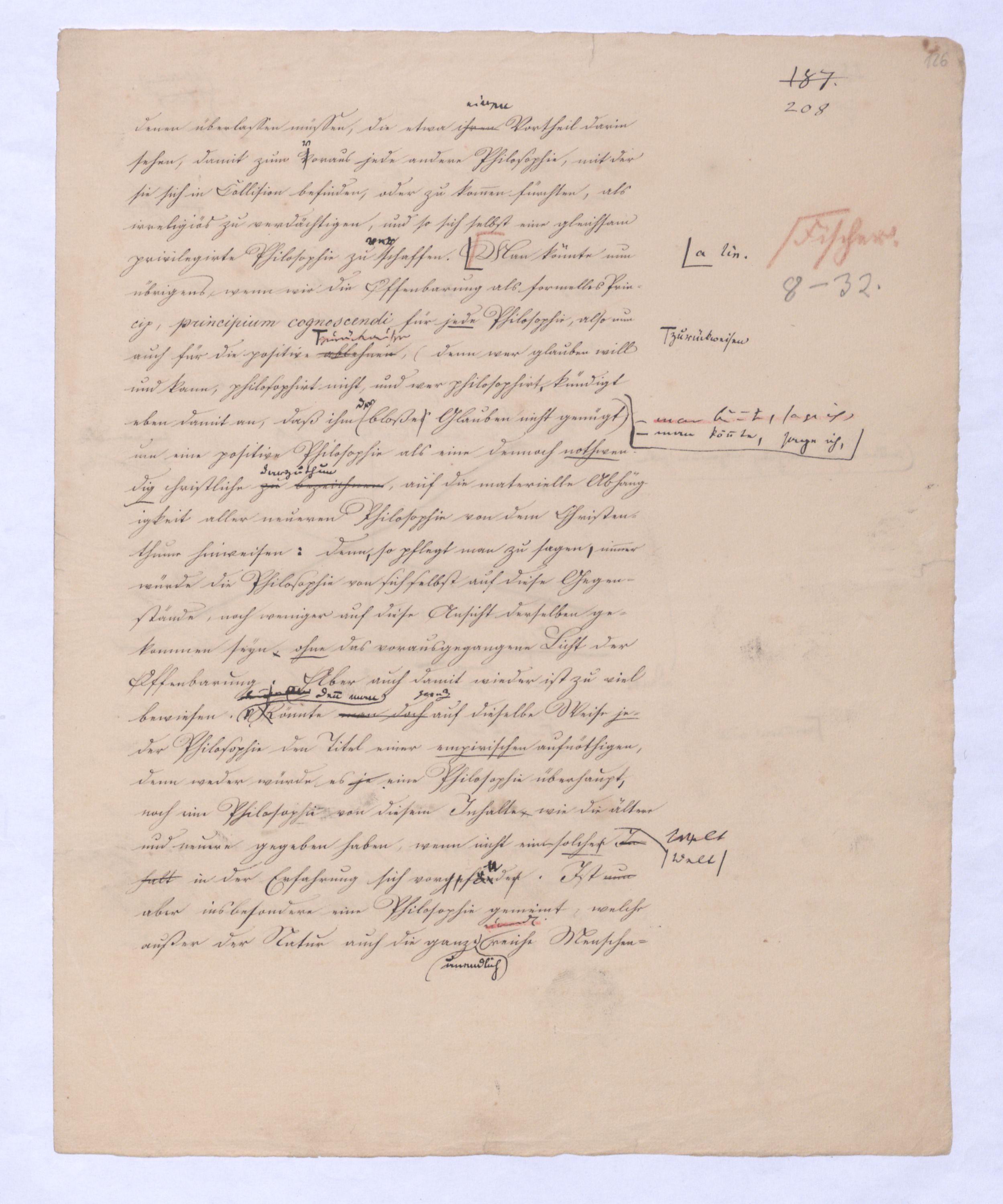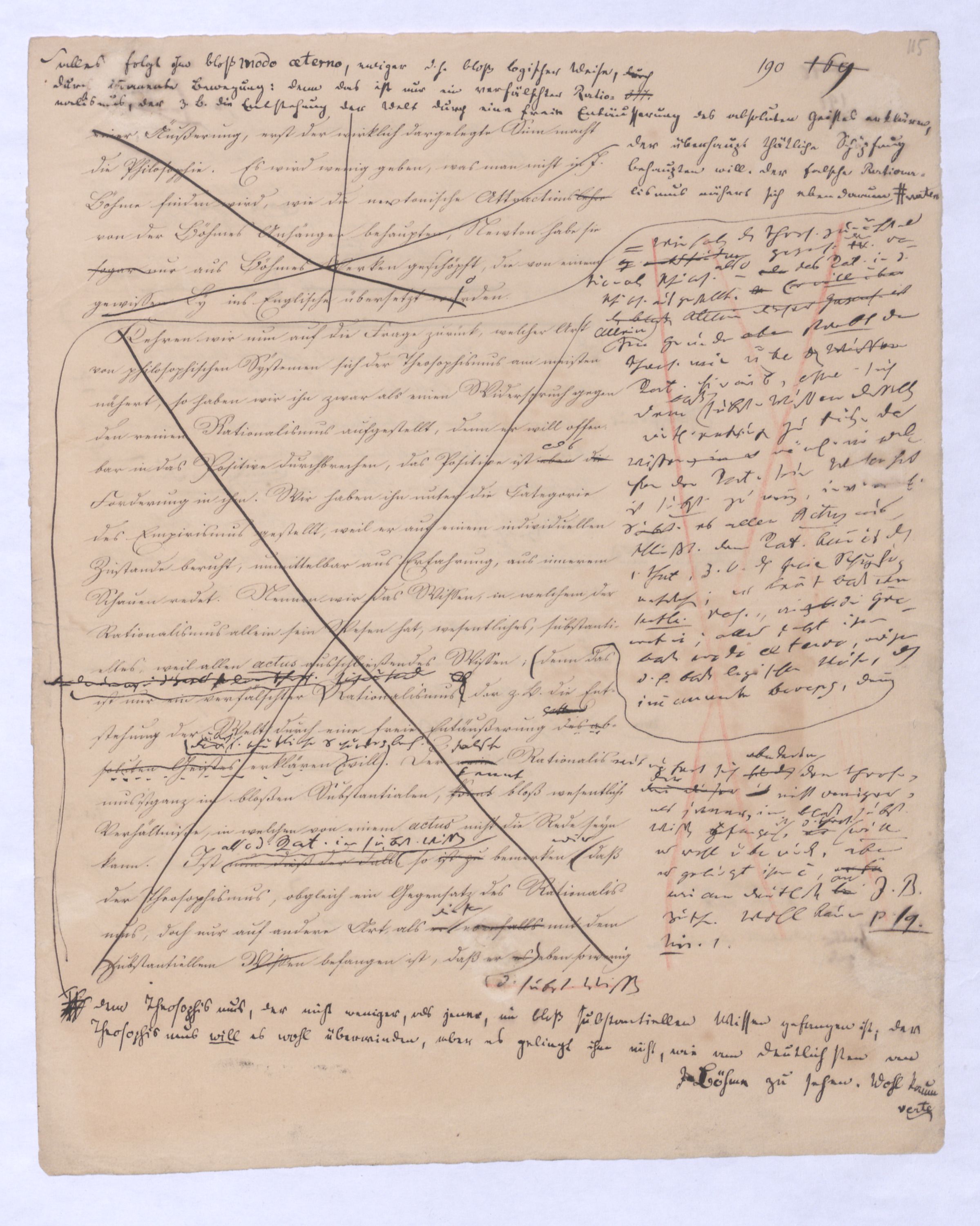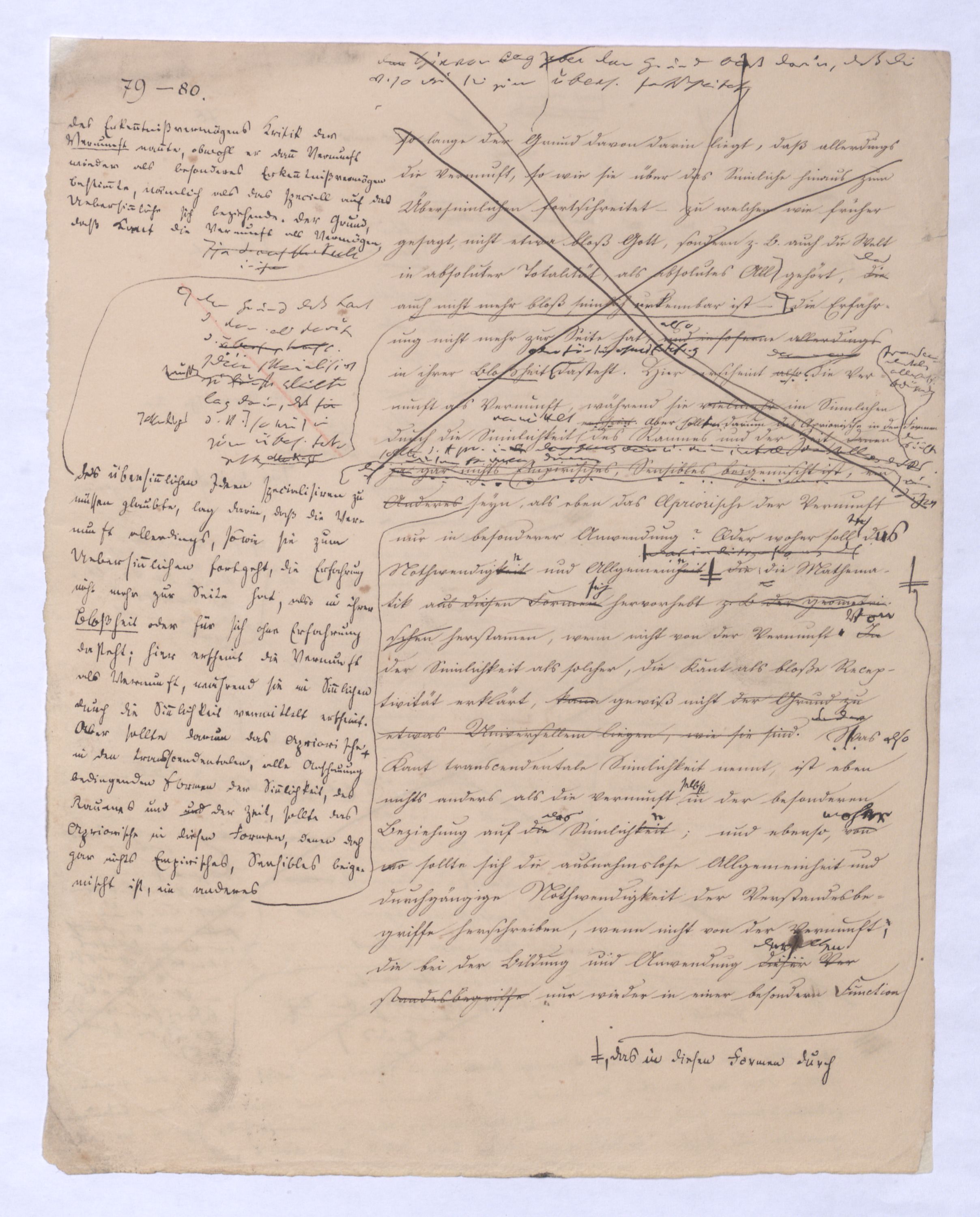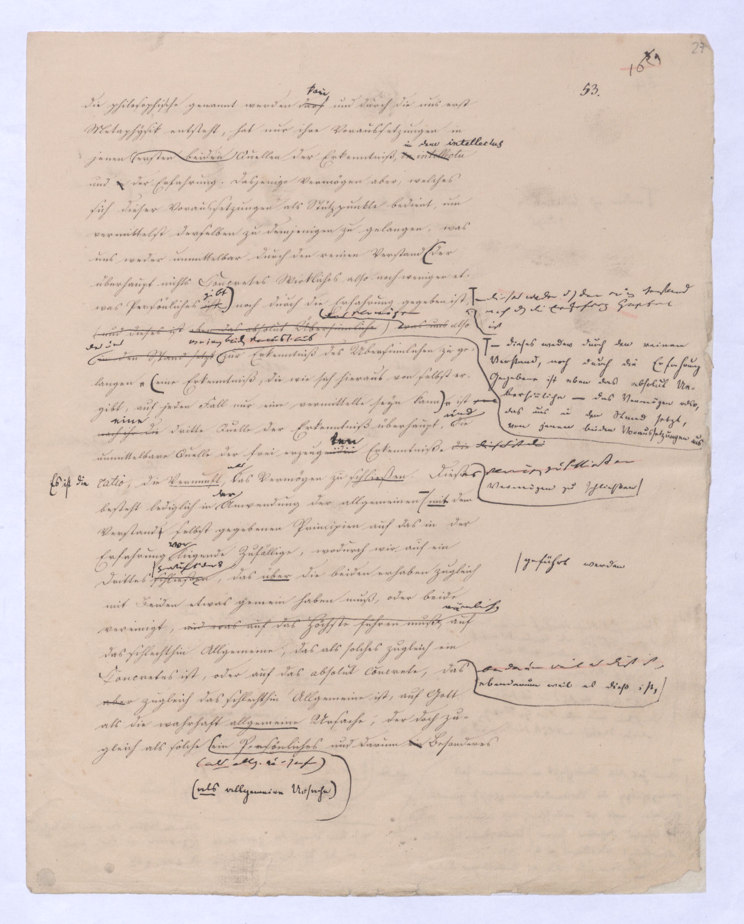 kann gewiß nicht der Grund zu etwas Universellem liegen, wie sie sind. u. den Wvon wowoher sollte sich die ausnahmslose Allgemeinheit und durchgängige Nothwendigkeit der Verstandesbegriffe herschreiben, wenn nicht von der Vernunft? die bei der Bildung und Anwendung dieser Verstandesbegriffederselben nur wieder in einer besonderen Function erscheint, indem sie die unter den Formen des Raums und der Zeit gegebenen Erscheinungen zur Einheit des Bewußtseyns zur eig. Erfahrung zu verknüpfen sucht, denn es gibt keine Erfahrung als vermöge der Verstandesbegriffe.? Daß alsdann in dem, was Kant speciell die Vernunft nennt, das eigentlich apriorische der Vernunft sey, dieß läßt sich natürlich nicht mehr verkennen, wie bei der vorigen, weil hier die Vernunft eben nicht in ihrer besonderen Funktion begriffen ist, sondern gleichsam mit sich allein und von der Erfahrung verlassen ist.also außer aller Bez. zu etwas außer ihr ist. Und so mußte denn dasdie von Fichte ausgesprochene BedürfnißNothw. einer gemeinsamen Ableitung aller apriorischen Erkenntniß von einem Princip diese Nothwend. mußte auf die absolute Vernunft, auf die Vernunft in jenem absoluten Sinne, dern ich so eben zu erklärt ist, hinleitenen versucht habe, mußte eine somit auch auf den Begriff der schlechthin apriorischen unbedingten Vernunft-Wissenschaft hinführen in welcher nicht mehr der Philosoph die Vernunft als etwas ihm Äußerliches, und also im Grunde doch nurbloß empirisch, aus d. Erfahrung aufnimmt Empirisches zugab, wie es in Kants Critik der Fall war, welche die drei Weisen der Erkenntniß bloß aus der Erfahrung aufnehme, sondern die Vernunft selbst die Vernunft erkennt, wo die Vernunft nur noch sich selbst gegenübersteht, u.genommen hatte. Fichtes Forderung mußte auf d. Begr. d. Wiss. führen, in welcher nicht mehr der Philos., sondern die Vern. s. die V. erkennt, also das Erkennende so gut wie das Erkannte ist, so daß diese Wissenschaftu. welche eben darum allein der NaturMaterie und Form nach als das reinste Erzeugniß der Vernunft selbst betrachtet werden kann, und eben auch allein den Namen Vernunftwissenschaft verdienent, und erst die zu ¿¿¿ einer völligen Selbst selbststdgen u. absolutenabsoluten u. selbststdgen Wiss. erhobenen Kritik d. r. V. ist, insofern hier über Kants Kritik d. r. V. hinausgehend, als sie sich nicht wie diese nun. als solcheHiermit scheint alsoerst die zur völlig unabhängigen und selbständigen Wissenschaft erhobene Critik der reinen Vernunft seyn würde.