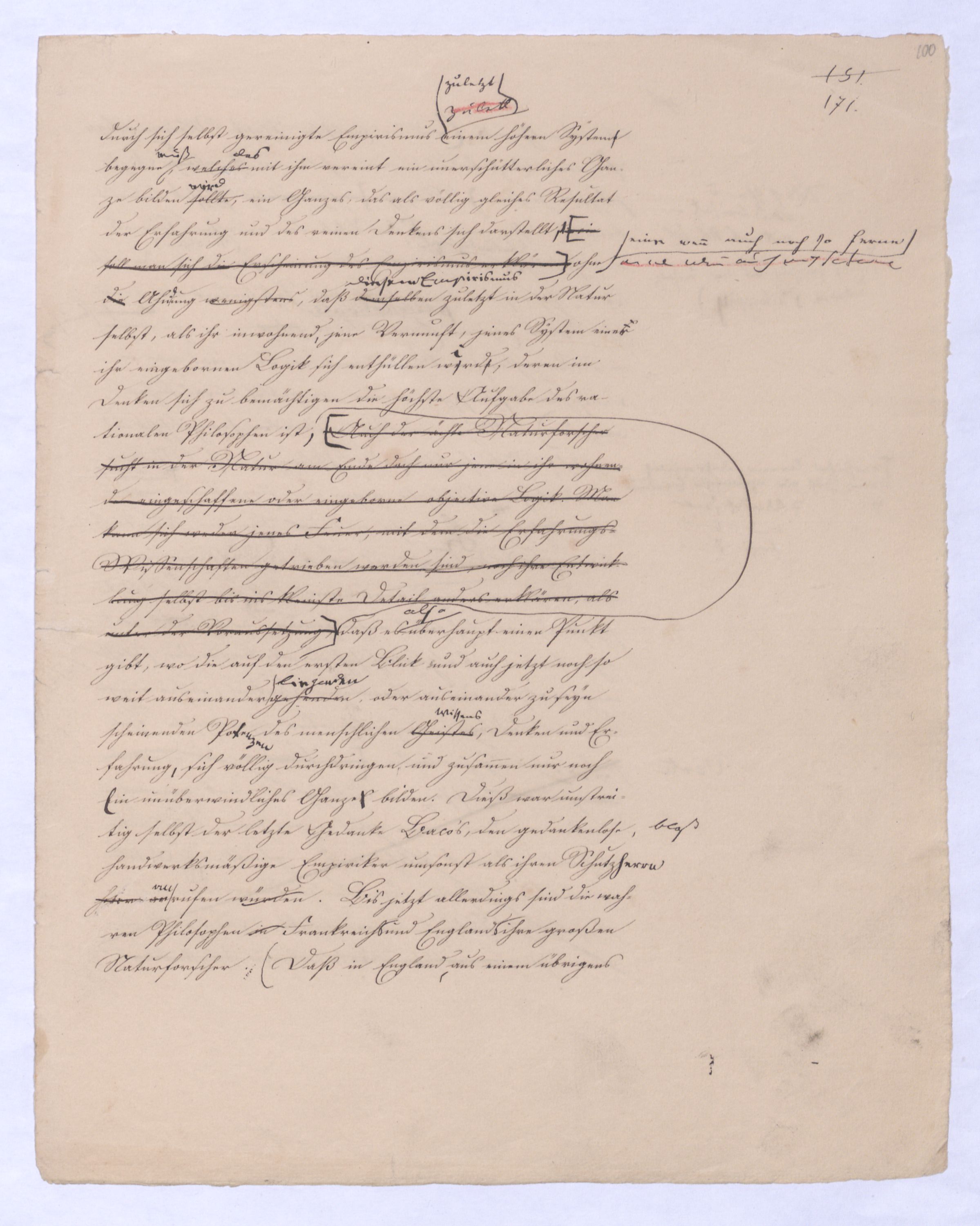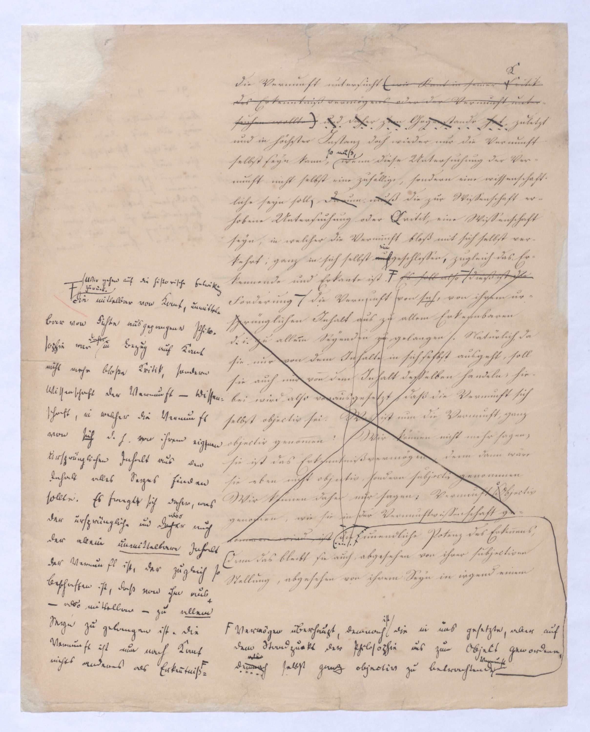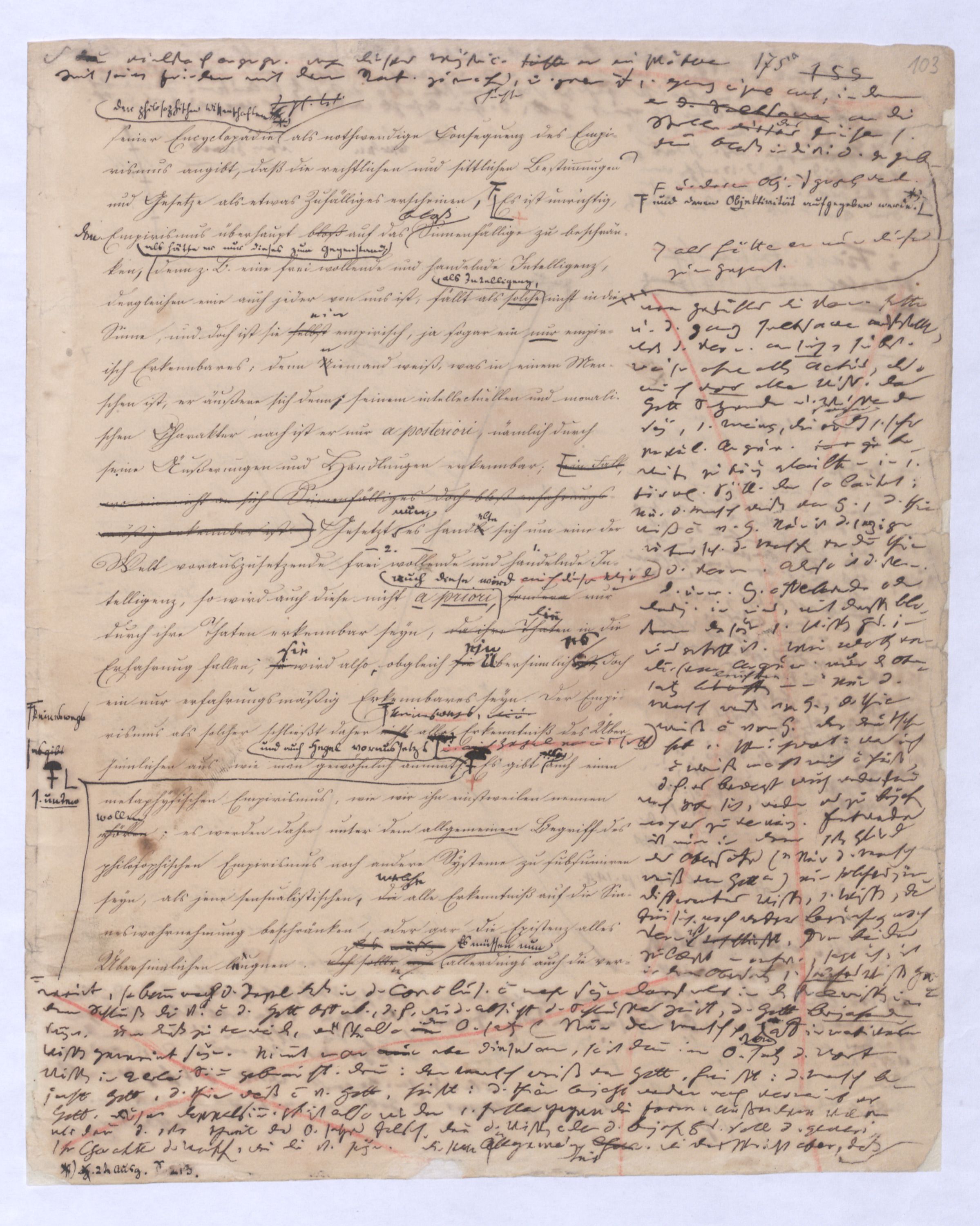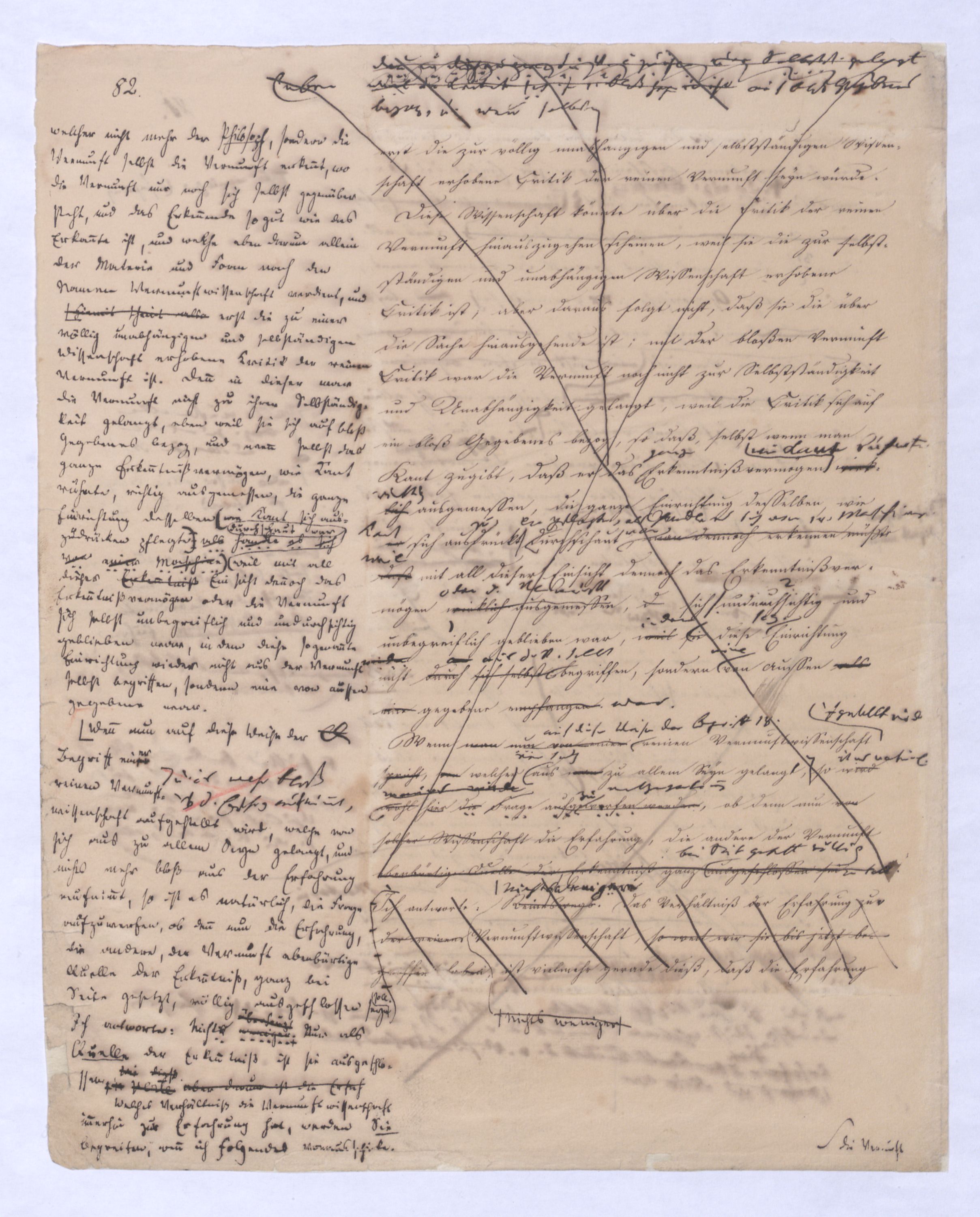 kann gewiß nicht der Grund zu etwas Universellem liegen, wie sie sind. u. den Wvon wowoher sollte sich die ausnahmslose Allgemeinheit und durchgängige Nothwendigkeit der Verstandesbegriffe herschreiben, wenn nicht von der Vernunft? die bei der Bildung und Anwendung dieser Verstandesbegriffederselben nur wieder in einer besonderen Function erscheint, indem sie die unter den Formen des Raums und der Zeit gegebenen Erscheinungen zur Einheit des Bewußtseyns zur eig. Erfahrung zu verknüpfen sucht, denn es gibt keine Erfahrung als vermöge der Verstandesbegriffe.? Daß alsdann in dem, was Kant speciell die Vernunft nennt, das eigentlich apriorische der Vernunft sey, dieß läßt sich natürlich nicht mehr verkennen, wie bei der vorigen, weil hier die Vernunft eben nicht in ihrer besonderen Funktion begriffen ist, sondern gleichsam mit sich allein und von der Erfahrung verlassen ist.also außer aller Bez. zu etwas außer ihr ist. Und so mußte denn dasdie von Fichte ausgesprochene BedürfnißNothw. einer gemeinsamen Ableitung aller apriorischen Erkenntniß von einem Princip diese Nothwend. mußte auf die absolute Vernunft, auf die Vernunft in jenem absoluten Sinne, dern ich so eben zu erklärt ist, hinleitenen versucht habe, mußte eine somit auch auf den Begriff der schlechthin apriorischen unbedingten Vernunft-Wissenschaft hinführen in welcher nicht mehr der Philosoph die Vernunft als etwas ihm Äußerliches, und also im Grunde doch nurbloß empirisch, aus d. Erfahrung aufnimmt Empirisches zugab, wie es in Kants Critik der Fall war, welche die drei Weisen der Erkenntniß bloß aus der Erfahrung aufnehme, sondern die Vernunft selbst die Vernunft erkennt, wo die Vernunft nur noch sich selbst gegenübersteht, u.genommen hatte. Fichtes Forderung mußte auf d. Begr. d. Wiss. führen, in welcher nicht mehr der Philos., sondern die Vern. s. die V. erkennt, also das Erkennende so gut wie das Erkannte ist, so daß diese Wissenschaftu. welche eben darum allein der NaturMaterie und Form nach als das reinste Erzeugniß der Vernunft selbst betrachtet werden kann, und eben auch allein den Namen Vernunftwissenschaft verdienent, und erst die zu ¿¿¿ einer völligen Selbst selbststdgen u. absolutenabsoluten u. selbststdgen Wiss. erhobenen Kritik d. r. V. ist, insofern hier über Kants Kritik d. r. V. hinausgehend, als sie sich nicht wie diese nun. als solcheHiermit scheint alsoerst die zur völlig unabhängigen und selbständigen Wissenschaft erhobene Critik der reinen Vernunft seyn würde.
