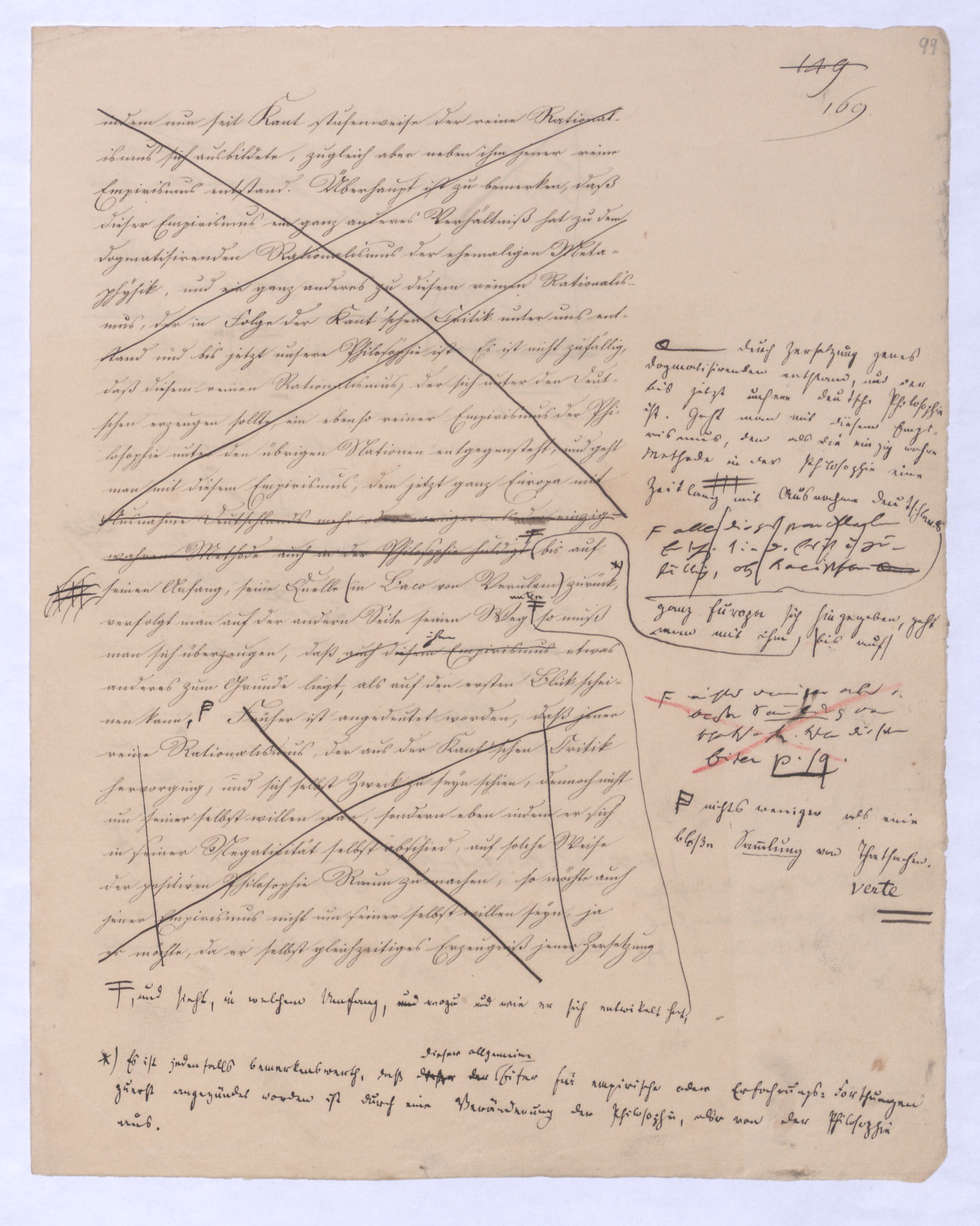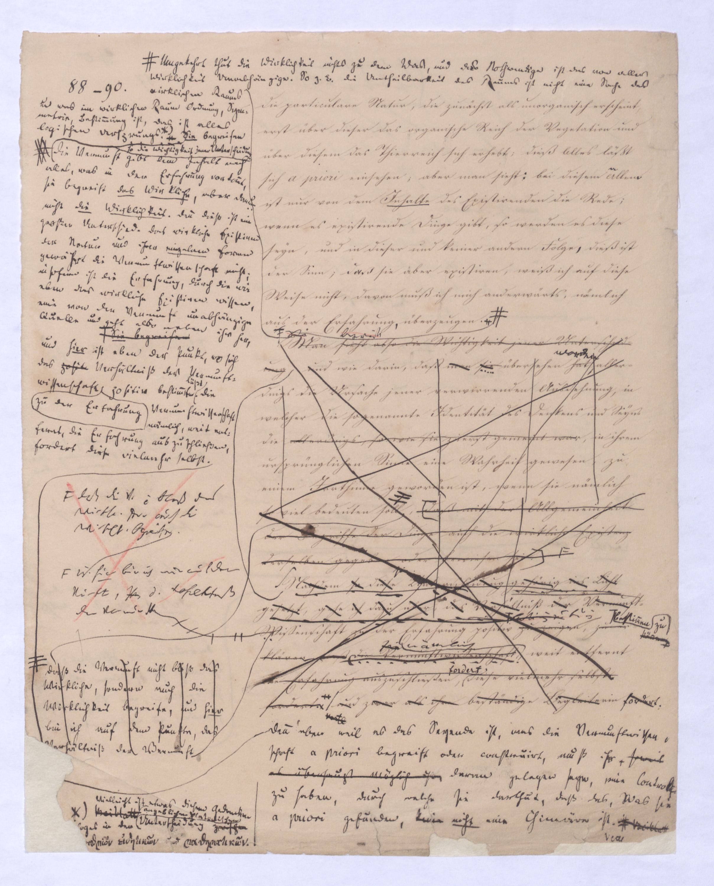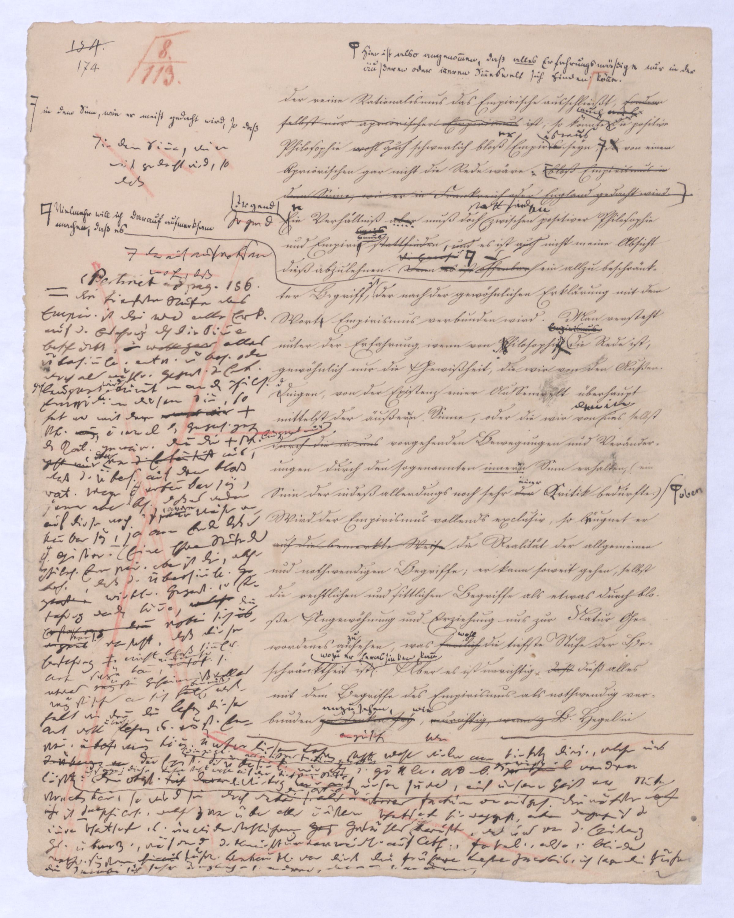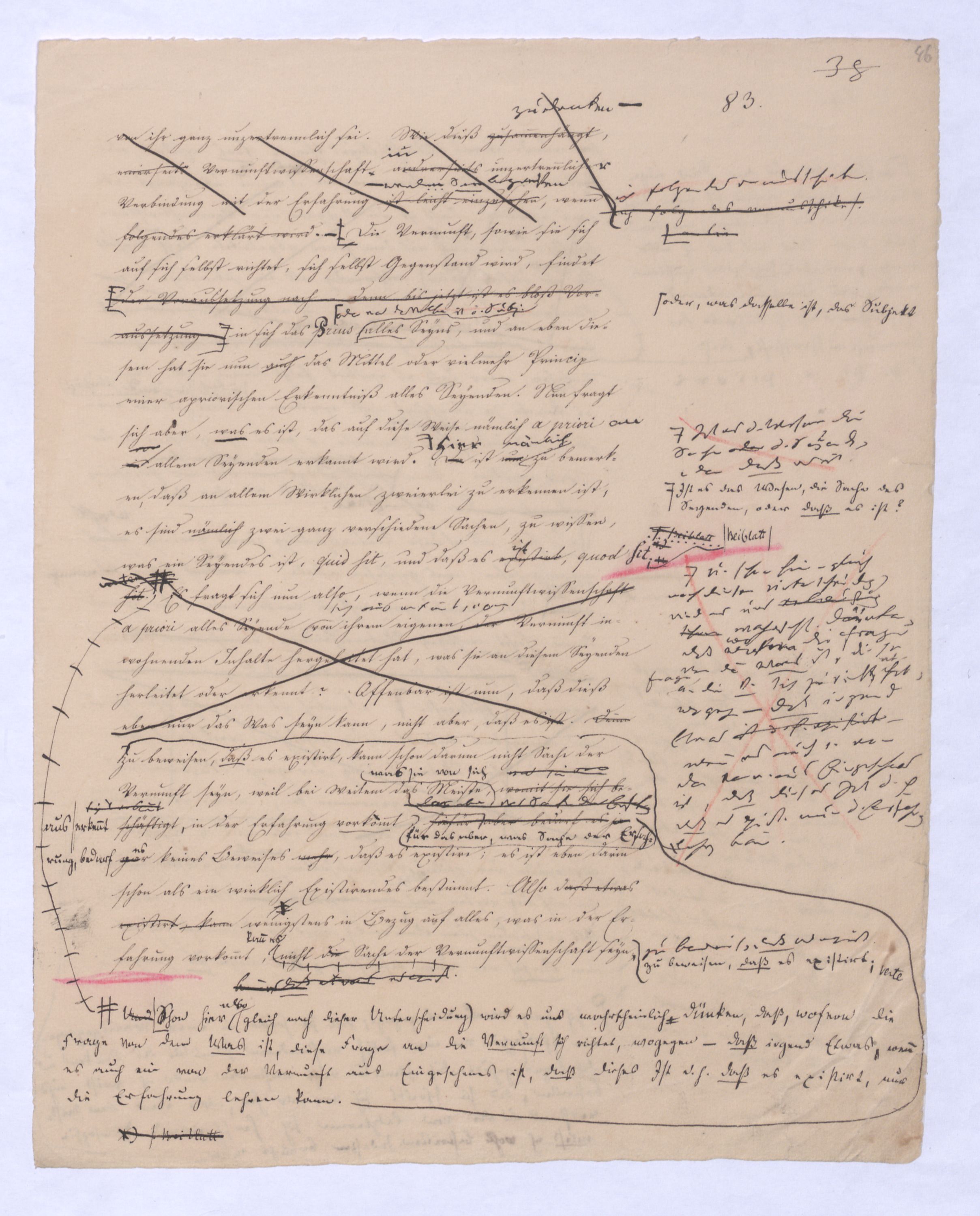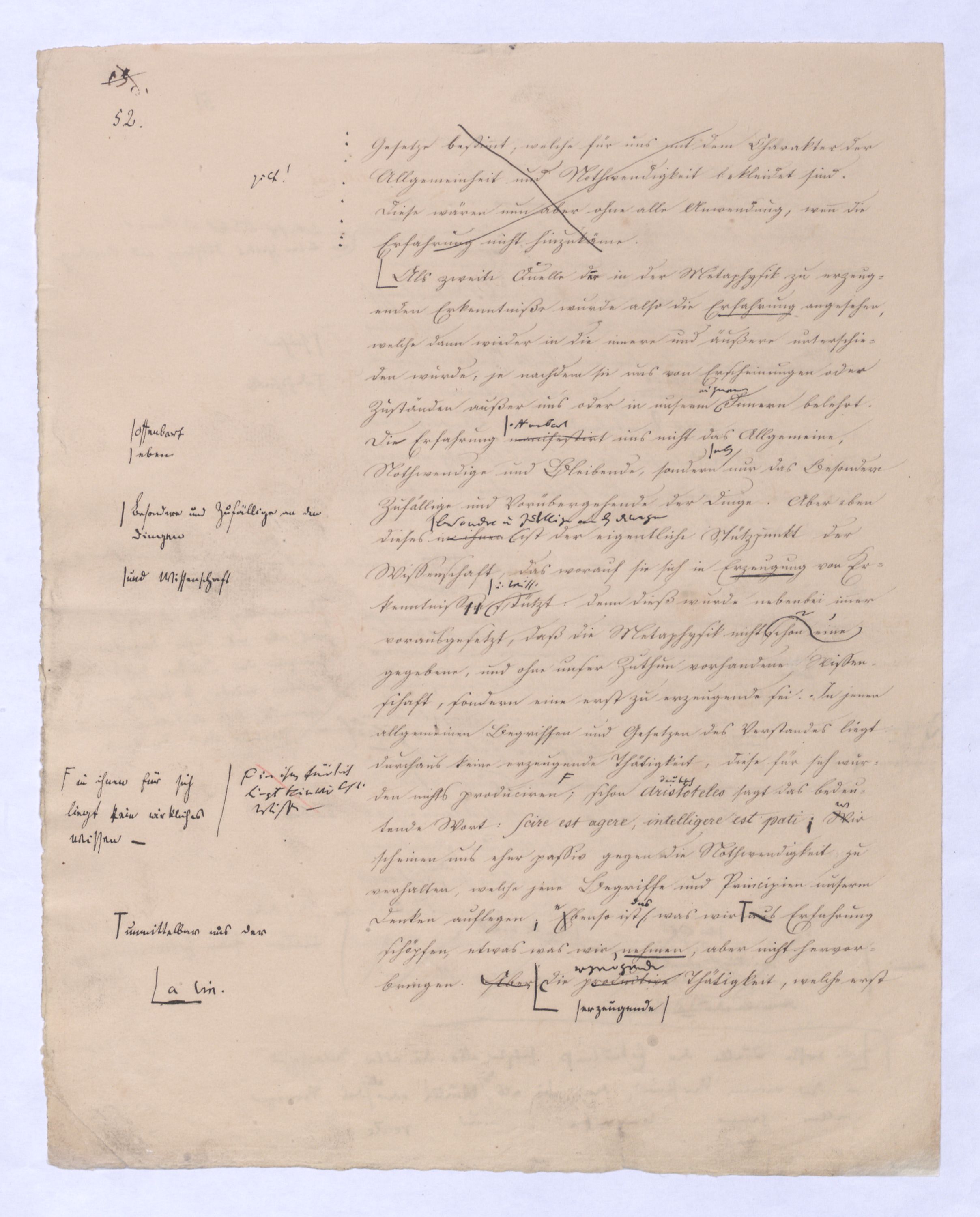 kann gewiß nicht der Grund zu etwas Universellem liegen, wie sie sind. u. den Wvon wowoher sollte sich die ausnahmslose Allgemeinheit und durchgängige Nothwendigkeit der Verstandesbegriffe herschreiben, wenn nicht von der Vernunft? die bei der Bildung und Anwendung dieser Verstandesbegriffederselben nur wieder in einer besonderen Function erscheint, indem sie die unter den Formen des Raums und der Zeit gegebenen Erscheinungen zur Einheit des Bewußtseyns zur eig. Erfahrung zu verknüpfen sucht, denn es gibt keine Erfahrung als vermöge der Verstandesbegriffe.? Daß alsdann in dem, was Kant speciell die Vernunft nennt, das eigentlich apriorische der Vernunft sey, dieß läßt sich natürlich nicht mehr verkennen, wie bei der vorigen, weil hier die Vernunft eben nicht in ihrer besonderen Funktion begriffen ist, sondern gleichsam mit sich allein und von der Erfahrung verlassen ist.also außer aller Bez. zu etwas außer ihr ist. Und so mußte denn dasdie von Fichte ausgesprochene BedürfnißNothw. einer gemeinsamen Ableitung aller apriorischen Erkenntniß von einem Princip diese Nothwend. mußte auf die absolute Vernunft, auf die Vernunft in jenem absoluten Sinne, dern ich so eben zu erklärt ist, hinleitenen versucht habe, mußte eine somit auch auf den Begriff der schlechthin apriorischen unbedingten Vernunft-Wissenschaft hinführen in welcher nicht mehr der Philosoph die Vernunft als etwas ihm Äußerliches, und also im Grunde doch nurbloß empirisch, aus d. Erfahrung aufnimmt Empirisches zugab, wie es in Kants Critik der Fall war, welche die drei Weisen der Erkenntniß bloß aus der Erfahrung aufnehme, sondern die Vernunft selbst die Vernunft erkennt, wo die Vernunft nur noch sich selbst gegenübersteht, u.genommen hatte. Fichtes Forderung mußte auf d. Begr. d. Wiss. führen, in welcher nicht mehr der Philos., sondern die Vern. s. die V. erkennt, also das Erkennende so gut wie das Erkannte ist, so daß diese Wissenschaftu. welche eben darum allein der NaturMaterie und Form nach als das reinste Erzeugniß der Vernunft selbst betrachtet werden kann, und eben auch allein den Namen Vernunftwissenschaft verdienent, und erst die zu ¿¿¿ einer völligen Selbst selbststdgen u. absolutenabsoluten u. selbststdgen Wiss. erhobenen Kritik d. r. V. ist, insofern hier über Kants Kritik d. r. V. hinausgehend, als sie sich nicht wie diese nun. als solcheHiermit scheint alsoerst die zur völlig unabhängigen und selbständigen Wissenschaft erhobene Critik der reinen Vernunft seyn würde.