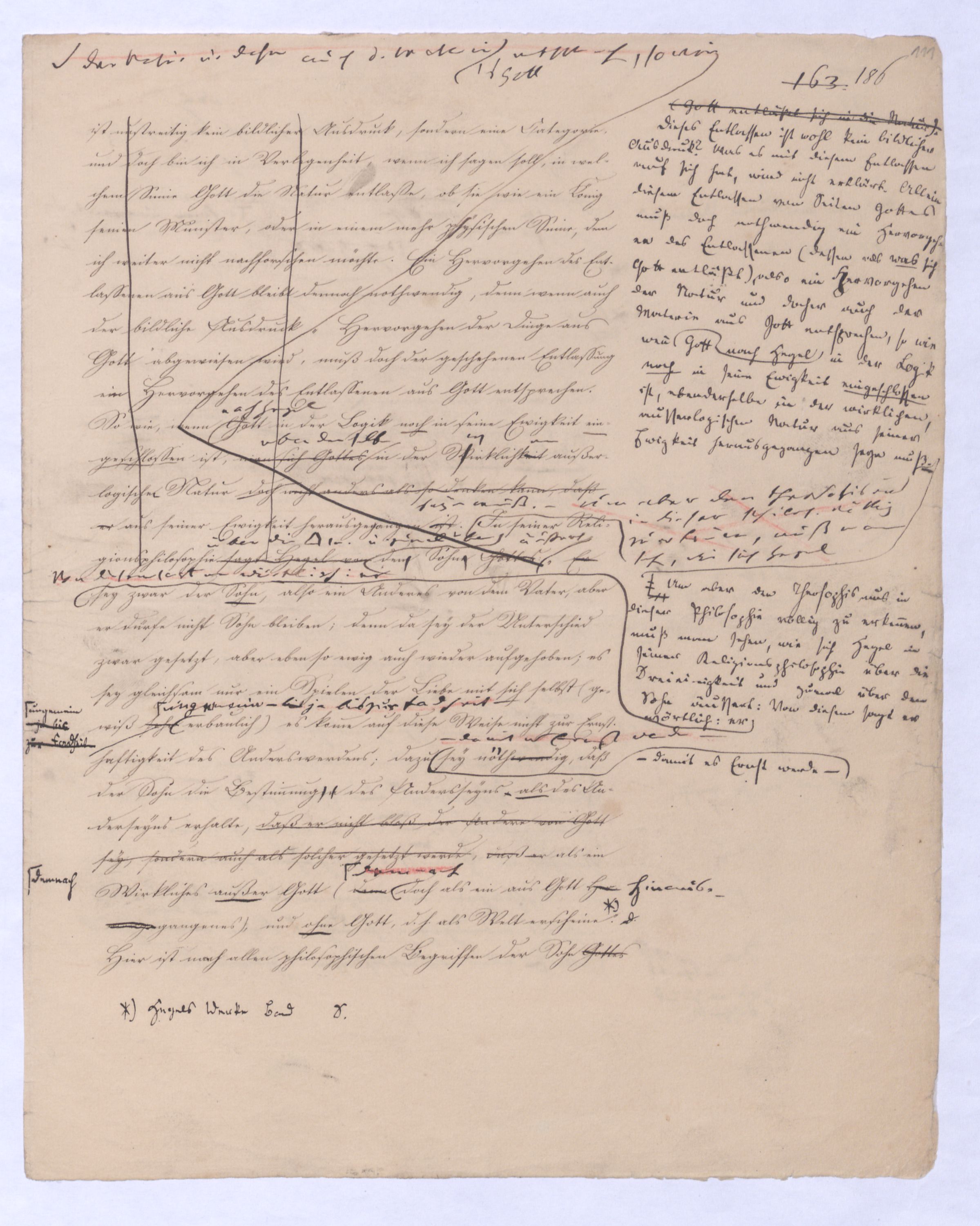 , dieß ist unstrittig kein bildlicher Ausdruck, sondern eine Categorie und doch bin ich in Verlegenheit, wenn ich sagen soll, in welchem Sinne Gott die Natur entlassen, ob sie wie ein König seinen Meister, oder in einem mehr physischen Sinne, dem ich weiter nicht nachforschen möchte. Ein Hervorgehen des Entlassenen aus Gott bleibt dennoch nothwendig, denn wenn auch der bildliche Ausdruck, Hervorgehen der Dinge aus Gott abgewiesen wird, muß doch der geschehenen Entlassung ein Hervorgehen des Entschlusses aus Gott entsprechen. So wie, (Gott entläßt sich in d. Natur) – dieses Entlassen ist wohl kein bildl. Ausdruck was es mit diesem Entlassen auf sich hat wird freil. nicht erklärt. Allein diesem Entlassen von Seiten Gs. muß doch nothw. ein Hervorgehen Gottes oder der Natur also auch d. Materie aus Gott entsprechen des Entlassenen (dessen als was sich Gott entläßt) also ein Hervorgehen der Natur u. daher auch d. Materie aus Gott entsprechen, so wie wenn nach Hegel Gott in der Logik noch in seine Ewigkeit eingeschlossen ist, man sich Gotteseben derselbe in der Wwirklichkeiten außerlogischen Natur doch nicht anders als so denken kann, daß er aus seiner Ewigkeit herausgegangen istseyn muß. – Um aber den Theosophismus in dieser Philos. völlig zu erkennen, muß man sehen, wie sich Hegel Iin seiner Religionsphilosophie sagt Hegel vonüber die Dreieinigkeit u. zumal über demn Sohne Gottes äußert: Von diesem sagt er ausdrücklich: er sey zwar der Sohn, also ein Anderes von dem Vater, aber er dürfe nicht Sohn bleiben; denn da sey der Unterschied zwar gesetzt, aber eben so ewig auch wieder aufgehoben; es sey gleichsam nur ein Spielen der Liebe mit sich selbst (gewiß