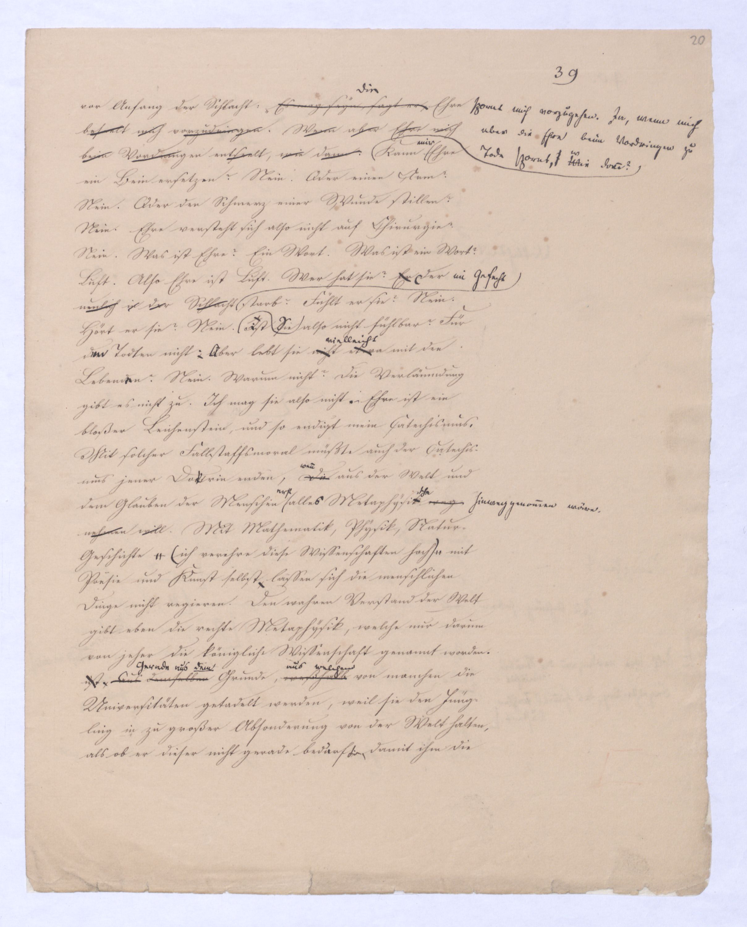 Mit solcher Fallstaffsmoral müßte auch der Catechismus jener Doctrin enden, die aus der Welt und dem Glauben der Menschen alle Metaphysik wegnehmen will. Mit Mathematik, Physik, Naturgeschichte – ich verehre diese Wissenschaften hoch – mit Poesie und Kunst selbst, lassen sich die menschlichen Dinge nicht regieren. Den wahren Verstand der Welt gibt eben die rechte Metaphysik, welche nur darum von jeher die königliche Wissenschaft genannt worden ist, aus demselben Grunde, weßhalb von manchen die Universitäten getadelt werden, weil sie den Jüngling in zu großer Absonderung von der Welt halten, als ob er dieser nicht gerade bedarf;ürfte, damit ihm die ruhige und ungestörte Entwicklung und Ausbildung seiner geistigen Kraft bewahrt werde, sind unsere Universitäten wohl berechtigte, erhaltenswerthe ruhmwürdige Anstalten. In den Weihestunden dieser glücklichen Zeit werden die grossen Entschlüsse gefaßt, die Ideen empfangen, die nachher in der Welt hervortreten sollenSagen Sie Ihm, daß er für die Träume seiner Jugend Achtung