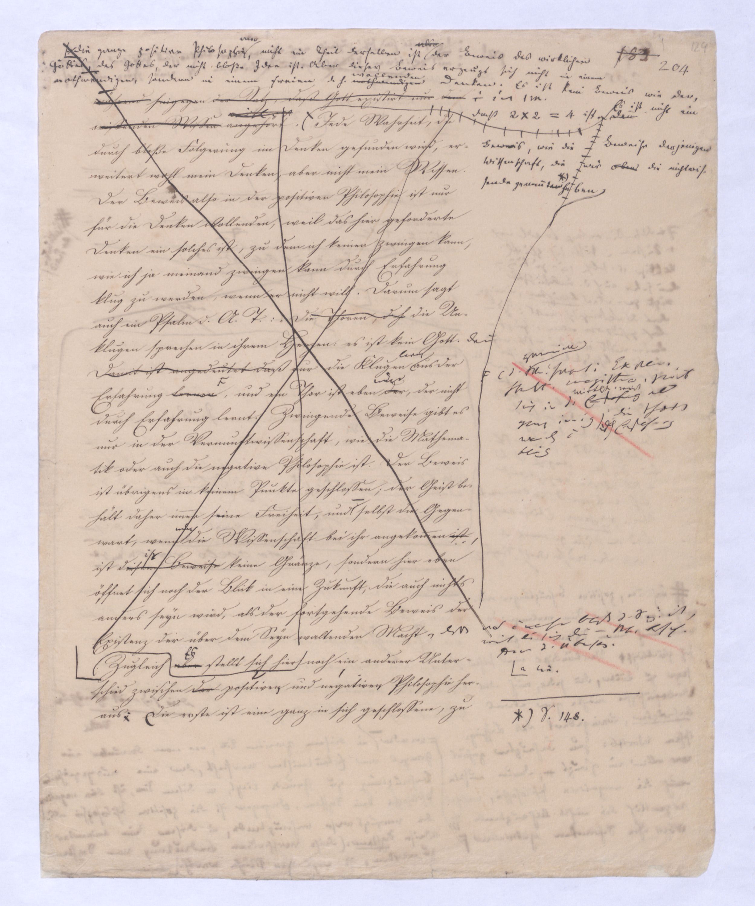 Der Beweis, von dem ich sagte, daß er eigentlich dDie ganze positive Philosophie nicht ein Theil derselben ist, ist nur Beweis für den Wollenden weil ererst d. Beweis des wirklichen Gs., des Gs. der nicht bloße Idee ist. Aber dieser Beweis ist erzeugt sich nicht in einem nothwendigesn, sondern in einem freiesn, d. h. eben wollendesn Denken vorausgesetzt. Ich erinnere mich aus meiner Jugend; daß von meinem Lehrer der Philosophie in einer schwäbischen Abtei erzählt wurde, der sich von seinem dogmatisirenden Eifer soweit hatte hinreissen lassen, seinen Schülern zu sagen,Es ist in so fern auch nur dann d. Wollende. Es ist kein Beweis wie der daß 2 ⋅ 2 = 4 ist, wie in Ich erinnere mich, daß jemand der beh. hatte das Daseyn Gottes sey so gewiß, als daß 2 x 2 = 4 sey; dafür erhielt er von seinem Prälaten einen Verweisu. dieses ¿¿¿ ihm von einer erhielt, der Moral-Behörde ver verwiesen wurdeAber wenn ich zwischen beiden zu entscheiden hätte, würde ich mich doch für den Letzteren entscheiden. Er hatte im Grunde das Gefühl, daß die sehr wohlfeile Wahrheit 2 x 2 = 4 ist, dem nicht wissenden Wissen angehört, daß ich damit schlechterdings nichtsNun will ich zwar die Genauigk. des Ausdrucks Der sich freil. nicht geradeeben aufs Genaueste ausged. Aber was er sagen wollte, war daß der, welcher d. Exist. Gs. derjenige bei weitem wissender sich verhält, der gewiß weiß, welcher gewiß ist weiß, daß 2 ⋅ 2 = 4 ist. Denn d. Wissen d. Letztern ist eig. nur ein nicht wiss. Wissen, ein Wissen mit dem icher eig. nichts weiß, nichts Neues erfaährent, nichts näml. was über msein bloßes Denken hinausgehtginge während hingegen der Satz, daß Gott existirt nur demi in einem wissenden Wissen angehörtmögl. ist. Jede Wahrheit, die durch bloße Folgerung im Denken gefunden wird, erweitert wohl mein Denken, aber nicht mein Wissen. Der Beweis also in der positiven Philosophie ist nur für die Denken Wollenden, weil das hier geforderte Denken ein solches ist, zu dem ich keinen zwingen kann, wie ich ja niemand zwingen kann durch Erfahrung klug zu werden, wenn er nicht will. Darum auch im Psalm d. A T.: »
