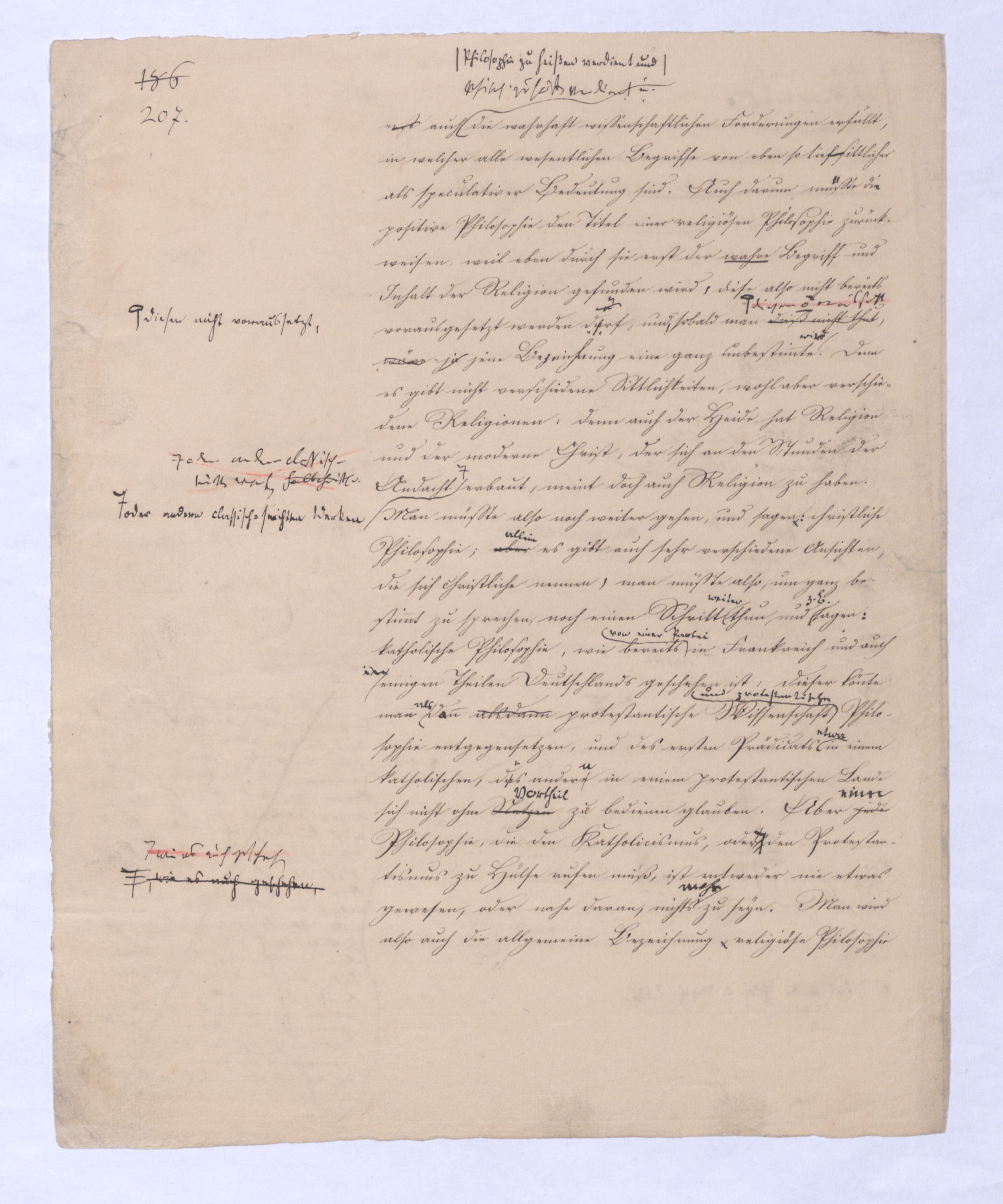 Obgleich hierferner bereits so viel erhellt, daß diese Philosophie den Inhalt der Religion als ihren eignen hat, wird sie doch ablehnen, sich s. religiöse Philosophie zu großes Unrecht geschehen, wenn sie gleich die Religion, die sie ohnedieß nur als Religion desr absoluten Subjektsivität, nicht als objektive geworden, alsoder gar als als geoffenbarte enthalten kann, außer sich, praeter se, als etwas von sich bereits Verschiedenes betrachtet, wie dieß früher auseinandergesetzt worden ist.. In ihrem Ende, wo die (-) Ph. Gott als bloße Idee hat, kann sie sich allerdings noch umsehen nach den verschiedenen Weisen Möglichkeiten, Gott dem Bew. existent zu machen: Hinter diesen erkennt sie findet sie auch die Religion, aber als etwas schon außer ihr stehendes, u. zugl. als etwas bloß Subj., indem näml. d. Subj. bloß durch relative Vernichtung sr s. durch oder Verleugnung sr. s. – sich Gott existent macht. Am Ende der - Ph. stehen die 3. Ideen: – Rel., Kunst, Philos. (letztere ist die +) die sie alle 3 außer sich, als von sich verschieden setzt, denen gemeinsch. ist, daß sie d. Göttl. als ein Wirkliches zu haben u. erreichen wollen. Die rat. Philos. setzt denmnach also d. Rel. außer sich, darum aber ist sie nicht die irrel. zu nennen. Gibt es eine wirklich irreligiöse Lehre, so sollte diese nicht eine irreligiöse Philosophie genannt werden damit ist wo ihr zuviel eingeräumt ist, Sie ist sowenig eine Philosophie, als eine ihrem tiefsten Grunde nach unsittliche Lehre eine Philosophie seyn kann, da vielmehr, wie oft bemerkt worden, nurerst diejenige Philosophie erst auch Philos. zu heißen verdient u. die wahrhaft wissenschaftlichen Forderungen erfüllt, in welcher alle wesentlichen Begriffe von ebenso tief sittlicher als speculativer Bedeutung sind. Auch darum musste die positive Philosophie den Titel einer religiösen Philosophie zurückweisen, weil eben durch sie erst der wahre Begriff und Inhalt der Religion gefunden wird, diese also nicht bereits vorausgesetzt werden daürf, und sobald man dieß nicht thatdiesen nicht voraussetzt, wäre ja jene Bezeichnung eine ganz unbestimmte wird. Denn es gibt nicht verschiedene Sittlichkeiten, wohl aber verschiedene Religionen: denn auch der Heide hat Religion und der moderne Christ, der sich an den Stunden der Andacht oder andern classisch-seichten Werken halbchristl. erbaut, meint doch auch Religion zu haben. Man müßte also noch weiter gehen und sagen, christliche Philosophie; aber es gibt auch sehr verschiedene Ansichten, die sich christliche nennen, man müßte also, um ganz bestimmt zu sprechen, noch einen Schritt thun und sagen katholische Philosophie, wie bereits in Frankreich und auch in einigen Theilen Deutschlands geschehen ist; dieser könnte man denn alsdann protestantische Wissenschaft Philosophie entgegensetzen, und des ersten Prädicats in einem katholischen, das andere in einem protestantischen Lande sich nicht ohne Nutzen zu bedienen glauben. Aber jede Philosophie, die den Katholicismus, oder wie es auch geschehen den Protestantismus zu Hülfe rufen muß, ist entweder nie etwas gewesen, oder nahe daran nichts zu seyn. Man wird also auch die allgemeine Bezeichnung, religiöse Philosophie denen überlassen müssen, die etwa ihreneinen Vortheil darin sehen, damit zum Voraus jede andere Philosophie, mit der sie sich in Collision befinden, oder zu kommen fürchten, als irreligiös zu verdächtigen, und so sich selbst eine gleichsam privilegirte Philosophie zu verschaffen. Man könnte nun übrigens, wenn wir die Offenbarung als formelles Princip, principium cognoscendi für jede Philosophie, also nun auch für die positive ablehnenzurückweisen, (denn wer glauben will und kann, philosophirt nicht, und wer philosophirt, kündigt eben damit an, daß ihm bloßes Glauben nicht genügt) – man könnte, sage ich, um eine positive Philosophie als eine dennoch nothwendig christliche zu bezeichnen, auf die materielle Abhängigkeit aller neueren Philosophie von dem Christenthum hinweisenKDenn man könnte man doch auf dieselbe Weise jeder Philosophie den Titel einer empirischen aufnöthigen, denn weder würde es ja eine Philosophie überhaupt, noch eine Philosophie von diesem Inhalte, wie die ältere und neuere gegeben haben, wenn nicht eine solcher Inhalt Welt in der Erfahrung sich vorgefuänden. Ist nun aber insbesondere eine Philosophie gemeint, welche außer der Natur auch die ganze unendl. reiche Menschenwelt, also namentlich auch die große historische Erfahrungscheinung des Christenthums in ihrer Entwicklung, und als ein Glied derselben mitbegreifen will, so versteht sich ja schon ohne dieß, daß eine solche Philosophie, schon indem sie derihren Grund legt, allerdings auch auf das Christenthum gedacht haben muß, aber auch so enthält die Bemerkung nichts Besonderes und speciell auf das Christenthum sich Beziehendes. Denn wer immer ein Ganzes von Philosophie beabsichtigt und es wirklich zu Ende zu führen hoffen kann, muß weit hinaus denken, muß vorher schon alles erwogen alles in sne. Berechnung aufgenommen haben. Wie er nun allerdings nicht im Stande wäreseyn würde in seinem ersten Begriffe auch schon den Grund zu einem künftigen Begreifen der Natur zu legen, wenn nicht wirklich eine Natur existirte, so könnte eine Philosophie allerdings nicht das Christenthum nicht erklären, wenn nicht ein wirkliches Christentum in der Welt wäre, und es keine Kenntniß von demselben hätte. Denkt man aber bei dieserjener Rede, welche die Philosophie an ihre historische und materielle Abhängigkeit vom Christenthum verweisterinnern will, an eine Philosophie, die das Christenthum ganz außer sich liegen läßt, und ist der Sinn der Rede dieser, selbst eine solche Philosophie würde nicht einmal soweit gekommen seyn, wenn sie nicht das Christenthum zu ihrer historischen Voraussetzung gehabt hätte, so ist dieß zwar etwas Wahres, aber zugleich etwas so Allgemeines, daß es wieder alle besondere Beziehung verliert. Denn wo würde