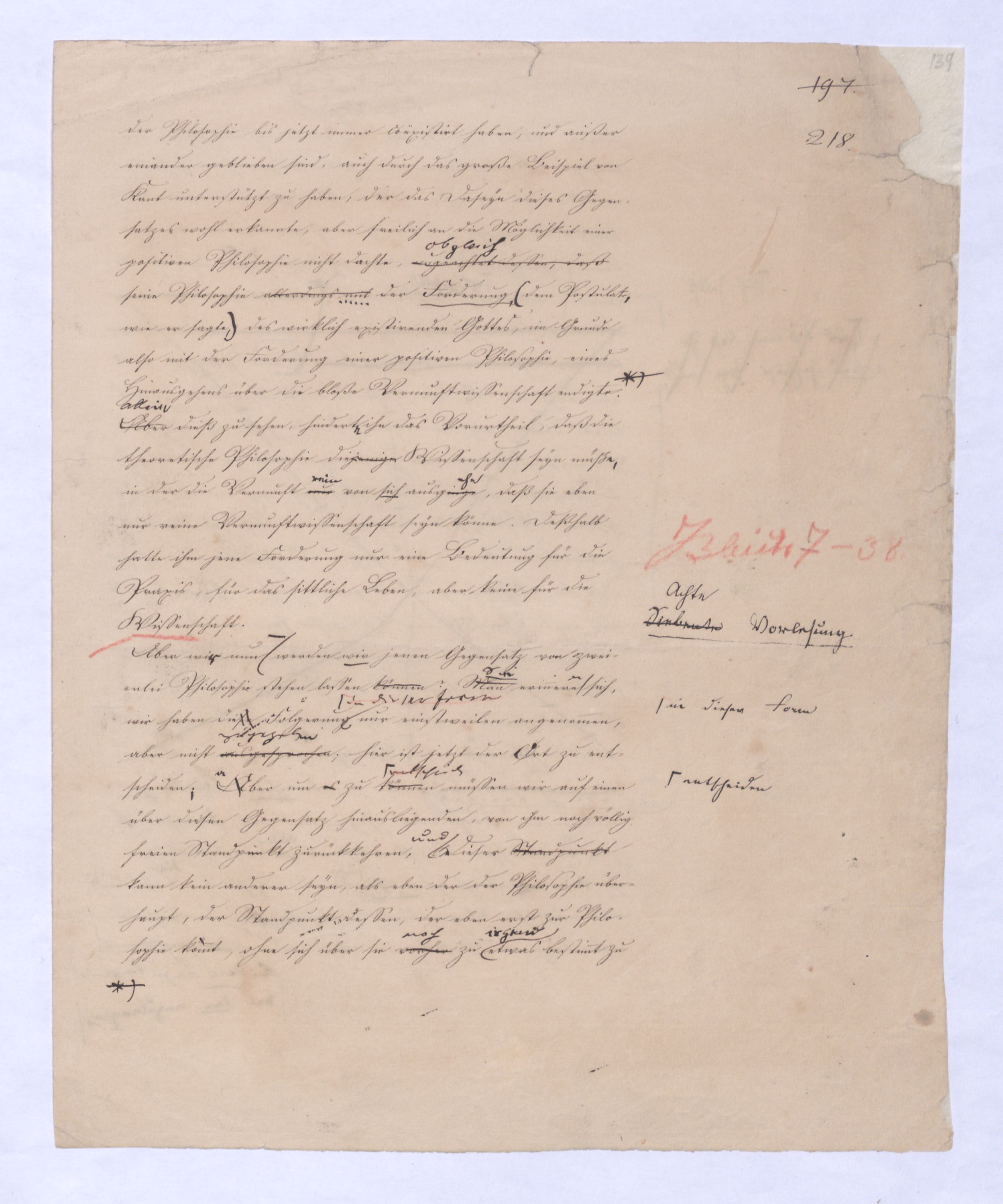 Theoretisch war mit diesem negativen Resultat im Grunde alle wirkliche Religion aufgehoben: denn alle wirkliche Religion kann sich nur auf den wirklichen Gott und zwar auf diesen nur als Herrn der Wirklichkeit beziehen denn ein Wesen, das dieß nicht ist, kann nie Gegenstand einer Religion, oder auch nuru. nicht einmal eines Aberglaubens werden. Dieß konnte aber nach dem negativen Resultat der Kant’schen Critik nie der Fall seyn: denn wenn Gott als Herr der Wirklichkeit erkennbar war, so gab es eine Wissenschaft für die er Princip war, in der die Wirklichkeit von ihm abgeleitet werden konnte, in der er also Princip war; aber dieß leugnete Kant. – Das negative Resultat seiner Critik war eben, daß er nie Princip seyn kann. Noch weniger freilich blieb ein mögliches Verhältniß der natürlichen Theologie zur geoffenbarten Religion übrig. Die geoff. Rel. setzt den sich offenb., also den wirkenden u. wirkl. G. voraus. Von dem als existirend bewiesenen Gott, den die alte Metaphysik zu haben glaubte, war ein Ubergang zu dem sich offenbarenden möglich; von dem Gott aber der nur die höchste Vernunftidee ist, könnte nur in einem höchst uneigentlichen Sinne gesagt werden, daß er sich dem Bewußtseyn offenbare, in einem ganz anderm als in welchem der Offenbarungsgläubige von Offenbarung spricht. Indem nun aber Kant konnte nun aber die alte Metaphysik nicht zerstörente, ohne zugleich Urheber einer ganz neuen Wissenschaft zu werden, da er nemlich unter dem bescheidenen Namen einer Critik der reinen Vernunft eine vollständige und erschöpfende Theorie des menschlichen Erkenntnißvermögens aufgestellt zu haben glaubte.