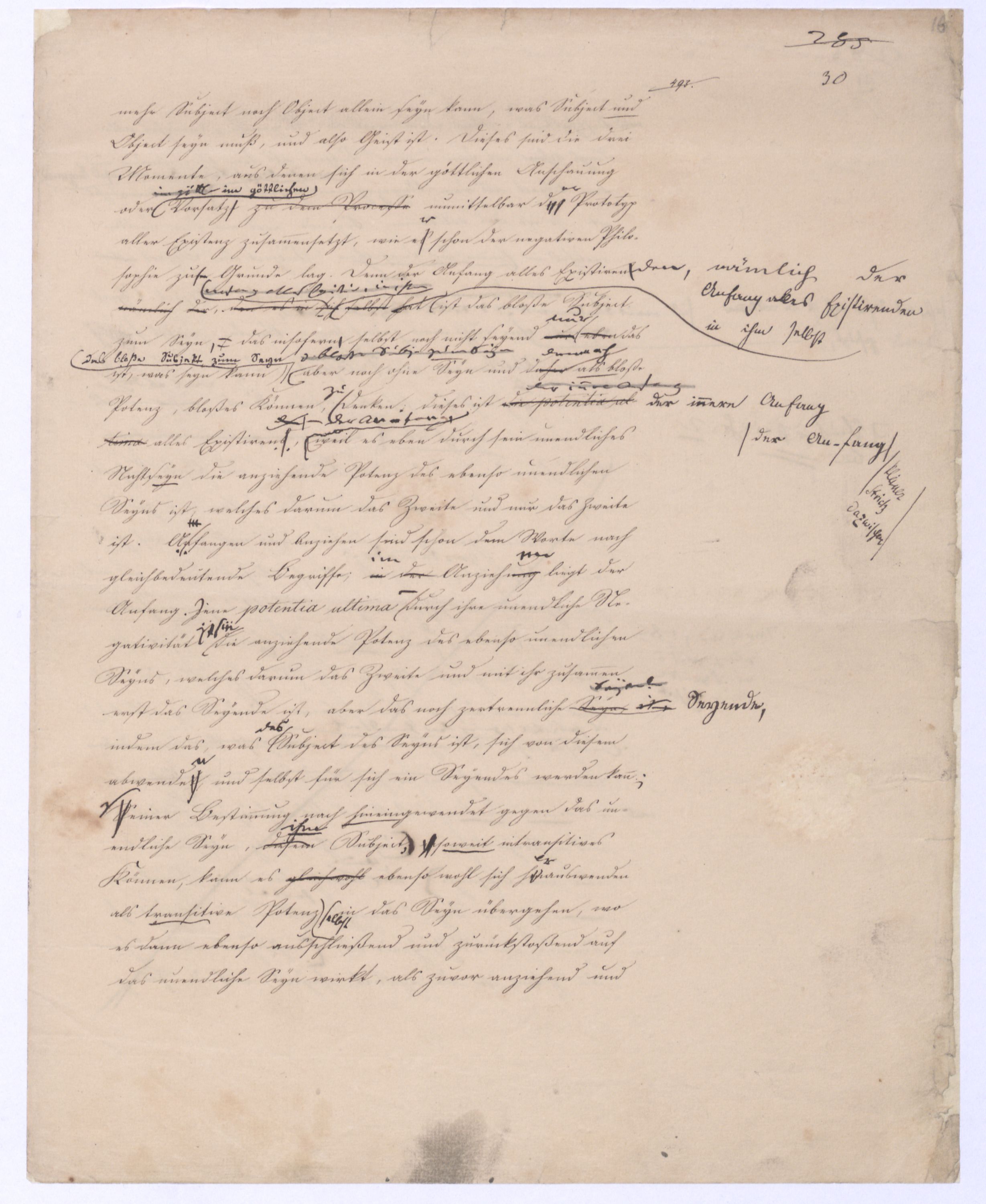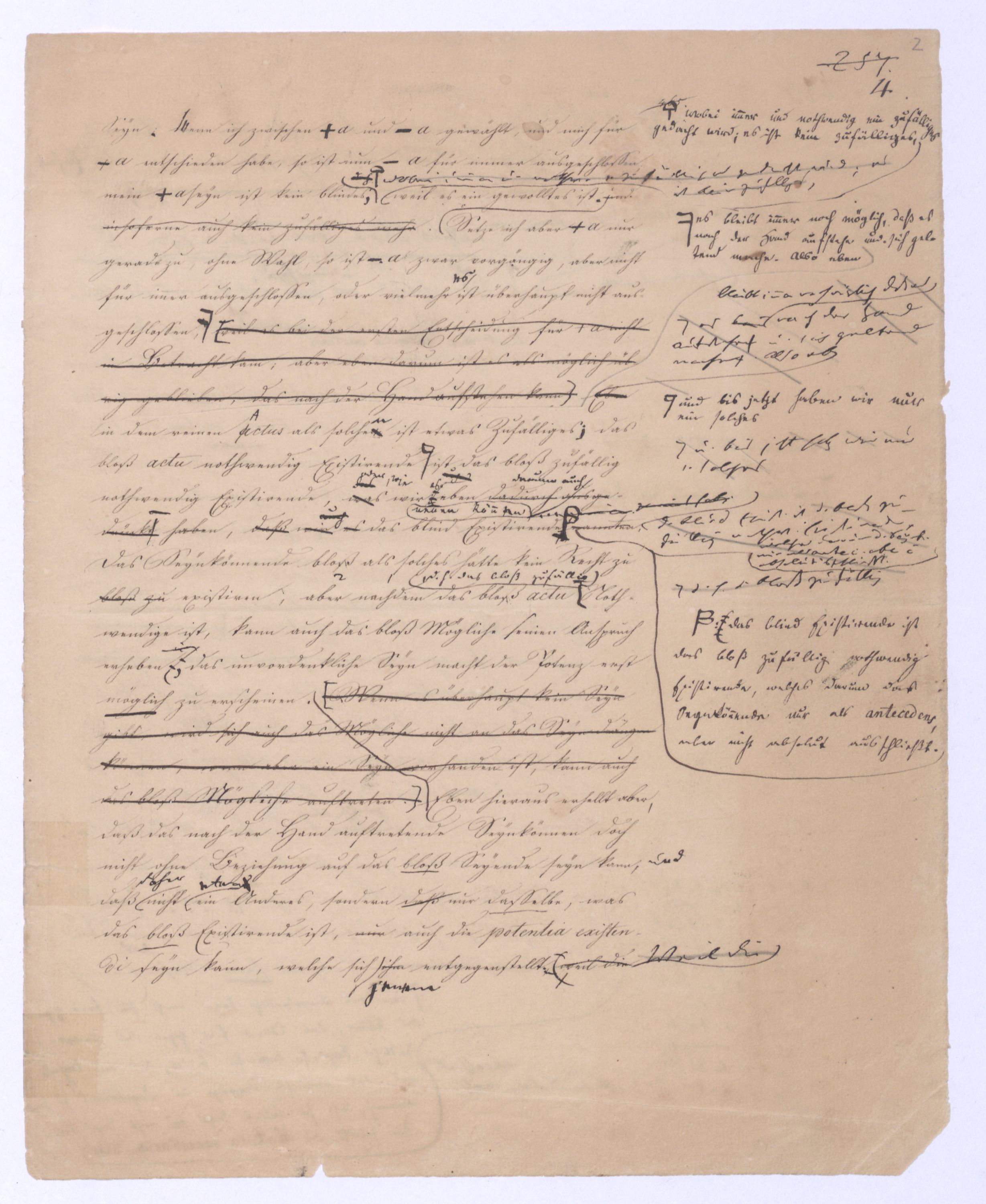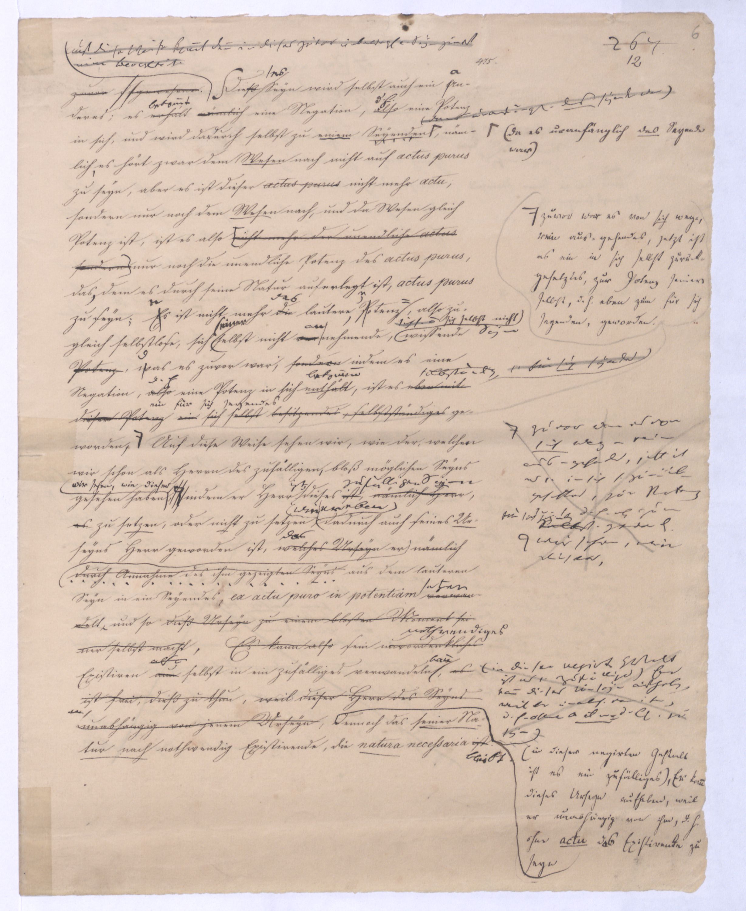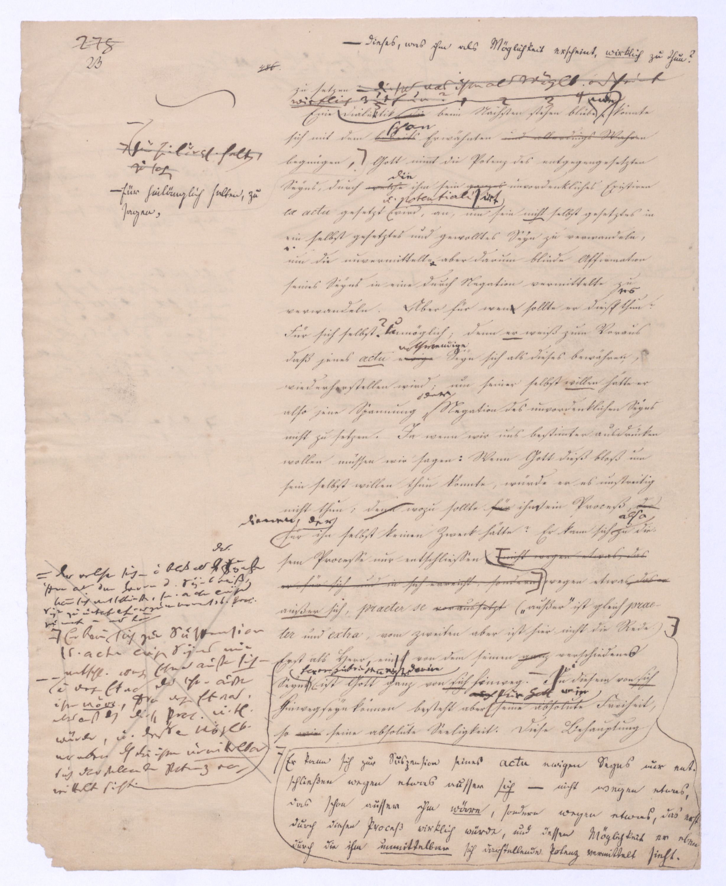 Seyn; wenn ich zwischen +a und –a gewählt, und mich für +a entschieden habe, so ist nun –a für immer ausgeschlossen; mein +a seyn ist kein blindes, wobei immer u. nothw. ein zufälliges gedacht wird; es ist kein zufälliges, weil es ein gewolltes ist und insofern auch kein zufälliges mache. Setze ich aber +a nur geradezu, ohne Wahl, so ist –a zwar vorgängig, aber nicht für immer ausgeschlossen, oder vielmehr ist überhaupt nicht ausgeschlossen, weil es bei der ersten Entscheidung für +a nicht in Betracht kam; aber eben darum ist es als möglich übrig geblieben, das nach der Hand aufstehen kann. Ebenes kommtbleibt immer noch möglich daß es nach der Hand aufstehen u. sich geltend machen. Also eben in dem reinen actus als solchem ist etwas Zufälliges, das bloß actu nothwendig Existirende u. bis jetzt haben wir nur ein solches ist das bloß zufällig nothwendig Existirende, was wir eben dadurch ausgegedrückt haben, daß wir es das blind Existirende nanntennennen genannt haben, d. blind Exist. ist d. bloß zufällig nothwend. Existirende, welches darum d. Seynk. nur als antec. aber nicht absolut ausschließt. Das Seynkönnende bloß als solches hätte kein Recht zu bloß zu existiren; aber nachdemnachdem aber das bloß actu d. h. d. bloß zufällig Nothwendige ist, kann auch das bloß Mögliche einen Anspruch erheben, u. das unvordenkliche Seyn macht der Potenz erst möglich zu erscheinen. Wenn es überhaupt kein Seyn gibt, wird sich auch das Mögliche nicht an das Seyn drängen können, wenn aber ein Seyn vorhanden ist, kann auch das bloß Mögliche auftreten. Eben hieraus erhellt aber, daß das nach der Hand auftretende Seynkönnen doch nicht ohne Beziehung auf das bloß Seyende seyn kann, daß nicht ein Anderes, sondern daß nur dasselbe, was das bloß Existirende ist, nur auch die potentia existendi seyn kann, welche sich ihm entgegenstellt, weil die. Weil die Potenz nicht erscheinen kann, als unter der Voraussetzung des Seyns, so muß zwischen beiden eine BeziehungEinheit seyn, sie könne nicht außer einanderstehen, d. h. es kann nur dasselbe seyn, was unmittelbar das bloß Existirende, aber dann auch Potenz des Existirens istkein muß auch die pot. existendi seyn; aber ineben damit, indem ich dieß ausspreche und sage: dasselbe, was das bloß oder unendlich Seyende ist, dasselbe muß auch die unendliche Potenz des Existirens, oderPot. exist., oder das unendliche Seynkönnen seyn, ist bereits etwas gesetzt, was mehr als das bloß Existirende ist, was über den bloßen actus des Existirens hinausgeht, was über diesen hinaus seyn kann, was eben darum das nicht mehr das bloß actu nothwendig Existirende seyn kann, sondern nu, welche auch unabhängig vom wirklichen Existiren, vom actus des Existirens, der zwar nicht in seinem Princip, aber der hintennach als ein zufälliger erscheinen kann, noch das nothwendig Existirende ist, nämlich ihrer Natur, oder ihrem Wesen nach.