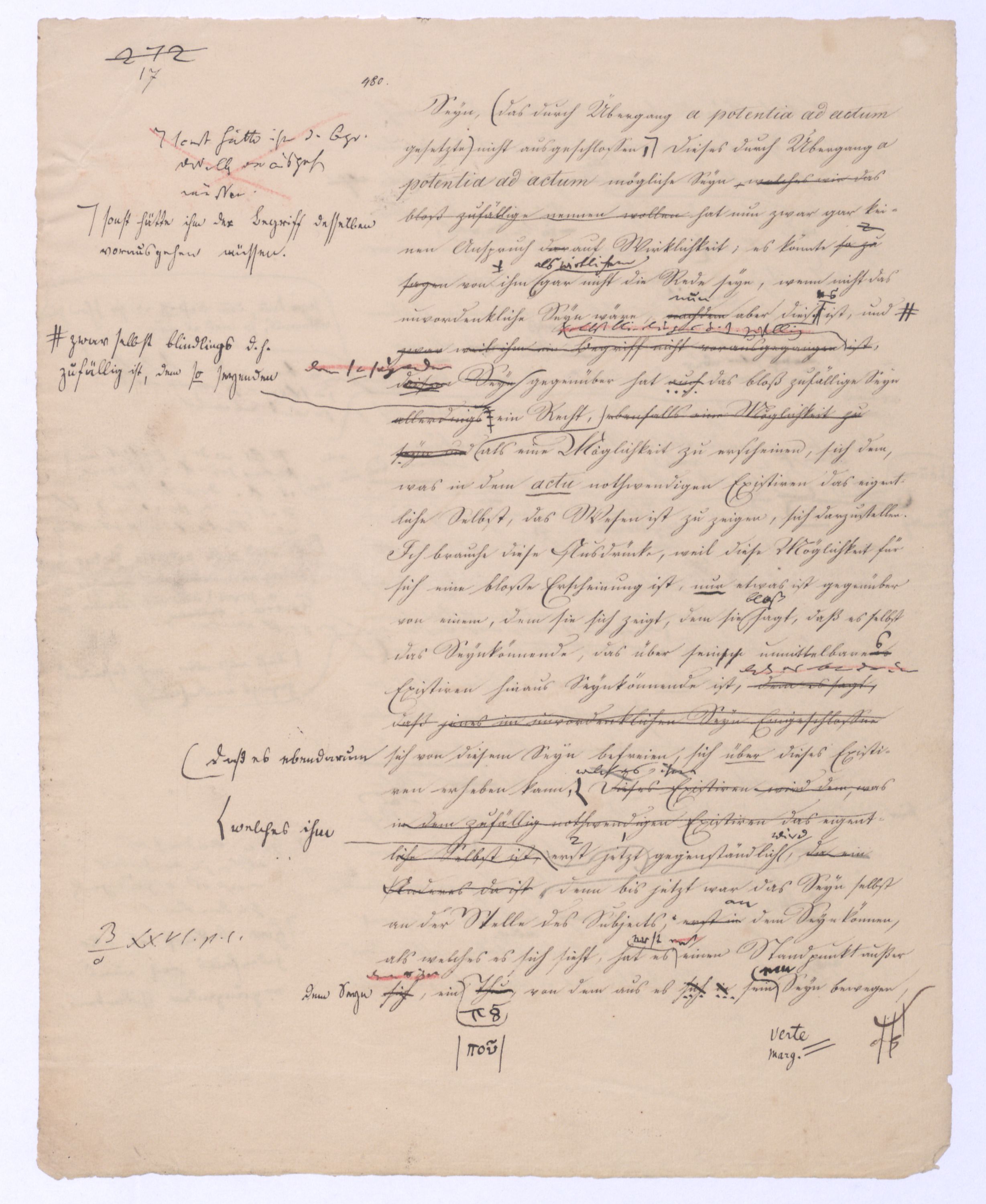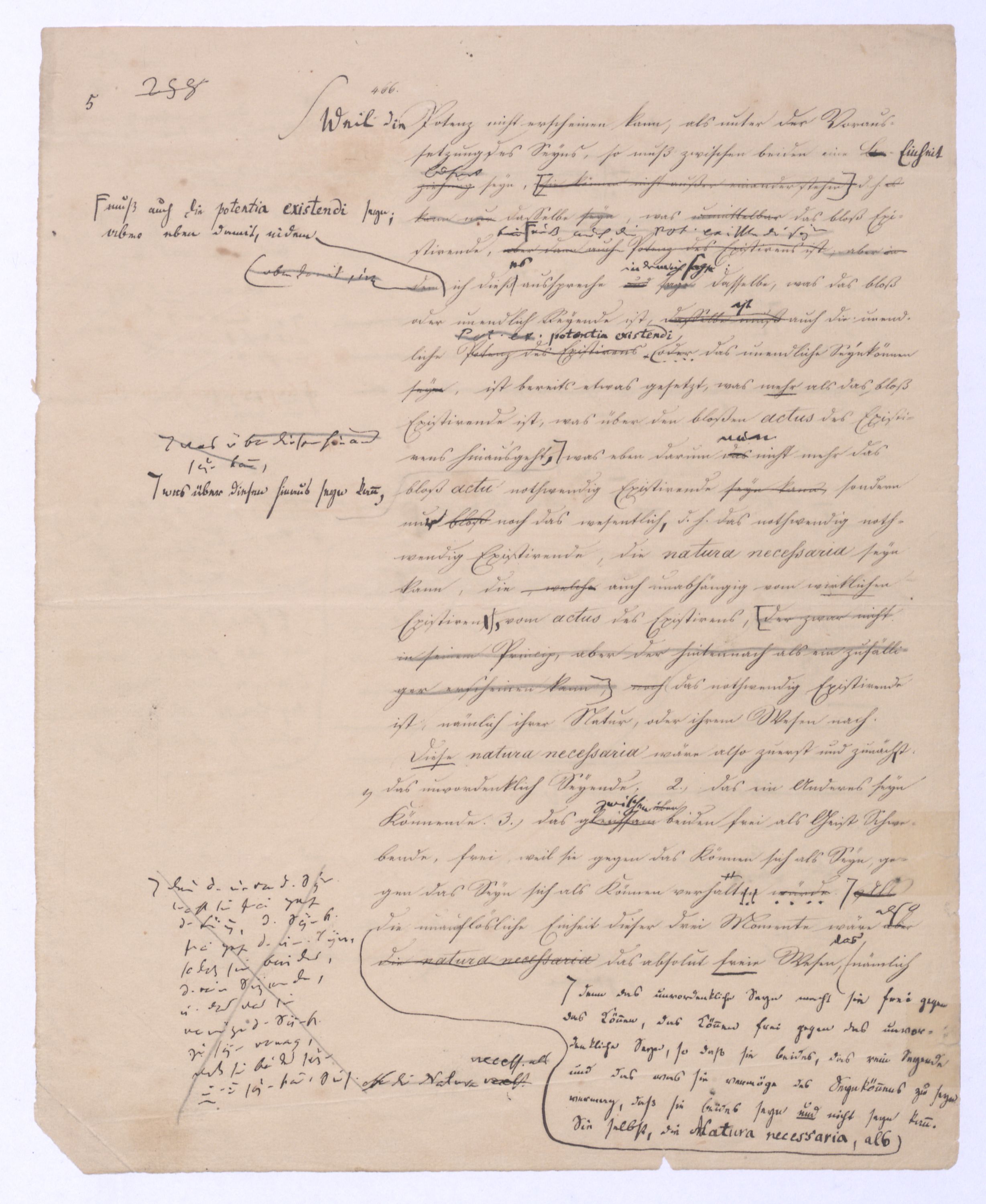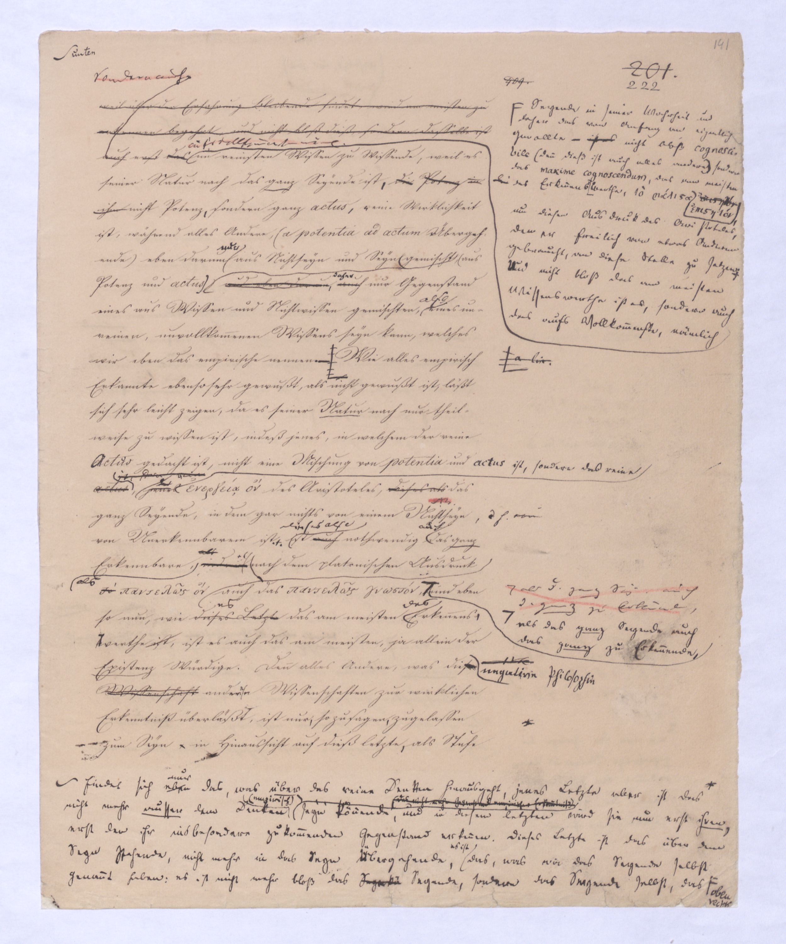 Seyn; wenn ich zwischen +a und –a gewählt, und mich für +a entschieden habe, so ist nun –a für immer ausgeschlossen; mein +a seyn ist kein blindes, wobei immer u. nothw. ein zufälliges gedacht wird; es ist kein zufälliges, weil es ein gewolltes ist und insofern auch kein zufälliges mache. Setze ich aber +a nur geradezu, ohne Wahl, so ist –a zwar vorgängig, aber nicht für immer ausgeschlossen, oder vielmehr ist überhaupt nicht ausgeschlossen, weil es bei der ersten Entscheidung für +a nicht in Betracht kam; aber eben darum ist es als möglich übrig geblieben, das nach der Hand aufstehen kann. Ebenes kommtbleibt immer noch möglich daß es nach der Hand aufstehen u. sich geltend machen. Also eben in dem reinen actus als solchem ist etwas Zufälliges, das bloß actu nothwendig Existirende u. bis jetzt haben wir nur ein solches ist das bloß zufällig nothwendig Existirende, was wir eben dadurch ausgegedrückt haben, daß wir es das blind Existirende nanntennennen genannt haben, d. blind Exist. ist d. bloß zufällig nothwend. Existirende, welches darum d. Seynk. nur als antec. aber nicht absolut ausschließt. Das Seynkönnende bloß als solches hätte kein Recht zu bloß zu existiren; aber nachdemnachdem aber das bloß actu d. h. d. bloß zufällig Nothwendige ist, kann auch das bloß Mögliche einen Anspruch erheben, u. das unvordenkliche Seyn macht der Potenz erst möglich zu erscheinen. Wenn es überhaupt kein Seyn gibt, wird sich auch das Mögliche nicht an das Seyn drängen können, wenn aber ein Seyn vorhanden ist, kann auch das bloß Mögliche auftreten. Eben hieraus erhellt aber, daß das nach der Hand auftretende Seynkönnen doch nicht ohne Beziehung auf das bloß Seyende seyn kann, daß nicht ein Anderes, sondern daß nur dasselbe, was das bloß Existirende ist, nur auch die potentia existendi seyn kann, welche sich ihm entgegenstellt, weil die. Weil die Potenz nicht erscheinen kann, als unter der Voraussetzung des Seyns, so muß zwischen beiden eine BeziehungEinheit seyn, sie könne nicht außer einanderstehen, d. h. es kann nur dasselbe seyn, was unmittelbar das bloß Existirende, aber dann auch Potenz des Existirens istkein muß auch die pot. existendi seyn; aber ineben damit, indem ich dieß ausspreche und sage: dasselbe, was das bloß oder unendlich Seyende ist, dasselbe muß auch die unendliche Potenz des Existirens, oderPot. exist., oder das unendliche Seynkönnen seyn, ist bereits etwas gesetzt, was mehr als das bloß Existirende ist, was über den bloßen actus des Existirens hinausgeht, was über diesen hinaus seyn kann, was eben darum das nicht mehr das bloß actu nothwendig Existirende seyn kann, sondern nu, welche auch unabhängig vom wirklichen Existiren, vom actus des Existirens, der zwar nicht in seinem Princip, aber der hintennach als ein zufälliger erscheinen kann, noch das nothwendig Existirende ist, nämlich ihrer Natur, oder ihrem Wesen nach.