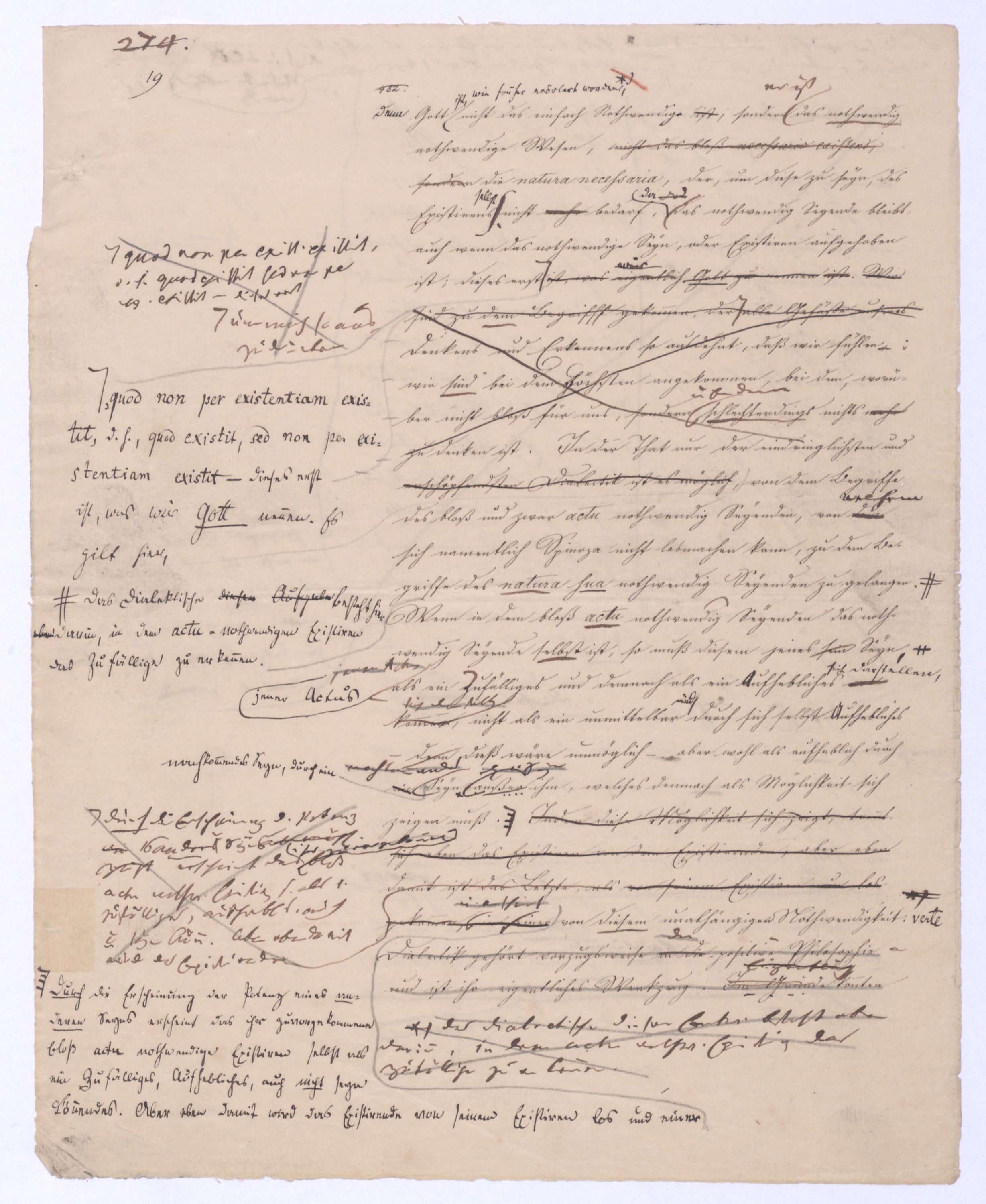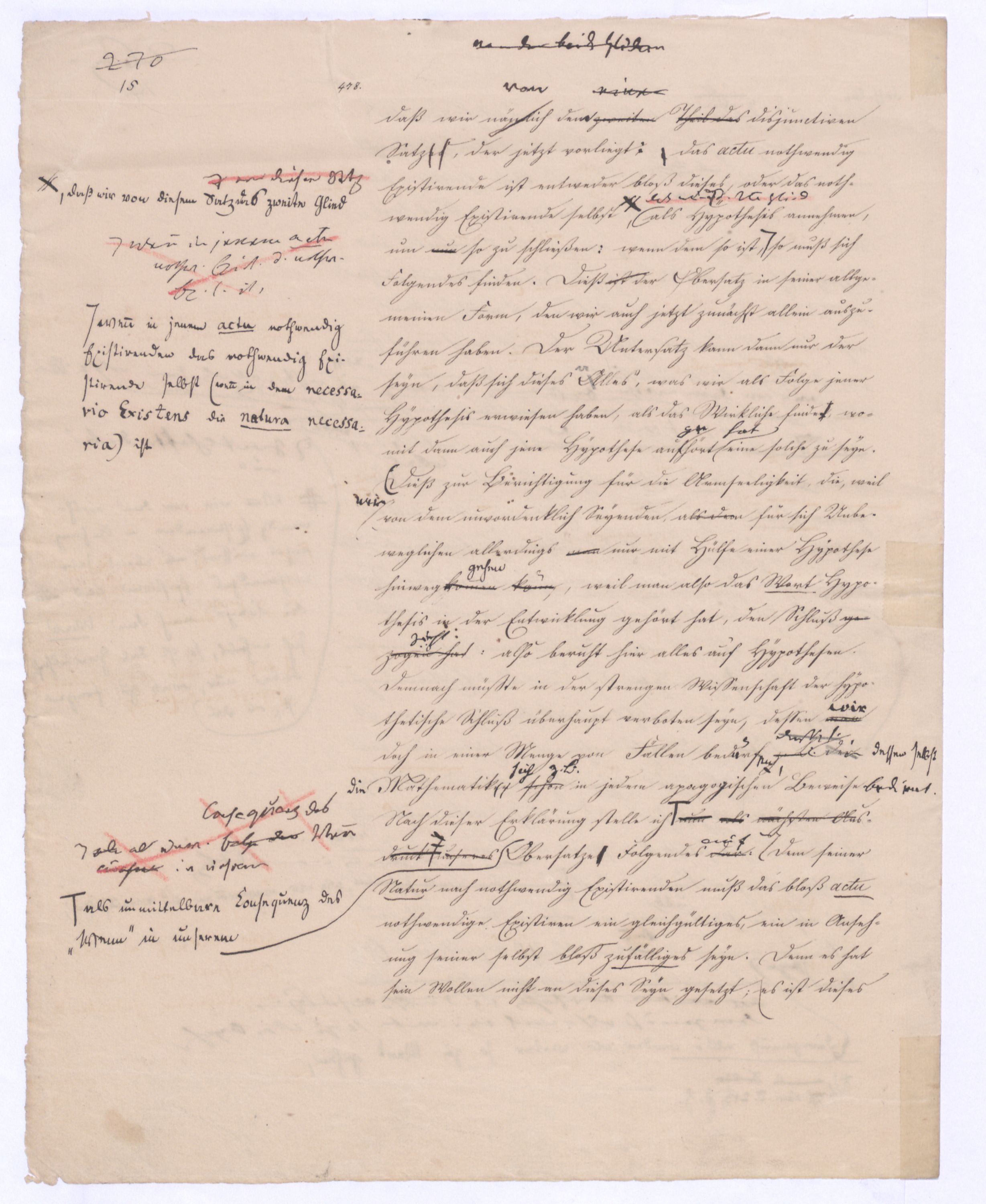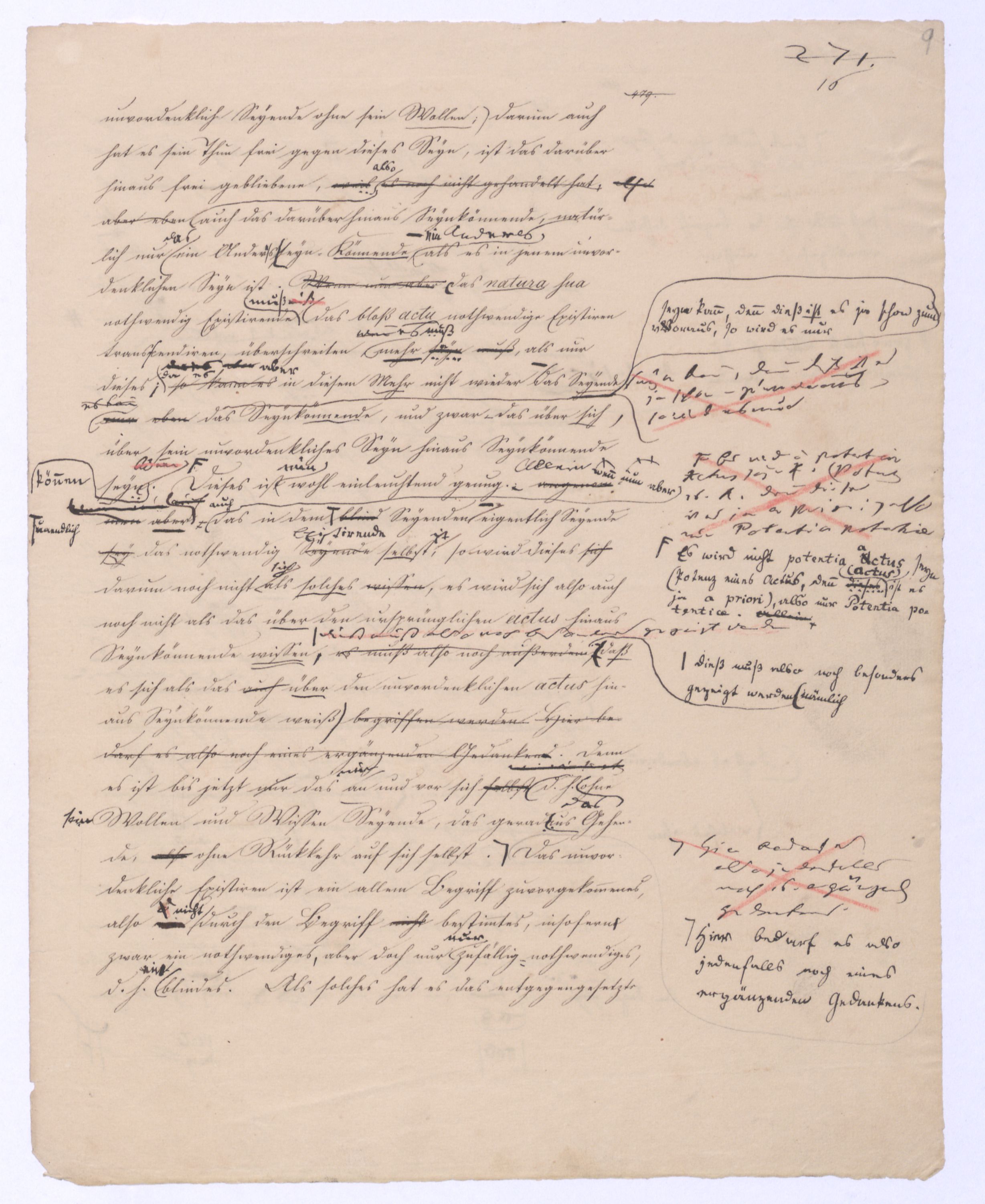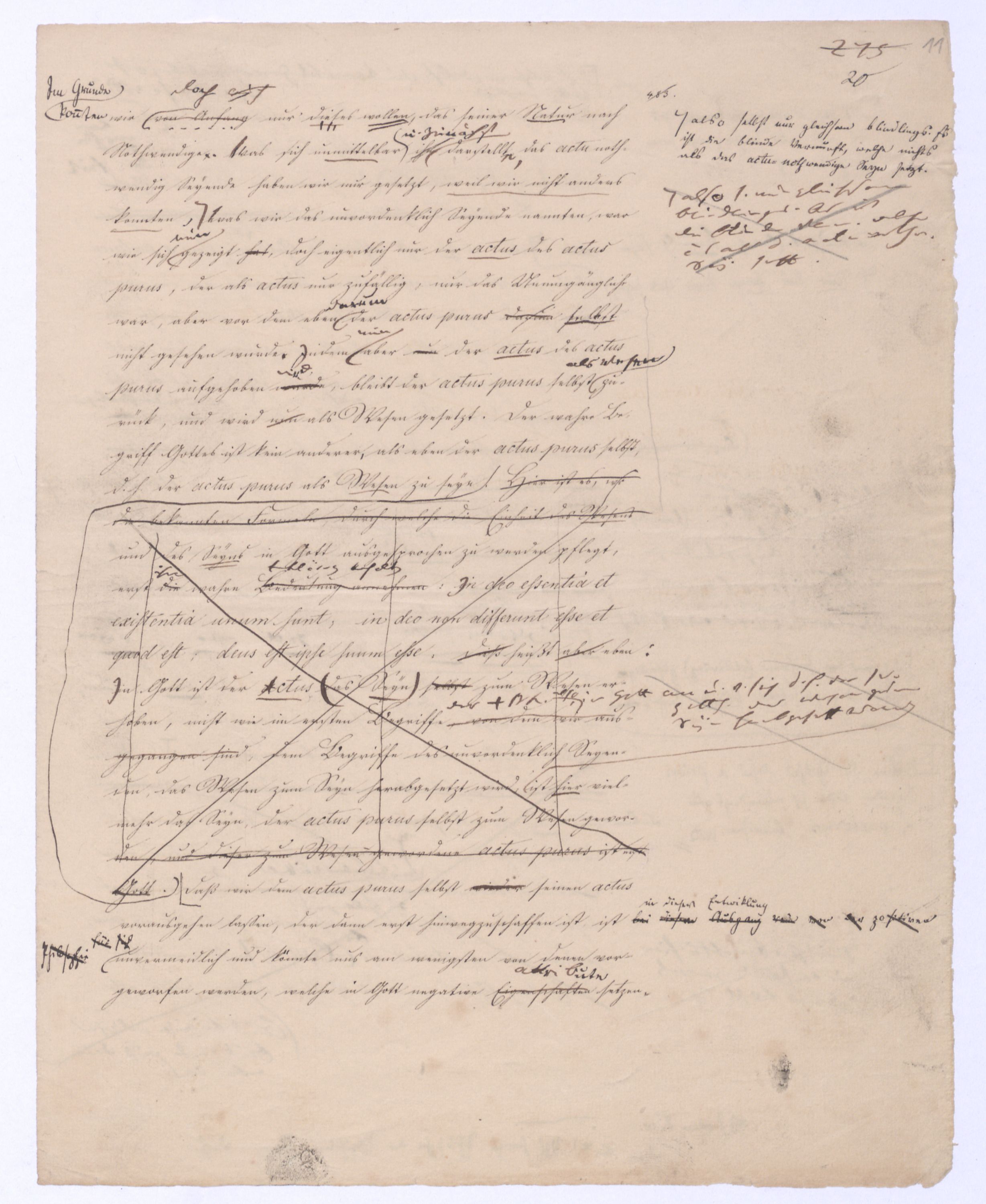 Seyn; wenn ich zwischen +a und –a gewählt, und mich für +a entschieden habe, so ist nun –a für immer ausgeschlossen; mein +a seyn ist kein blindes, wobei immer u. nothw. ein zufälliges gedacht wird; es ist kein zufälliges, weil es ein gewolltes ist und insofern auch kein zufälliges mache. Setze ich aber +a nur geradezu, ohne Wahl, so ist –a zwar vorgängig, aber nicht für immer ausgeschlossen, oder vielmehr ist überhaupt nicht ausgeschlossen, weil es bei der ersten Entscheidung für +a nicht in Betracht kam; aber eben darum ist es als möglich übrig geblieben, das nach der Hand aufstehen kann. Ebenes kommtbleibt immer noch möglich daß es nach der Hand aufstehen u. sich geltend machen. Also eben in dem reinen actus als solchem ist etwas Zufälliges, das bloß actu nothwendig Existirende u. bis jetzt haben wir nur ein solches ist das bloß zufällig nothwendig Existirende, was wir eben dadurch ausgegedrückt haben, daß wir es das blind Existirende nanntennennen genannt haben, d. blind Exist. ist d. bloß zufällig nothwend. Existirende, welches darum d. Seynk. nur als antec. aber nicht absolut ausschließt. Das Seynkönnende bloß als solches hätte kein Recht zu bloß zu existiren; aber nachdemnachdem aber das bloß actu d. h. d. bloß zufällig Nothwendige ist, kann auch das bloß Mögliche einen Anspruch erheben, u. das unvordenkliche Seyn macht der Potenz erst möglich zu erscheinen. Wenn es überhaupt kein Seyn gibt, wird sich auch das Mögliche nicht an das Seyn drängen können, wenn aber ein Seyn vorhanden ist, kann auch das bloß Mögliche auftreten. Eben hieraus erhellt aber, daß das nach der Hand auftretende Seynkönnen doch nicht ohne Beziehung auf das bloß Seyende seyn kann, daß nicht ein Anderes, sondern daß nur dasselbe, was das bloß Existirende ist, nur auch die potentia existendi seyn kann, welche sich ihm entgegenstellt, weil die. Weil die Potenz nicht erscheinen kann, als unter der Voraussetzung des Seyns, so muß zwischen beiden eine BeziehungEinheit seyn, sie könne nicht außer einanderstehen, d. h. es kann nur dasselbe seyn, was unmittelbar das bloß Existirende, aber dann auch Potenz des Existirens istkein muß auch die pot. existendi seyn; aber ineben damit, indem ich dieß ausspreche und sage: dasselbe, was das bloß oder unendlich Seyende ist, dasselbe muß auch die unendliche Potenz des Existirens, oderPot. exist., oder das unendliche Seynkönnen seyn, ist bereits etwas gesetzt, was mehr als das bloß Existirende ist, was über den bloßen actus des Existirens hinausgeht, was über diesen hinaus seyn kann, was eben darum das nicht mehr das bloß actu nothwendig Existirende seyn kann, sondern nu, welche auch unabhängig vom wirklichen Existiren, vom actus des Existirens, der zwar nicht in seinem Princip, aber der hintennach als ein zufälliger erscheinen kann, noch das nothwendig Existirende ist, nämlich ihrer Natur, oder ihrem Wesen nach.