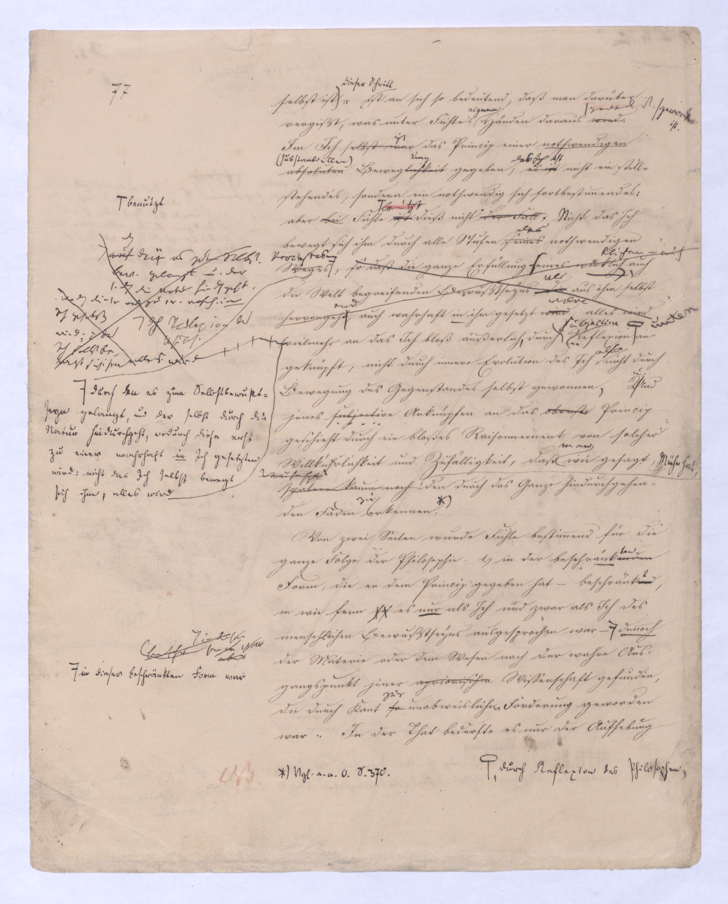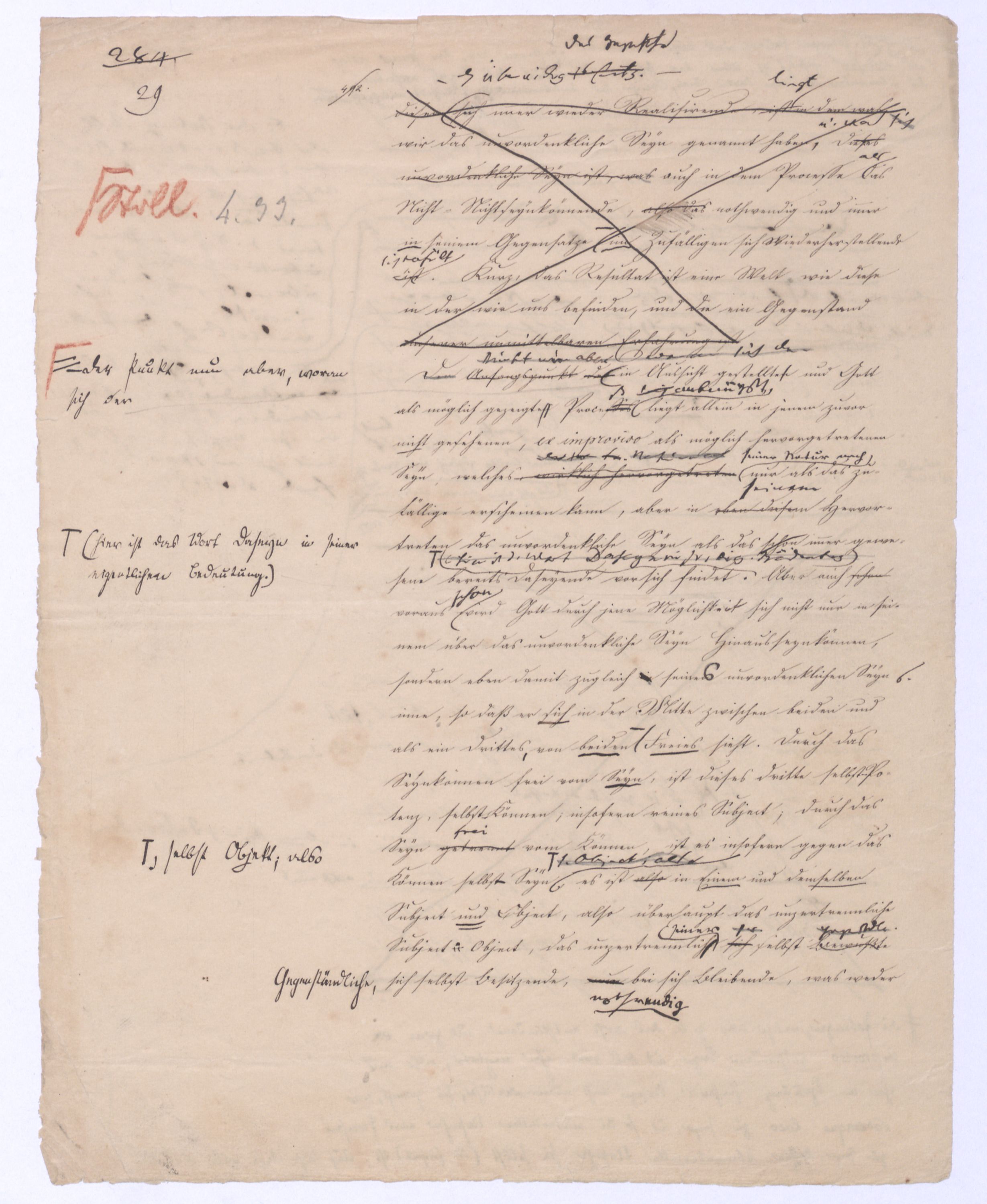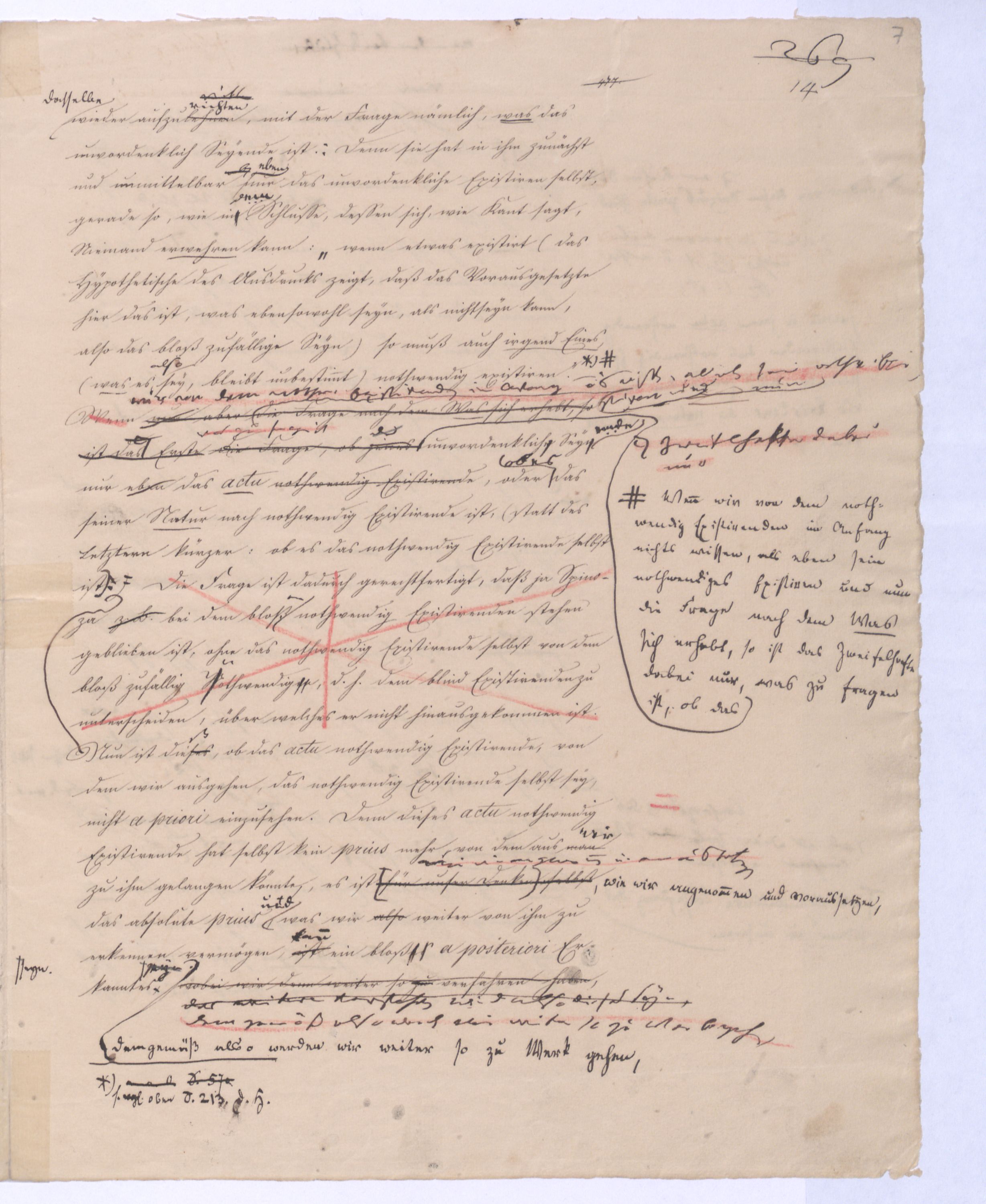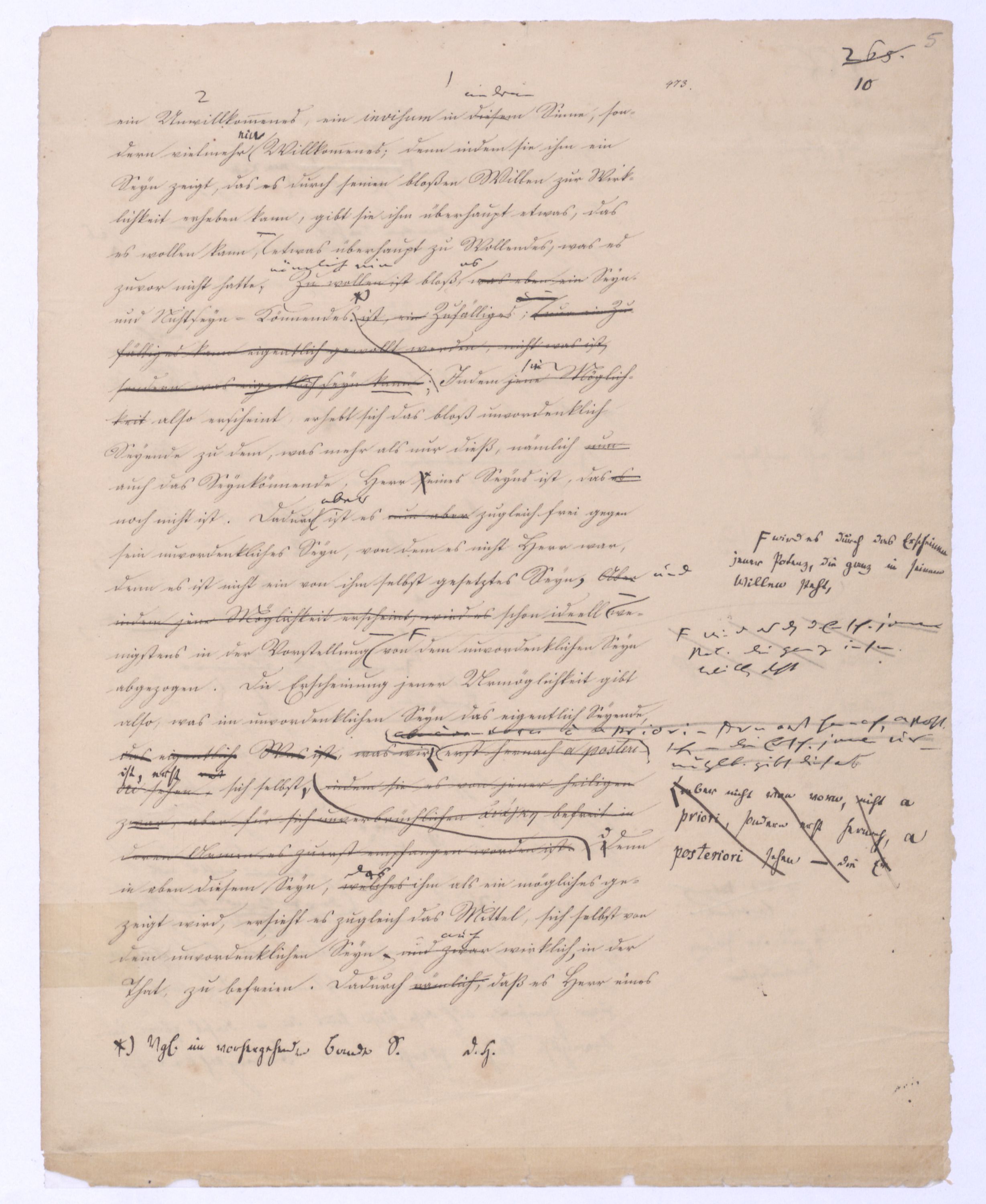 Das unendlich Seyende ist also der unmittelbare Vernunftbegriff, zu dem sie so, wie siedie von die von sich selbst freie ist, sich selbst nicht mehr zum Object hat, unmittelbar gelangt. Einmal von sich selbst frei hat die Vernunftd. h. nicht sich s. Obj. seyende Vern. – die unm. Vern. nichtniemanden mehr nöthighat, erst durch den übrigens so jedemdem natürl. Verstandnahe liegendennatürlichn. u. unvermeidln. Schluß zu dem Begriff des unendlich Seyenden zu gelangen, von dem Kant in seiner naiven Weise sagt: »Es ist etwas überaus Merkwürdiges, daß, wenn man voraussetzt, etwas existire, man der Folgerung nicht Umgang haben kann, daß auch irgend etwas nothwendiger Weise existire«