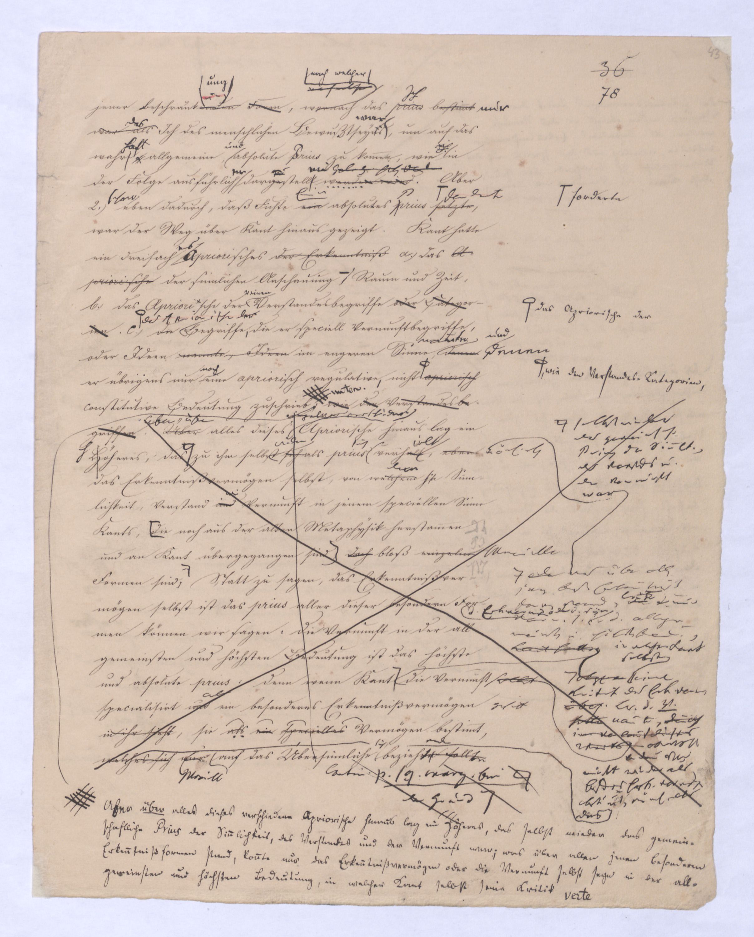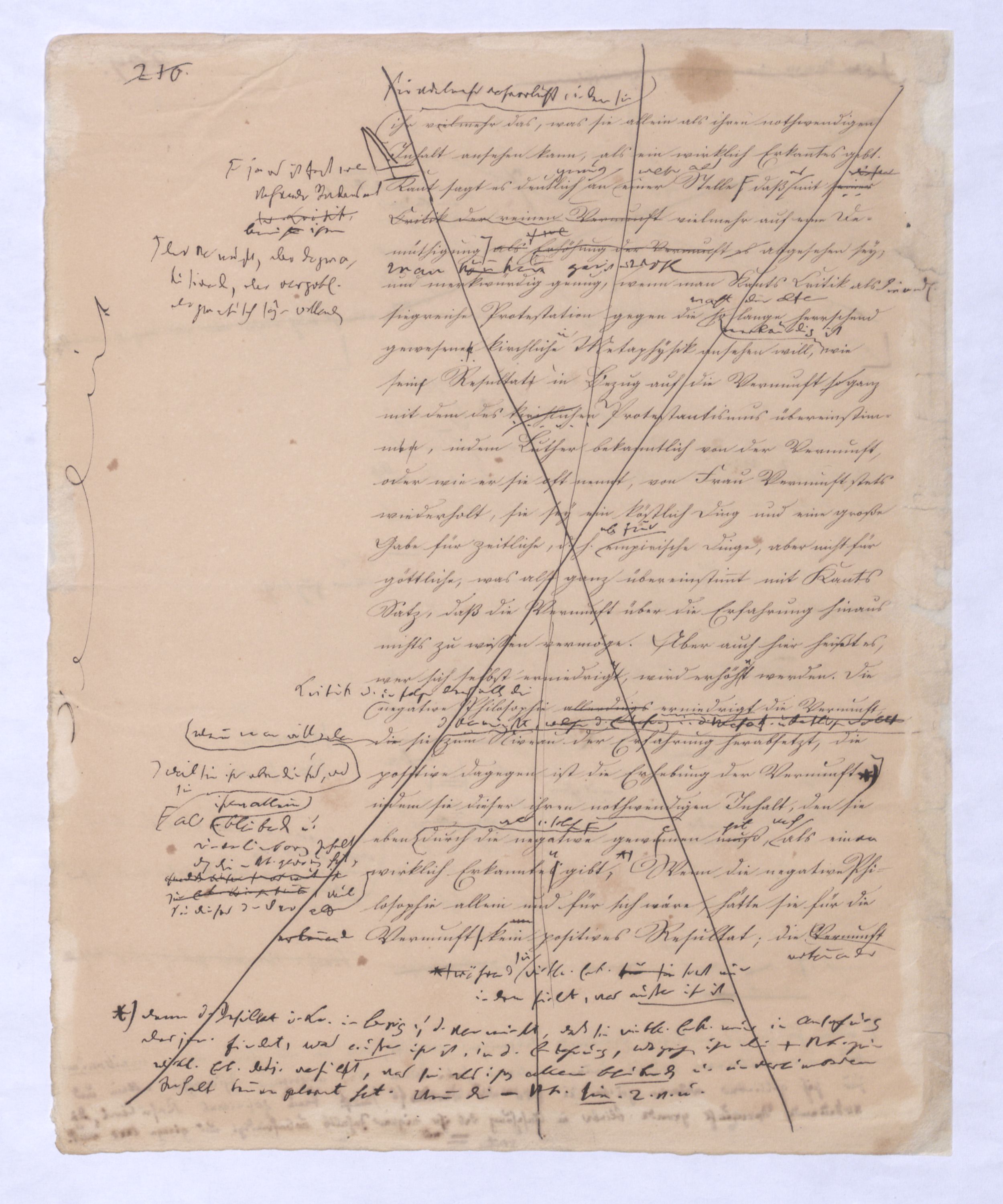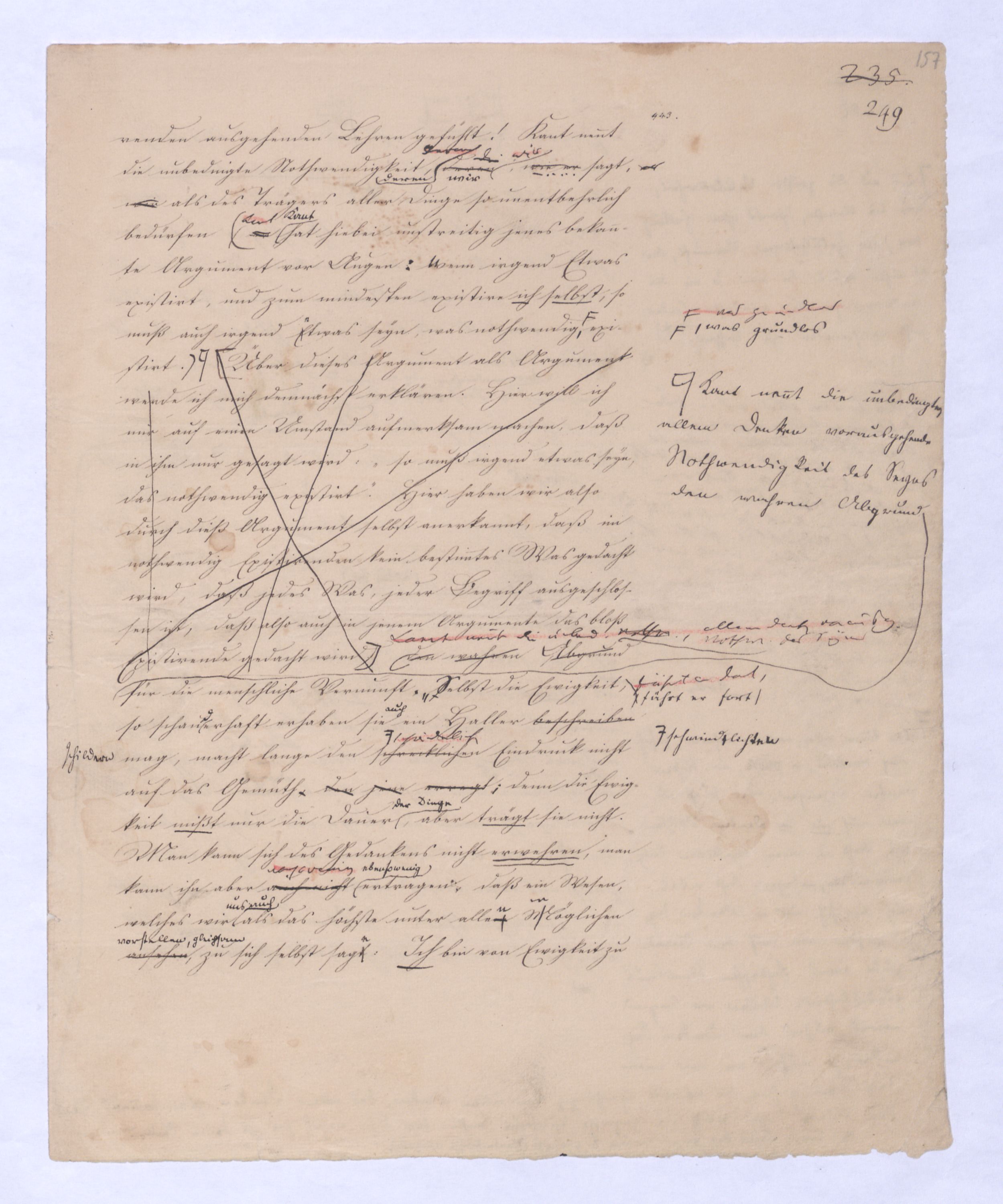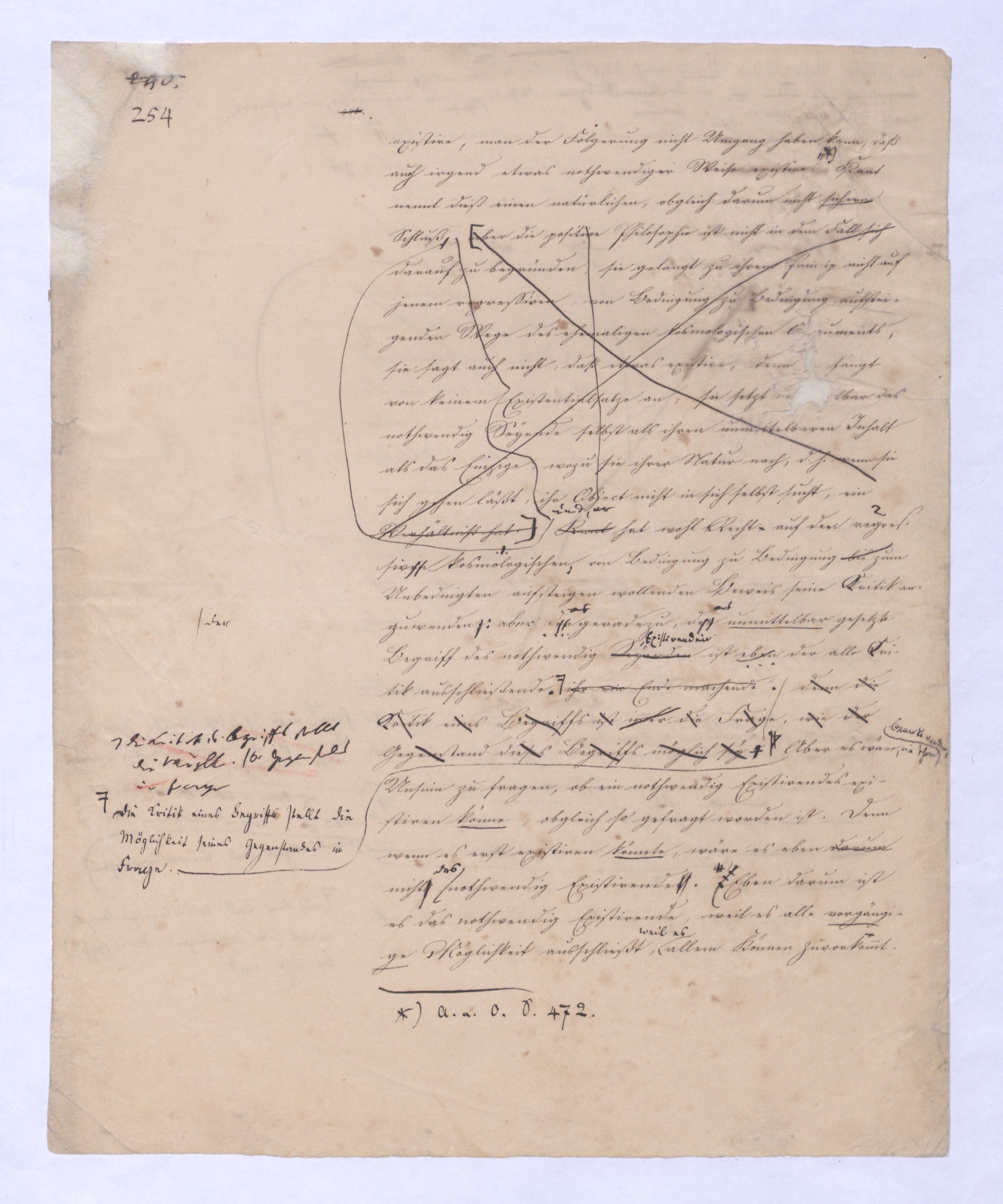 Das unendlich Seyende ist also der unmittelbare Vernunftbegriff, zu dem sie so, wie siedie von die von sich selbst freie ist, sich selbst nicht mehr zum Object hat, unmittelbar gelangt. Einmal von sich selbst frei hat die Vernunftd. h. nicht sich s. Obj. seyende Vern. – die unm. Vern. nichtniemanden mehr nöthighat, erst durch den übrigens so jedemdem natürl. Verstandnahe liegendennatürlichn. u. unvermeidln. Schluß zu dem Begriff des unendlich Seyenden zu gelangen, von dem Kant in seiner naiven Weise sagt: »Es ist etwas überaus Merkwürdiges, daß, wenn man voraussetzt, etwas existire, man der Folgerung nicht Umgang haben kann, daß auch irgend etwas nothwendiger Weise existire«