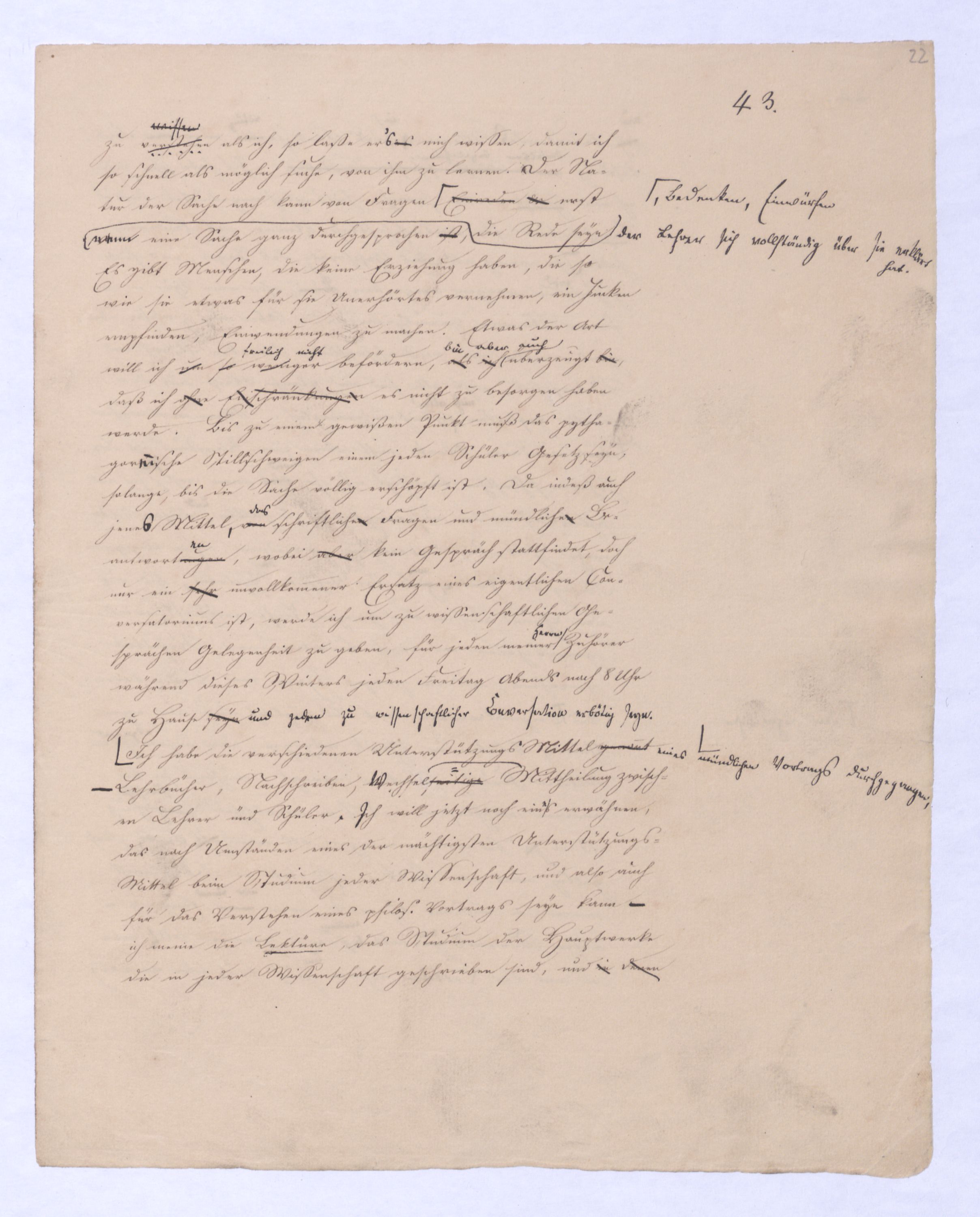 Ich habe die verschiedenen Unterstützungs-Mittel genannt. Lehrbücher, Nachschreiben, wechselseitige Mittheilung zwischen Lehrer und Schüler, ich will jetzt noch eins erwähnen, das nach Umständen eines der mächtigsten Unterstützungs-Mittel beim Studium jeder Wissenschaft, und also auch für das Verstehen eines philos. Vortrags seyn kann – ich meine die Lektüre, das Studium der Hauptwerke die in jeder Wissenschaft geschrieben sind, und in denen sich bedeutende Momente des Fortschritts oder der Fortbildung einer Wissenschaft darstellen. Ich habe schon, indem ich von Hauptwerken sprach, hinlänglich angedeutet, daß ich Tageslektüre für wissenschaftliche Studien nicht förderlich halte, so wenig als das Geschwätz des Tages, das heute gehört und morgen vergessen wird, ohne eine Spur in unserem Innern zurückzulassen. Aber auch zwischen übrigens ernsten und wissenschaftlichen Werken ist noch ein Unterschied, nicht alle sind auf gleiche Weise aus der Quelle geflossen, gleich ursprünglich. Wenn man daher den secundären Werke nicht etwa zum Verständniß der höheren schlechthin benöthigt ist, so thut man wohl, sich ausschließlich an die ursprünglichen zu halten, diesen desto mehr Zeit und Anstrengung zu widmen. Ein einziger Dialog des Plato z. B. der Sophist, Philebus bis auf den Grund und in der ganzen Tiefe erschöpft wird gewiß jedem ein weit bedeutenderes Resultat gewähren, als ein ganzes Heer von Commentaren. Aus Originalwerken kommt uns zugleich immer ein eigenthümlich belebender Geist entgegen, der unsere productiven Kräfte stärkend anregt, während sie bei anderen einschlafen. Auch in moralischer Beziehung ist es ja bei weitem weniger, als man oft denkt gleichgültig, was man liest. Es steht im Leben nicht immer in unserer Gewalt, wem man Eingang in unser Inneres gestattet, desto genauer solle man es mit der Lectüre nehmen, um sich früh schon an das Ewige Bleibende, Dauernde zu gewöhnen, und verachten zu lernen, was von gestern ist, und morgen nicht mehr seyn wird. Denn noch immer seit der großen durch Kant eingeleiteten Bewegung ist es nicht um diese oder jene Philosophie, es ist um die Philosophie selbst zu thun, wie bei Kants Critik es sich um diese handelte, de capite dimicatur, nemlich eben um die Philosophie selbst. Es mag freilich solchen, die durch zufällige Umstände vielleicht ermuthigt wähnen konnten, es sei die Zeit gekommen, wo die Leerheit, absolute Negation alles Metaphysischen in der Wissenschaft und Menschheit sich auf den Thron setzen darf, es muß solchen sehr ungelegen seyn zu hören, daß man immer noch auf die Fundamentaluntersuchungen, historisch zu sprechen bis auf Kant zurückzugehen habe, solche werden daher alles aufbieten, dieses Unternehmen, da sie es nicht hindern können, wenigstens zu verdächtigen z. B. vorzuspiegeln, es sei hiebei bloß um Religion zu thun, der Streit sei ein religiöser, man wolle nur die Religion im alten Sinne besonders positive Religion u. dgl. denn mit solchen Dingen glaubt man jenes Streben schon hinlänglich verrufen. Aber so ist es nicht es handelt sich und zwar sehr ernstlich – und ich sage es noch einmal, möge es das letzte Mal seyn, um die Bedeutung der Philosophie selbst, nicht um diese oder jene Philosophie. Wir geben vorläufig gar keine bestimmte Philosophie zu, weder eine religiöse, noch eine, die sich als irreligiös gibt, wir lassen beides dahingestellt, denn von Abgeleitetem kann erst die Rede seyn, wenn die Hauptsache, d. h. Philosophie selbst gewiß ist. Seit Kants Critik ist die Philosophie in einem fortschreitenden Werden, und sie ist vielleicht gerade jetzt in einer letzten Crisis begriffen. Läßt sich auch schon das nothwendige Resultat dieser Crisis einsehen, so kann man doch vorerst wenigstens, und solange dieses Resultat nicht zu allgemeiner Anerkennung gekommen, es nicht unabhängig vom geschichtlichen Proceß darstellen, dessen Ende dieß Resultat ist, d. h. wir sind genöthigt, den ganzen Weg der Philosophie von Kant bis jetzt zu durchschreiten, denn der Meinung, als könnte irgend etwas aufgestellt werden, das sich ganz vom Zusammenhange mit Kant lossagen kann, das sich ganz aus der Continuität dieser großen durch Kant eingeleiteten Bewegung hinstellen darf, ist aufs Bestimmteste zu widersprechen. Dafür würde auch schon der Erfolg sprechen, indem alles was die Continuität, welche ein