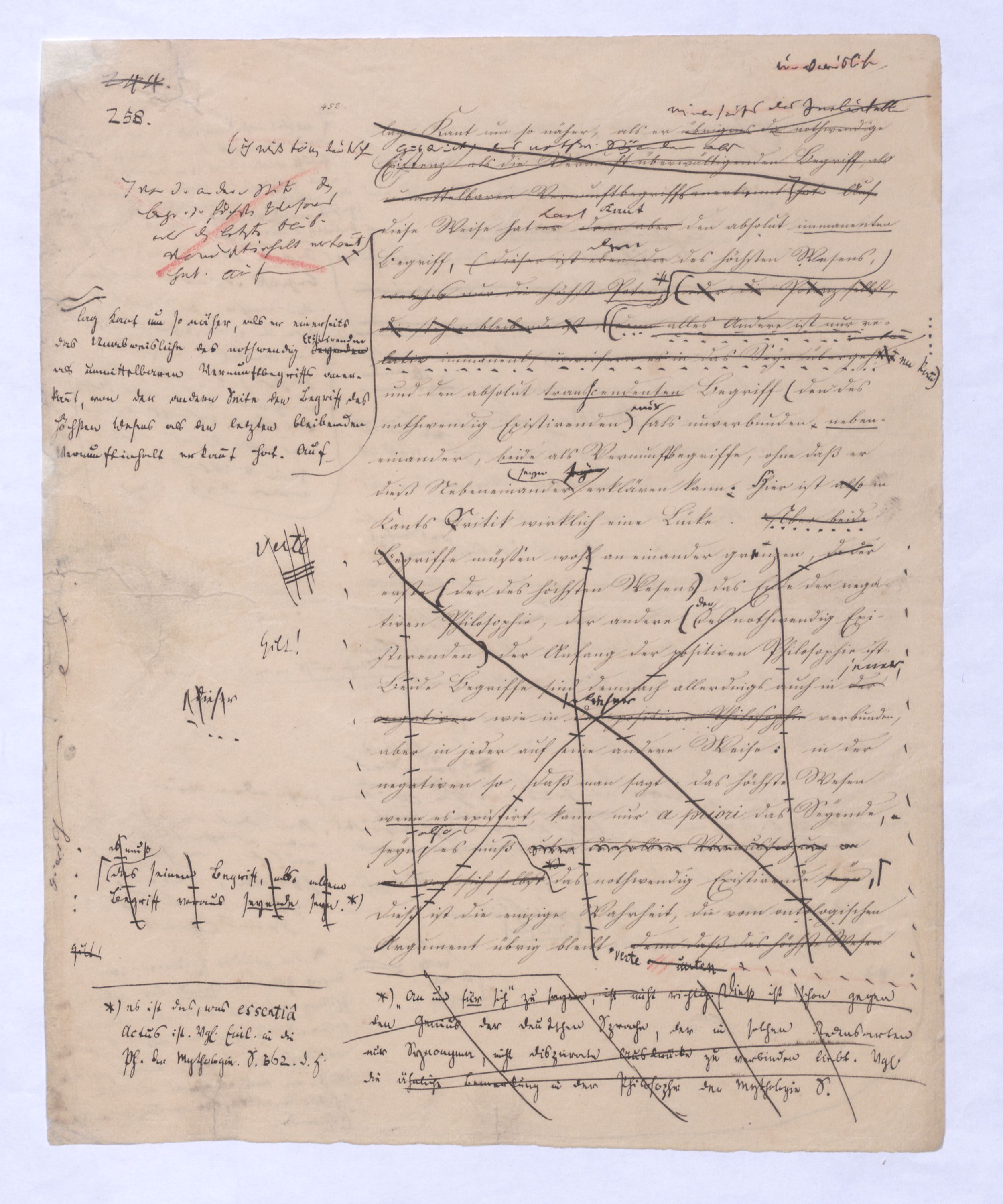 Ich habe so eben wieder das bloß, ohne vorgängige Potenz Seyende den absolut transscendentalen Begriff genannt. Seit Kant ist so viel von immanenter Erkenntniß, immanentem Wissen und Denken im günstigen Sinne, von transscendentaler dagegen in so ungünstigem die Rede gewesen, daß man das Letzte nicht ohne eine Art von Apprehension oder Furcht nennen kann. Aber diese Furcht ist nur wohl angebracht auf dem Standpunkte der vormaligen Metaphysik, die wir aufgehoben haben. Überlegt manen Sie Folgendes. Alles Transcendentale ist eigentlich ein relatives, es ist nur in Bezug auf etwas, das transcendirt wird. Wenn ich von der Idee des höchsten Wesens, auf dessen Existenz schließe, so ist dieß ein TranscendirenDasDie Transcendirenenz der alten Metaphysik war eine bloß relatives, d. h. zaghaftes, halbes, wobei man mit Einem Fuße doch noch im Begriffe stehen bleiben wollte. Das, die Transc. der positiven Philosophie ist eine absolutes, und eben darum keinse in dem Sinne, in welchem essie Kant gleichsam verbietet. Habe ich mich erst im Begriffe festgesetzt, immanent gemacht, d. h. in das reine Denken eingeschlossen, dann ist eine Transcendenz wenigstens möglich.: Ffange ich aber von derm Transscendenzten an, wie Spinoza und die positive Philosophie, so ist ja nichts, das ichs überschritten hätte. Aber wenn man eben dieß Seyende, von welchem wir ausgehen, das Transcendente nennt, ich gehe nun aber in eben diesem Seyenden zum Begriff fort, wie es meine Absicht ist, so habe ich damit das Transcendente selbst transcendirt, bin wieder über dassselbe hinausgegengangen, und bin dadurch wieder immanent geworden; nun ist aber eben dieß der Gang der positiven Philosophie. Kant verbietet der Metaphysik die Transcendenz, aber er verbietet sie nur der dogmatisirenden Vernunft, d. h. der Vernunft, die von sich aus durch Schlüsse zur Existenz gelangen will, er verbietet aber nicht, (denn daran hat er nicht gedacht, diese Möglichkeit hat sich ihm nicht dargestellt) umgekehrt vom bloß, also unendlich Existirenden, in welchem noch nichts von einem Begriff und welches eben darum das Transcendente ist zum Begriff des höchsten Wesens als posterius zu gelangen.