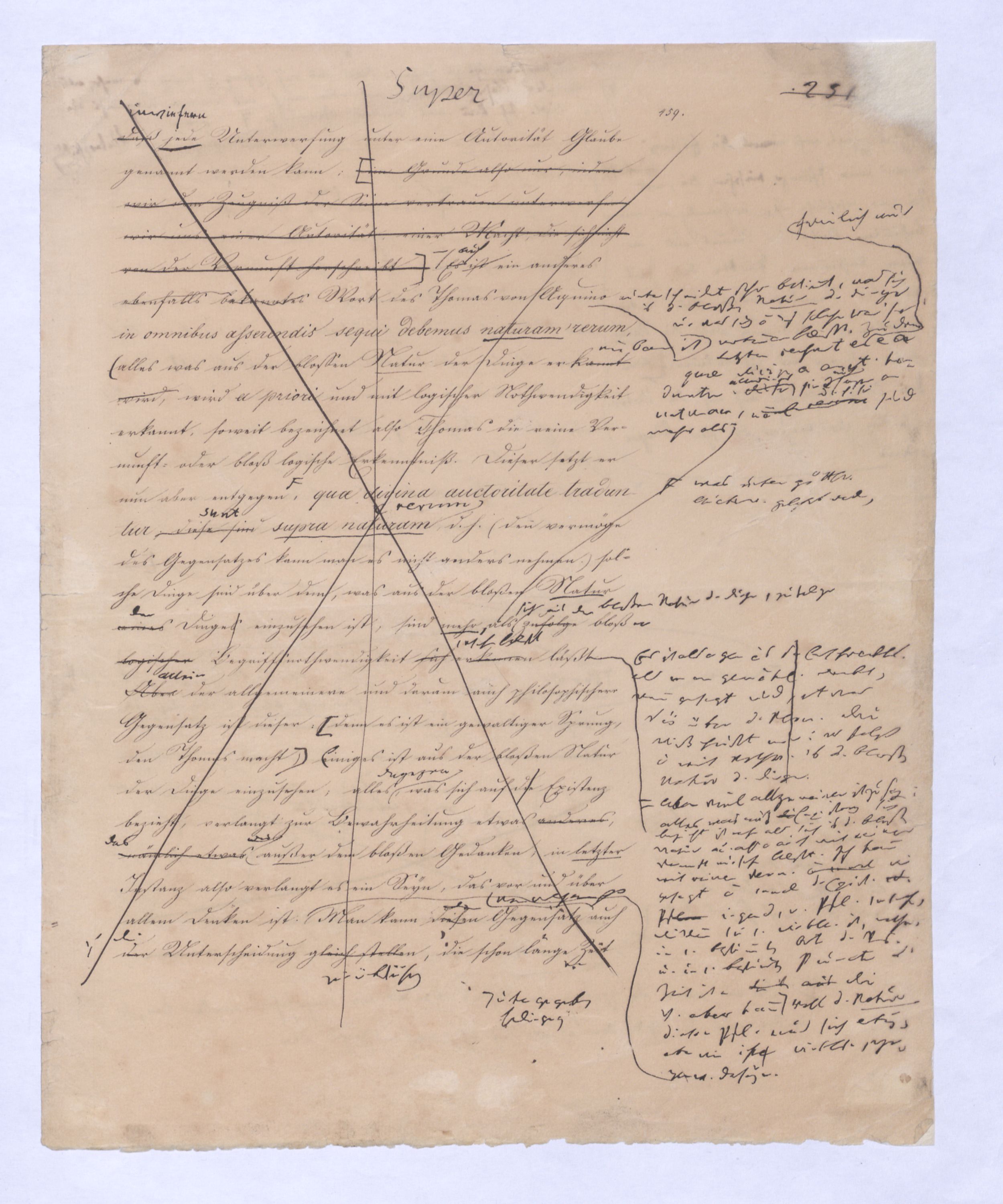 (dieß ist aus der bloßen Vernunft nicht einzusehen). DießDas Wort schreibt sich meines Wissens von J. G. Hamann her, und hat nur den Sinn, daß jede Unterwerfung unter eine Autorität Glauben genannt werden kann; im Grunde also nur, indem wir dem Zeugniß der Sinne vertrauen unterwerfen wir uns einer Autorität, einer Macht, die sich nicht von der Vernunft herschreibt. Es ist– auch ein anderes ebenfalls bekanntes Wort des Thomas von Aquino unterscheidet sehr bestimmt, was sich aus d. bloßen Natur d. Dinge u. was sich nicht auf solche Weise erkennen laesst. Zu dem Letzten rechnet er freilich nur ea quae divina aut. traduntur. Diese allerdings sind auch supra naturam, in omnibus asserendis sequi debemus naturam rerum