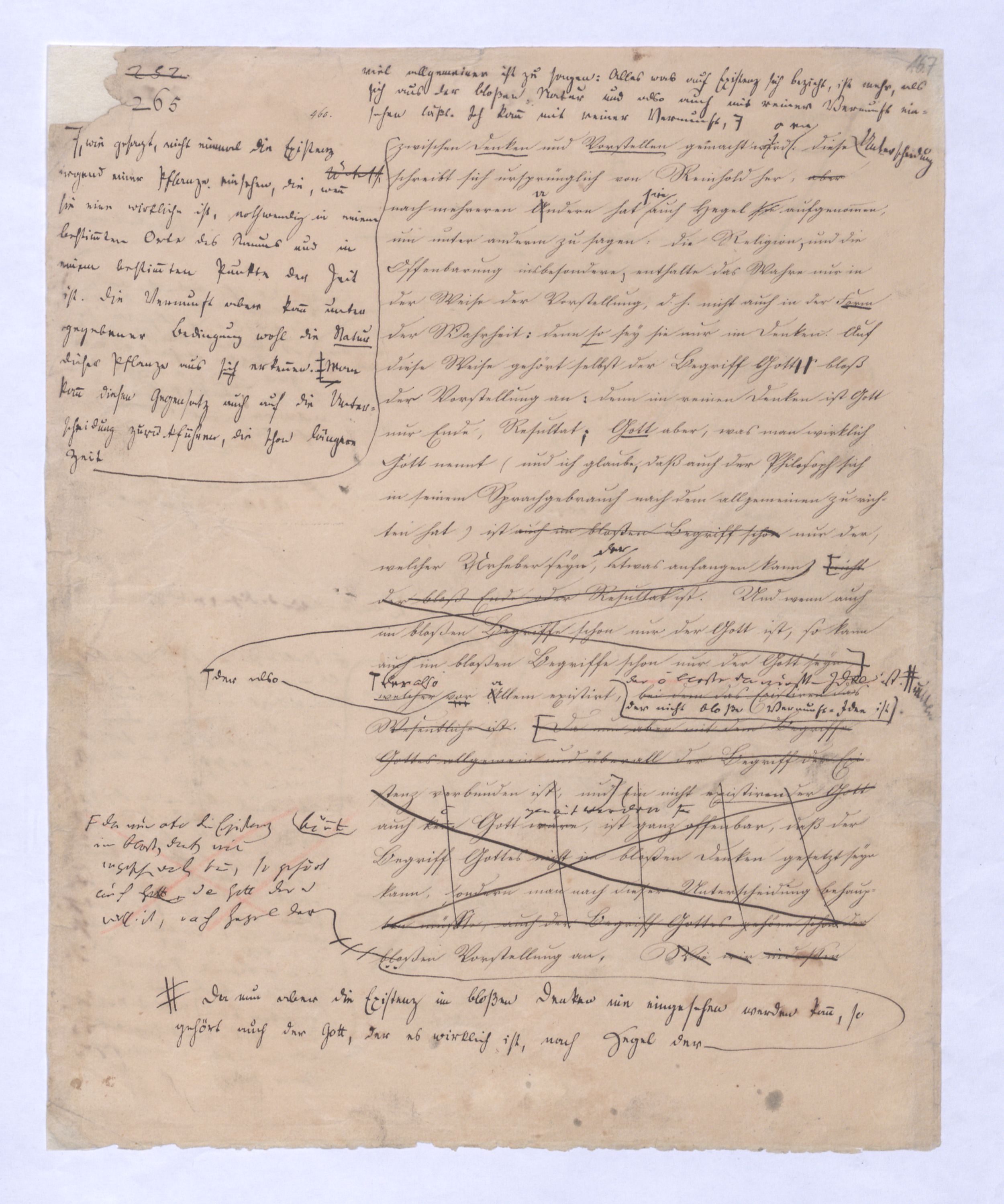, d. h. (denn vermöge des Gegensatzes kann man es nicht anders nehmen.) solche Dinge sind über dem, was aus der bloßen Natur einesder Dinges einzusehen ist, sind mehr,näml. ¿¿¿d. h. sie sind mehr als zufolgesich mit der bloßen Natur d. Dinge, zufolge bloß logischener Begriffsnothwendigkeit sich erkenneneinsehen läßt. AberAllein der allgemeine und darum auch philosophischere Gegensatz ist dieser: (denn es ist ein gewaltiger Sprung, den Thomas macht) eEiniges ist aus der bloßen Natur der Dinge einzusehen; alles dagegen, was sich auf die Existenz bezieht, verlangt zur Bewahrheitung etwas anderes, nämlich etwasdas was außer dem bloßen Gedanken; in letzter Instanz also verlangt es ein Seyn, das vor und über allem Denken ist.Es ist also gar nichts so Erschreckls. als man gewöhnl. denkt, wenn gesagt wird, etwas sey über d. Vern. Denn Wissen heißt nur: es folgt nicht mit Nothw. aus d. bloßen Natur d. Dinge. Aber viel allgemeiner ist zu sagen: alles was auf die Existenz sich bezieht ist mehr als sich aus d. bloßen Natur u. also auch mit reiner Vernunft einsehen laeßt. Ich kann mit reiner Vern. nicht einmal wie gesagt nicht einmal d. Exist. einer Pflan irgend einer Pfl. einsehen, die wenn sie eine wirkl. ist, nothw. in einen bestimmten Ort des Rs. u. in einem bestimmten Puncte d. Zeit ist. Die V. aus Die V. aber kann unter gegebenen Bedingungen wohl die Natur dieser Pfl. aus sich erkennen, aber nie ihre wirkl. gegenwart. Daseyn. Man kann diesen den Gegensatz auch derauf die Unterscheidung gleich stellenzurückführen, die schon laängere Zeit zwischen Denken und Vorstellen gemacht wird. Diese Untersch. schreibt sich ursprünglich von Reinhold her, aber nach mehreren Andern hat auch Hegel sie aufgenommen, um unter anderm zu sagen: die Religion und die Offenbarung insbesondere enthalte das Wahre nur in der Weise der Vorstellung, d. h. nicht auch in der Form der Wahrheit