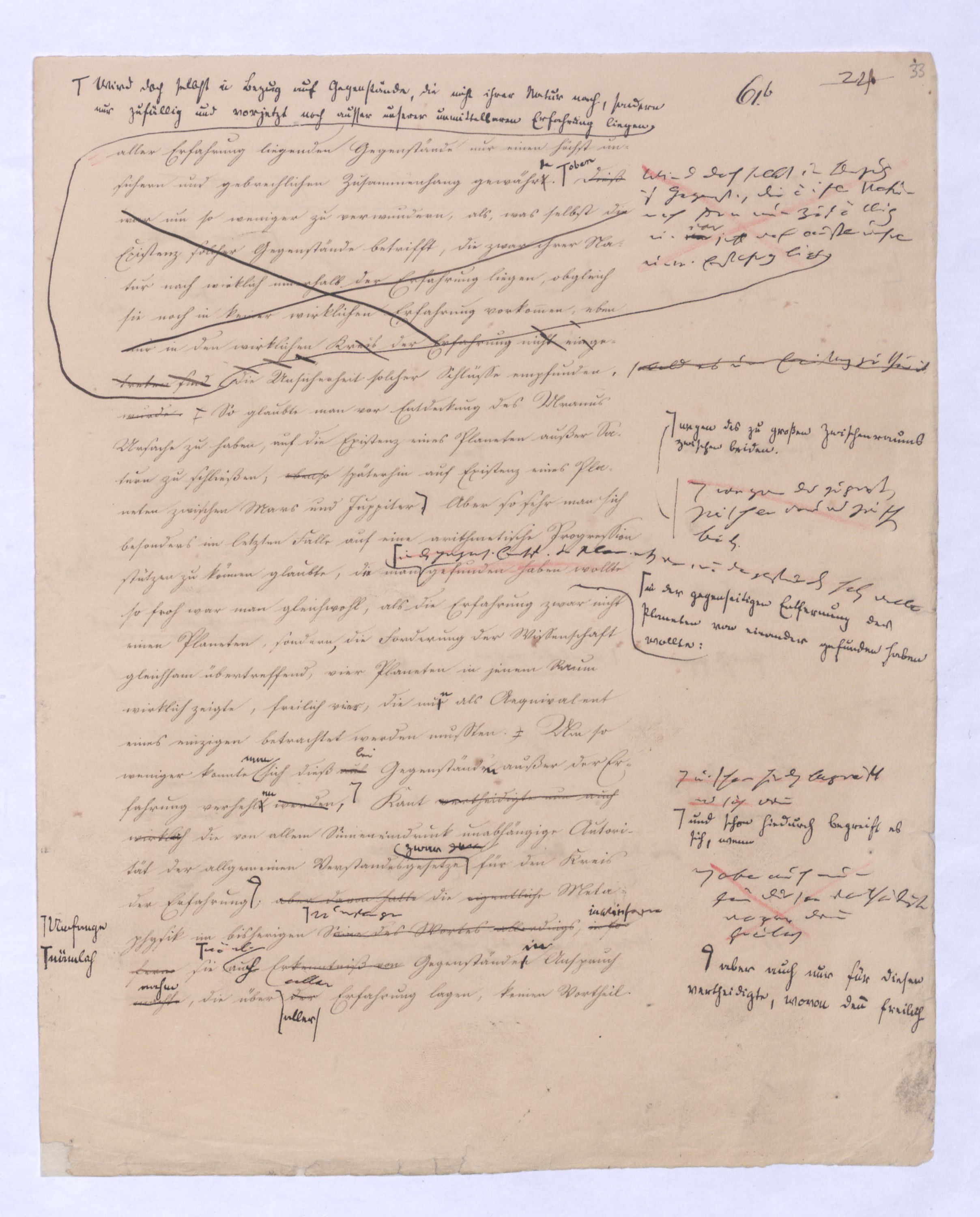 aller Erfahrung liegende Gegenstände nur einen höchst unsicheren und gebrechlichen Zusammenhang gewährt. Dieß war um so weniger zu vermeiden, als, was selbst die Existenz solcher Gegenstände betrifft, die zwar ihrer Natur nach wirklich innerhalb der Erfahrung liegen, obgleich sie noch in keiner wirklichen Erfahrung vorkommen, eben nur in den wirklichen Kreis der Erfahrung nicht eingetreten sind,Wird doch selbst in Bezug auf Gegenst., die nicht ihrer Natur nach sondern nur zufällig u. vonvor jetzt noch außer unserer unm. Erfahrung liegen die Unsicherheit solcher Schlüsse empfunden wurde. (, sobald es um Existenz zu thun ist. So glaubte man vor Entdeckung des Uranus Ursache zu haben, auf die Existenz eines Planeten außer Saturn zu schließen, ebenso späterhin auf Existenz eines Planeten zwischen Mars und Jupiter. wegen des zu großen Zwischenraumes zwischen beiden. Aber so sehr man sich besonders im letzten Falle auf eine arithmetische Progression stützen zu können glaubte, die man in der gegens. Entf. d. Planeten voneinander gefunden haben wollte gefunden haben wollte so froh war man gleichwohl, als die Erfahrung zwar nicht einen Planeten, sondern die Forderung der Wissenschaft gleichsam übertreffend, vier Planeten in jenem Raum wirklich zeigte, freilich vier, die nur als Aequivalent eines einzigen betrachtet werden mussten.) Um so weniger konnte sich dieß aufbei Gegenständen außer der Erfahrung verhehlt werden., u. schon hierdurch begreift es sich wenn Kant vertheidigte nun auch wirklich die von allem Sinneneindruck unabhängige Autorität der allgemeinen Verstandesgesetze zwar für den Kreis der Erfahrung; aber davon sollteaber auch nur für diesen vertheidigte wovon denn freilich die eigentliche Metaphysik im bisherigen Sinne des Wortes allerdingsUmfange, in so fernwie fern sie näml. auf Erkenntniß von Gegenständen Anspruch machte, die über deraller Erfahrung lagen, keinen Vortheil sie ging leer aushatte; während Kant allerdings die Möglichkeit einer eigentlichen Erfahrung, einer objektiven Erkenntniß der in der Erfahrung vorkommendensinnlichen Dinge a priori gezeigt zu haben glaubte,