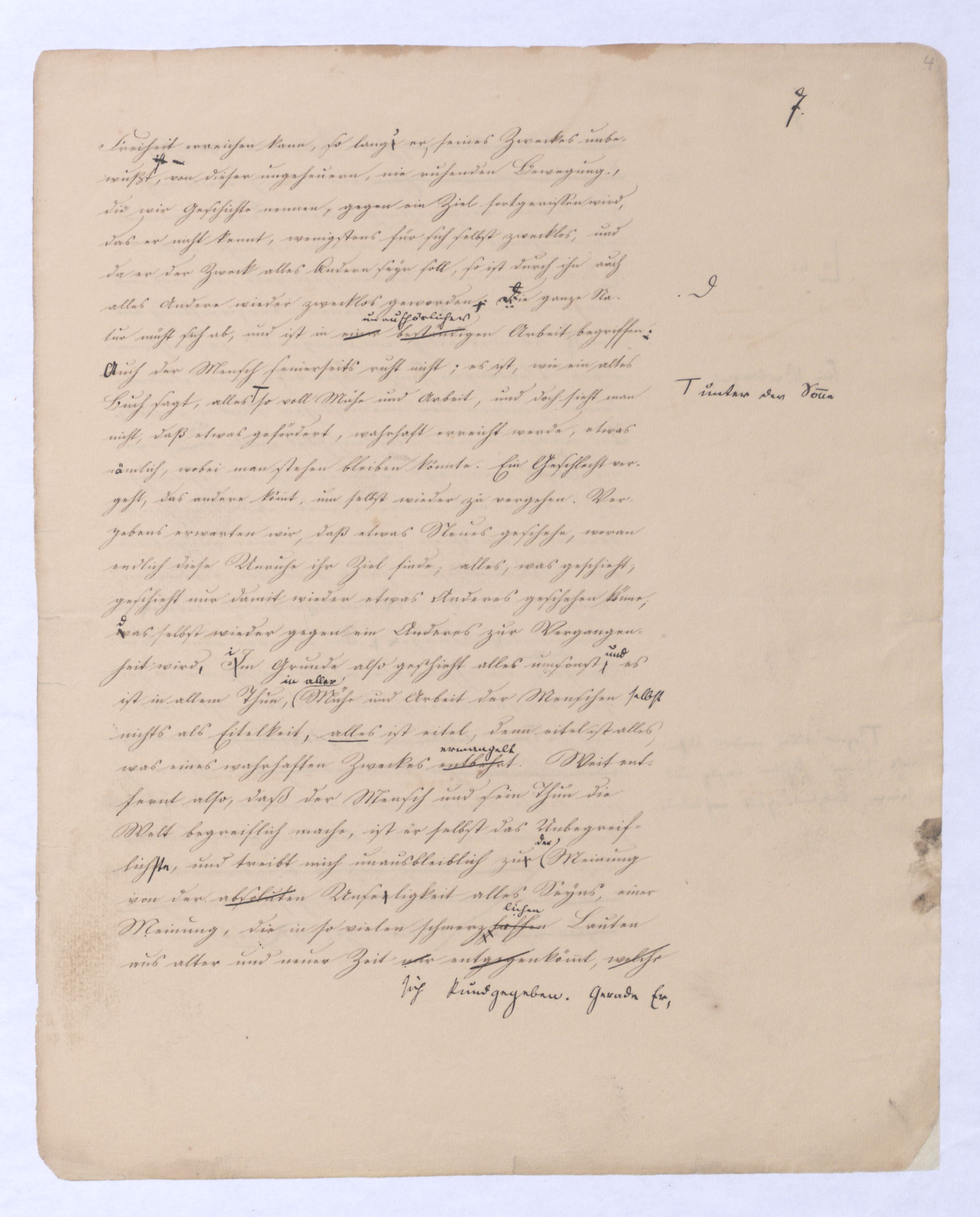.) Wie gesagt wenn von dem bloßen Begriff, d. h. von der bloßen Natur Gs. d. Rede ist, mögen wir dieß gelten lassen. Wenn aber von einereben darin auch d. Activität, von einem Leben, Thun in Gott die Rede ist, wie z. B. davon auch die Hegel’sche Philosophie spricht, muß jeder einsehen, daß es nichtsdes wirkl. Gottes bestehen soll, so müßten wir dieses immerwährende sich s. Denken vielmehr als den peinlichsten Zustand ansehen. Denn Peinlicheres geben könnte kann es gewiß nichts geben, als ohne Aufhören nur sich selbst und also an sich selbst zu denken. Der Mensch wenigstens verlangt vielmehr von sich hinweg, als an sich zu haften, undwie die an sich haftenden Menschen sind wahrlich auchweit nicht die glücklichsten, wie sieu. in der Regel auch die Unproductivsten sindam wen. im Stande sind, etwas außer sich, etwas wahrh. von ihnen Unabh. – Obj. – geistig hervorzubringen. Johannes Müller schreibt in einem seiner Briefe: »ich bin nur glücklich, wenn ich producire