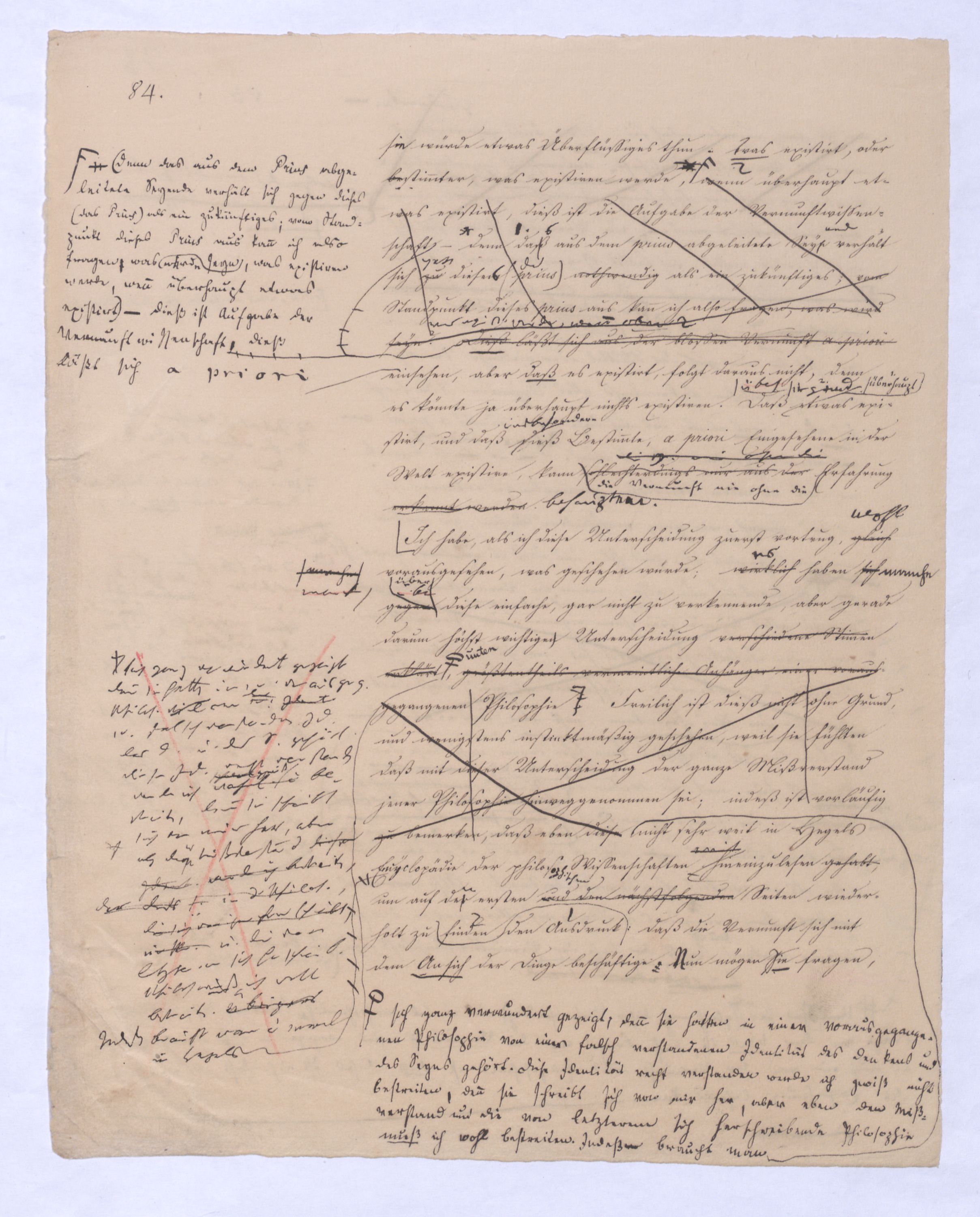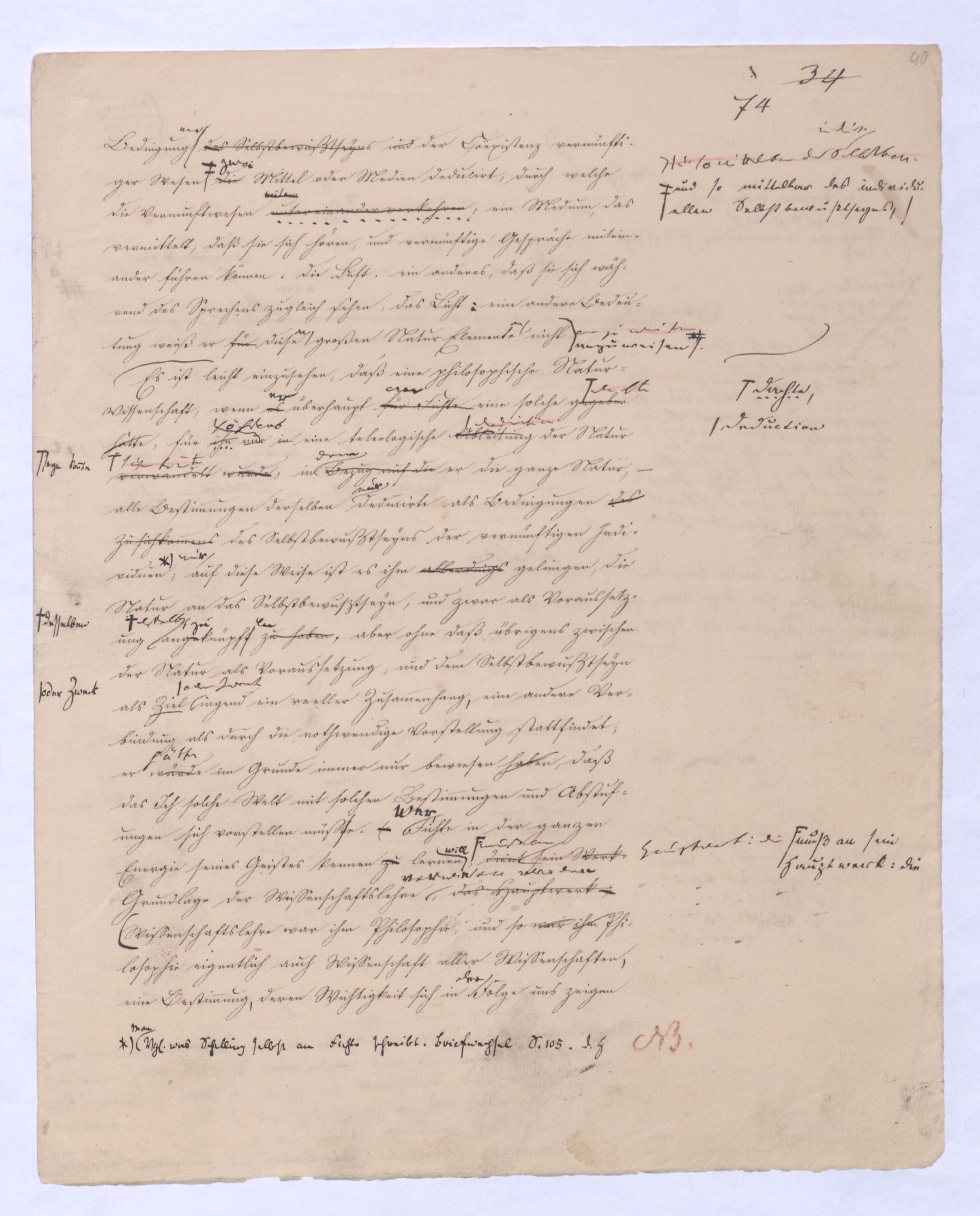 Von zwei Seiten wurde Fichte bestimmend für die ganze Folge der Philosophie. 1) in der beschränkenden Form, die er dem Princip gegeben hat – beschränkend, in wie fern sich es nur als Ich, und zwar als Ich des menschlichen Bewußtseyns, ausgesprochen war – in dieser beschr. Form war aber dennoch der Materie oder dem Wesen nach der wahre Ausgangspunkt jener apriorischen Wissenschaft gefunden, die durch Kant sozur unabweislichen Forderung geworden war. In der That bedurfte es nur der Aufhebung jener beschränkenden Formung woraufnach welcher das prius bestimmt war als Ich des menschlichen Bewußtseyns, um auf das wahre, allgemeine, absolute prius zu kommen, wie ich in der Folge ausführlicher dargestelltzustellen werden wirdGeleg. haben werde. Aber 2) schon eben dadurch, daß Fichte einEin absolutes pPrius setzteforderte, war der Weg über Kant hinausgezeigt. Kant hatte ein dreifach apriorisches der Erkenntniß a) das Apriorische der sinnlichen Anschauung, Raum und Zeit, b) das Apriori’sche der Verstandesbegriffe oder Categorien. c) diedas Apriorische der Begriffe, die er speciell Vernunftbegriffe, oder Ideen nannte, Ideen im engeren Sinne nannte, denen er übrigens nur eine apriorisch regulative nicht apriorisch constitutive Bedeutung zuschrieb, wie den Verstandesbegriffen. ÜberAber über alles dieses einzelne verschied. Apriorische hinaus lag ein Höheres, das zu ihm selbst selbst wieder das gemeinsch. Prius der Sinnlk., des Verstandes u. der Vernunft war sichwieder als prius sich verhältielt, ebennämlich das Erkenntnißvermögen selbst, von welchem jadem Sinnlichkeit, Verstand undwie Vernunft in jenem speciellen Sinne Kants, die noch aus der alten Metaphysik herstammen und von Kant übergangen sind, doch bloß einzelnespecielle Formen sind. Statt zu sagen, das Erkenntnißvermögen selbst ist das prius aller dieser besonderen Formen können wir sagen: die Vernunft in der allgemeinsten und höchsten Bedeutung ist das höchste und absolute prius: denn wenn Kant die Vernunft selbst specialisirt undals ein besonderes Erkenntnißvermögen in ihr siehtgesetzt, sie als ein specielles Vermögen bestimmt, welches sichodernämlich was über allen jenen bes. Erkenntnißformen stand, da s.konnte nur d. Erk.vermögen oder d. Vern. s. seyn in d. allgemeinsten u. höchsten Bed., Kant hatte obgl. erin welcher Kant selbst seine Kritik des Erk.verm. überh. Kr. d. V. hatte nannte, durch im Verlauf dieses Werksobwohl er dann Vernunft wieder als besonderes Erk.vermögen bestimmte, nämlich als das aberspeciell auf das Übersinnliche sich beziehen sollteende. Der Grund daß Kant d. Vern. als Vermögen d.so lange der Grund davon darin liegt, daß allerdings die Vernunft, so wie sie über das Sinnliche hinaus zum Übersinnlichen fortschreitet –Der Hiervon lag aber der Grund bloß darin, daß die V. so sie zum Übers. forschreitet zu welchem wie früher gesagt, nicht etwa bloß Gott, sondern z. B. auch die Welt in absoluter Totalität, als absolutes All ja d. menschl. Seele in ihm gehört, diedas auch nicht mehr bloß sinnlich erkennbar ist – übers., ¿¿¿ Ideen specialisiert zu brauchenmüssen glaubte lag darin, daß sie d. V. allerdings sowie sie zum Übers. fortgeht, allerdings die Erfahrung nicht mehr zur Seite hat, und insofern allerdingsalso in ihrer Bloßheit oder für sich ohne Erfahrung dasteht. Hier erscheint also dann auch die Vernunft als Vernunft, während sie vielmehr im Sinnlichen durch die Sinnlichkeit vermittelt erscheintente darum das Apriorische in den transcendentalen alle Ansch. bedingenden Formen der. Sinnlk. des Raumes und der Zeit, denen jasollte d. Apr. in den doch ganz u. rein intel. Darstellungen des Sns gar nichts Empirisches, Sensibles beigemischt istieas Nothwendigkeite und Allgemeinheite, die das in diesen Formen durch die Mathematik aus diesen Formensich hervorhebt z. B. der geometrischendenn herstammen, wenn nicht von der Vernunft? In. Von der Sinnlichkeit als solcher, die Kant als bloße Receptivität erklärt,