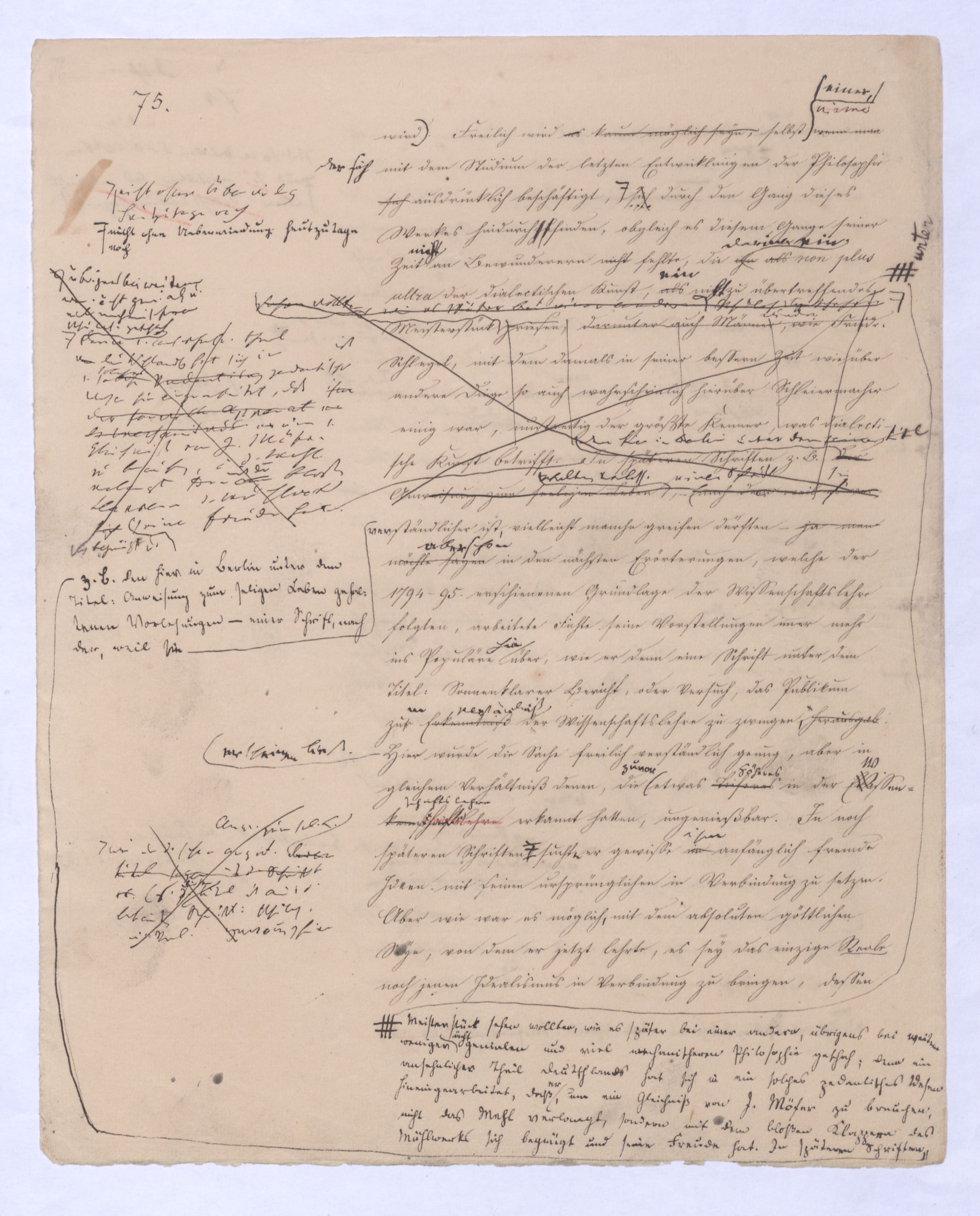 In späteren Schriften z. B. ammit dem bloßen Klappern d. Mühlwerks sichsich begnügt u. seine Freude hat.derden hier in Berlin unter dem seinem Titel Der Anweisung zum seeligen Leben gehaltenen Vorless., – eine Schrift nach dem weil essie verständlicher ist, vielleicht manche greifen dürften – ja man möchte sagenaber schon in den nächsten Erörterungen, welche der 1794–95 erschienenen Grundlage der Wissenschaftslehre folgten, arbeitete Fichte seine Vorstellungen immer mehr ins Populäre hinüber, wie er denn eine Schrift unter dem Titel: »Sonnenklarer Bericht, oder Versuch, das Publikum