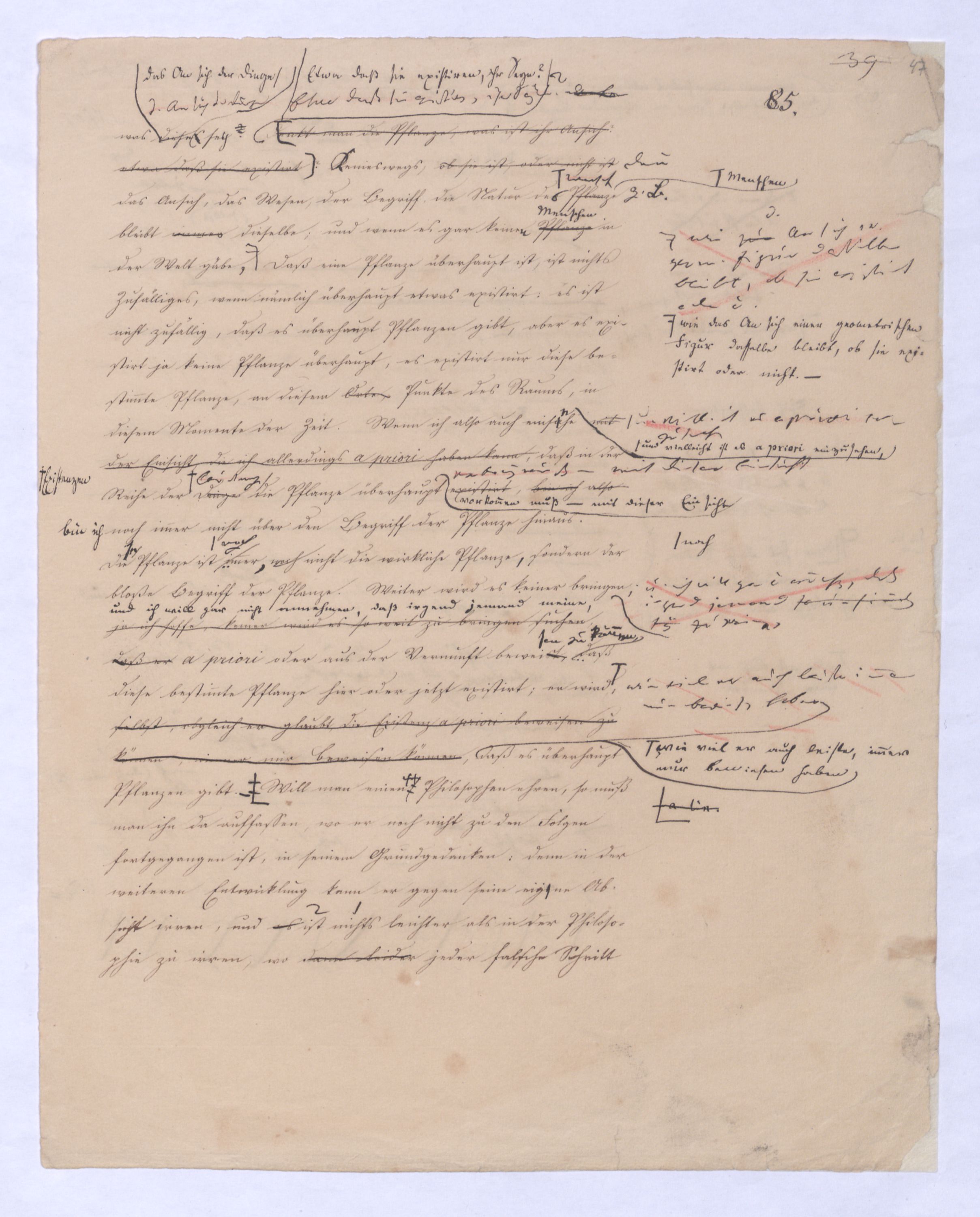 , nun mögen Sie fragen, was d. An sich d. Dinge seyDenkt man die Pflanze, was ist ihr An sich? etwa daß sie existirt?Etwa daß sie existiren, ihr Seyn? Denken keineswegs, ob sie ist, oder nicht istdenn das Ansich, das Wesen, der Begriff, die Natur der Pflanzes Menschen bleibt immer dieselbe; und wenn es gar keine Pflanzen Menschen in der Welt gäbe., wie zumd. An sich einer geom. Figur dasselbe bleibt, ob sie existirt oder nicht. Daß eine Pflanze überhaupt ist, ist nichts Zufälliges, wenn nämlich überhaupt etwas existirt: es ist nicht zufällig, daß es überhaupt Pflanzen gibt, aber es existirt ja keine Pflanze überhaupt, es existirt nur diese bestimmte Pflanze, an diesem Orte, Punkte des Raums, in diesem Momente der Zeit. Wenn ich also auch einsähe mit der Einsicht, die ich allerdings a priori haben kannu. viell. ist es a priori einzusehen, daß in der Reihe der DingeExistenzen die Pflanze überhaupt existirt,vorkommen muß – mit dieser Einsicht bin ich also noch immer nicht über den Begriff der Pflanze hinaus.