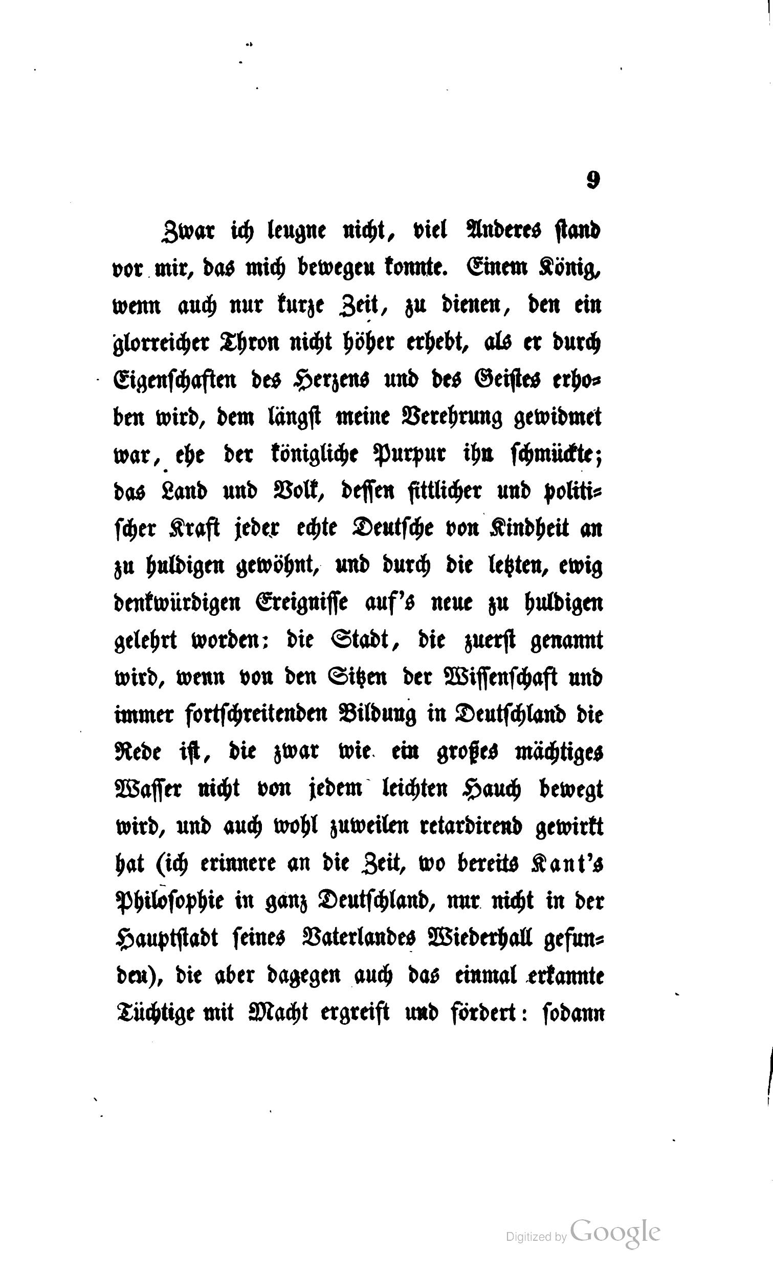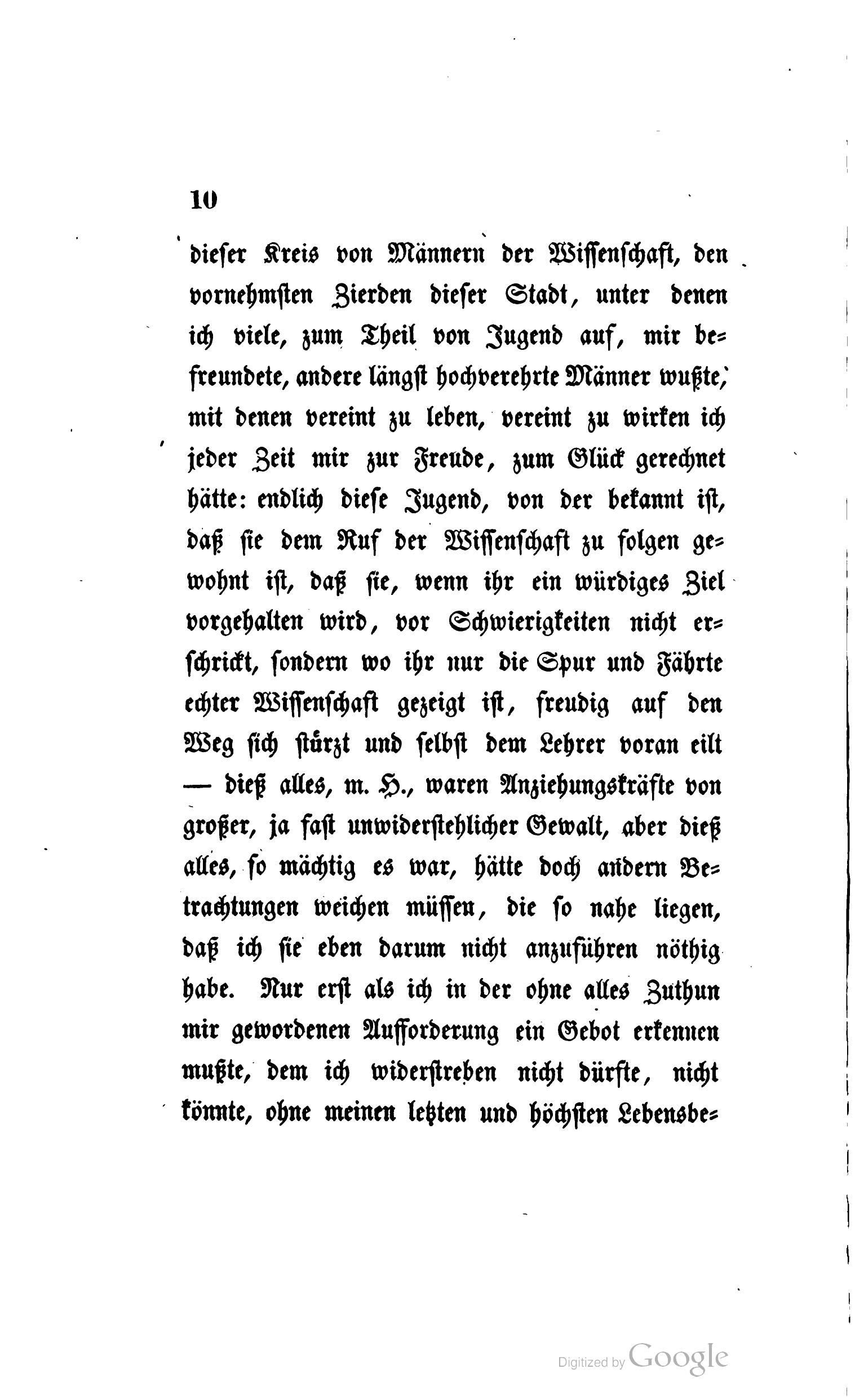 Zwar ich leugne nicht, viel Anderes stand vor mir, das mich bewegen konnte. Einem König, wenn auch nur kurze Zeit, zu dienen, den ein glorreicher Thron nicht höher erhebt, als er durch Eigenschaften des Herzens und des Geistes erhoben wird, dem längst meine Verehrung gewidmet war, ehe der königliche Purpur ihn schmückte; das Land und Volk, dessen sittlicher und politischer Kraft jeder echte Deutsche von Kindheit an zu huldigen gewöhnt, und durch die letzten, ewig denkwürdigen Ereignisse auf's neue zu huldigen gelehrt worden: die Stadt, die zuerst genannt wird, wenn von den Sitzen der Wissenschaft und immer fortschreitenden Bildung in Deutschland die Rede ist, die zwar wie ein großes mächtiges Wasser nicht von jedem leichten Hauch bewegt wird, und auch wohl zuweilen retardirend gewirkt hat (ich erinnere an die Zeit, wo bereits Kant's Philosophie in ganz Deutschland, nur nicht in der Hauptstadt seines Vaterlandes Wiederhall gefunden), die aber dagegen auch das einmal erkannte Tüchtige mit Macht ergreift und fördert: sodann dieser Kreis von Männern der Wissenschaft, den vornehmsten Zierden dieser Stadt, unter denen ich viele, zum Theil von Jugend auf, mir befreundete, andere längst hochverehrte Männer wußte, mit denen vereint zu leben, vereint zu wirken ich jeder Zeit mir zur Freude, zum Glück gerechnet hätte: endlich diese Jugend, von der bekannt ist, daß sie dem Ruf der Wissenschaft zu folgen gewohnt ist, daß sie, wenn ihr ein würdiges Ziel vorgehalten wird, vor Schwierigkeiten nicht erschrickt, sondern wo ihr nur die Spur und Fährte echter Wissenschaft gezeigt ist, freudig auf den Weg sich stürzt und selbst dem Lehrer voran eilt – dieß alles, m. H., waren Anziehungskräfte von großer, ja fast unwiderstehlicher Gewalt, aber dieß alles, so mächtig es war, hätte doch andern Betrachtungen weichen müssen, die so nahe liegen, daß ich sie eben darum nicht anzuführen nöthig habe. Nur erst als ich in der ohne alles Zuthun mir gewordenen Aufforderung ein Gebot erkennen mußte, dem ich widerstreben nicht dürfte, nicht könnte, ohne meinen letzten und höchsten Lebensberuf zu verfehlen: da war ich entschlossen, und so trete ich denn auch entschlossen und mit der Ueberzeugung unter Sie, daß, wenn ich je etwas, es sey viel oder wenig, für die Philosophie gethan, ich hier das Bedeutendste für sie thun werde, wenn es mir gelingt, sie aus der unleugbar schwierigen Stellung, in der sie sich eben befindet, wieder hinaus zu führen in die freie, unbekümmerte, von allen Seiten ungehemmte Bewegung, die ihr jetzt genommen ist: denn diese Schwierigkeiten, mit denen die Philosophie zu ringen hat, sind offenbar und lassen sich nicht verheimlichen.