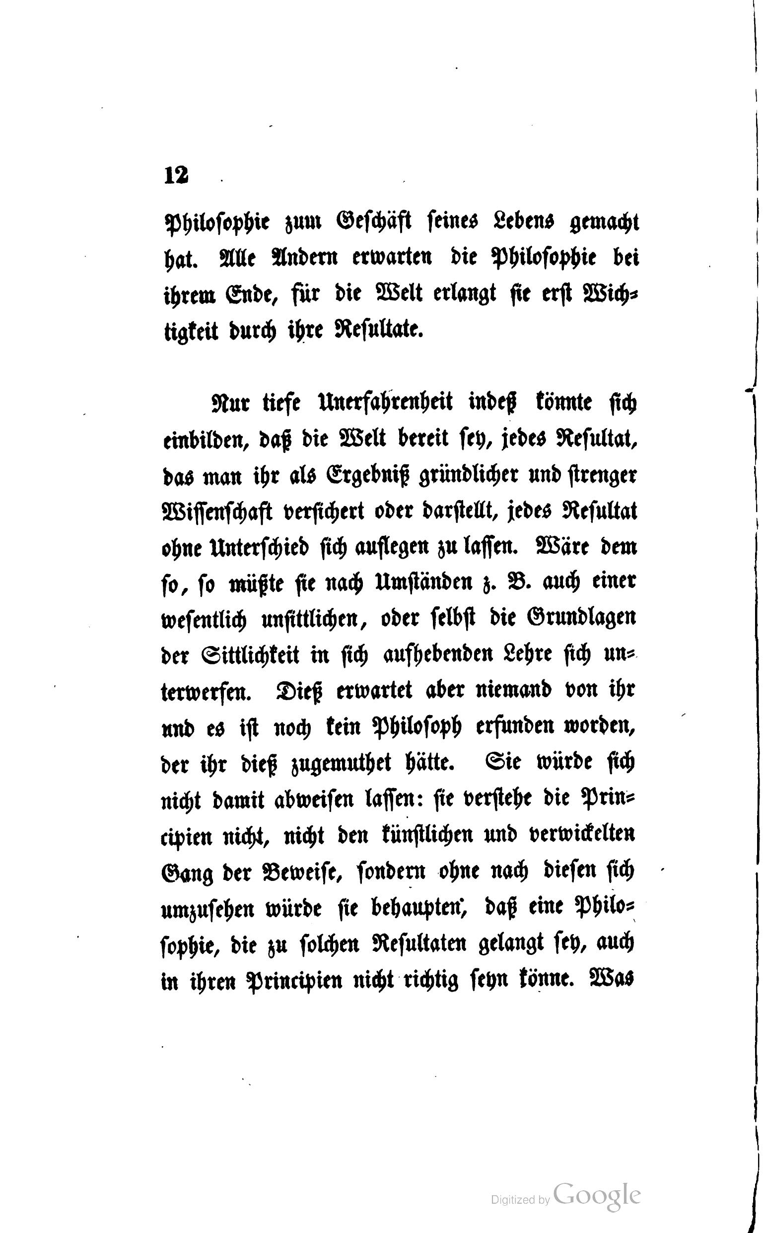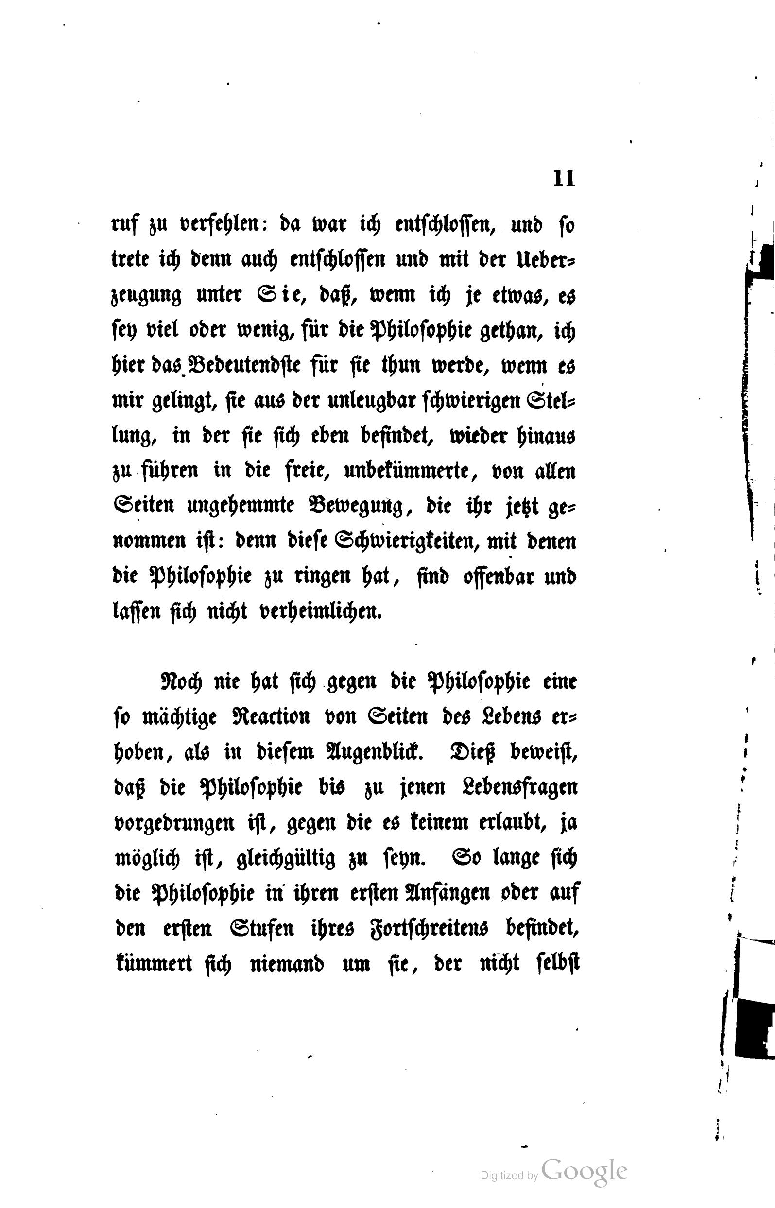 Noch nie hat sich gegen die Philosophie eine so mächtige Reaction von Seiten des Lebens erhoben, als in diesem Augenblick. Dieß beweist, daß die Philosophie bis zu jenen Lebensfragen vorgedrungen ist, gegen die es keinem erlaubt, ja möglich ist, gleichgültig zu seyn. So lange sich die Philosophie in ihren ersten Anfängen oder auf den ersten Stufen ihres Fortschreitens befindet, kümmert sich niemand um sie, der nicht selbst Philosophie zum Geschäft seines Lebens gemacht hat. Alle Andern erwarten die Philosophie bei ihrem Ende, für die Welt erlangt sie erst Wichtigkeit durch ihre Resultate