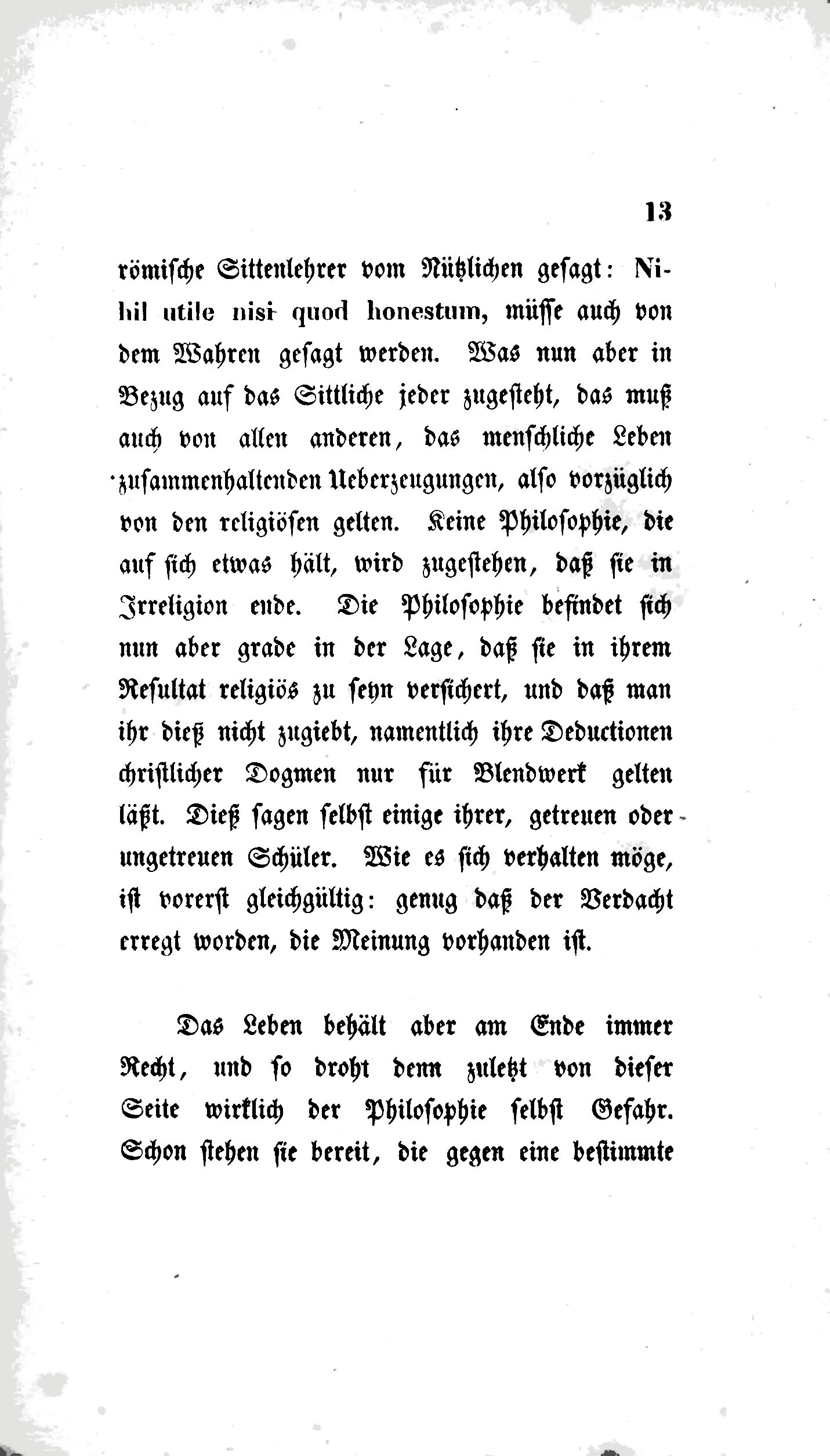 Nur tiefe Unerfahrenheit indeß könnte sich einbilden, daß die Welt bereit sey, jedes Resultat, das man ihr als Ergebniß gründlicher und strenger Wissenschaft versichert oder darstellt, jedes Resultat ohne Unterschied sich auflegen zu lassen. Wäre dem so, so müßte sie nach Umständen z. B. auch einer wesentlich unsittlichen, oder selbst die Grundlagen der Sittlichkeit in sich aufhebenden Lehre sich unterwerfen. Dieß erwartet aber niemand von ihr und es ist noch kein Philosoph erfunden worden, der ihr dieß zugemuthet hätte. Sie würde sich nicht damit abweisen lassen: sie verstehe die Principien nicht, nicht den künstlichen und verwickelten Gang der Beweise, sondern ohne nach diesen sich umzusehen würde sie behaupten, daß eine Philosophie, die zu solchen Resultaten gelangt sey, auch in ihren Principien nicht richtig seyn könne. Was römische Sittenlehrer vom Nützlichen gesagt: Nihil utile nisi quod honestum, müsse auch von dem Wahren gesagt werden. Was nun aber in Bezug auf das Sittliche jeder zugesteht, das muß auch von allen anderen, das menschliche Leben zusammenhaltenden Ueberzeugungen, also vorzüglich von den religiösen gelten. Keine Philosophie, die auf sich etwas hält, wird zugestehen, daß sie in Irreligion ende. Die Philosophie befindet sich nun aber grade in der Lage, daß sie in ihrem Resultat religiös zu seyn versichert, und daß man ihr dieß nicht zugiebt, namentlich ihre Deductionen christlicher Dogmen nur für Blendwerk gelten läßt. Dieß sagen selbst einige ihrer, getreuen oder ungetreuen Schüler. Wie es sich verhalten möge, ist vorerst gleichgültig: genug daß der Verdacht erregt worden, die Meinung vorhanden ist.