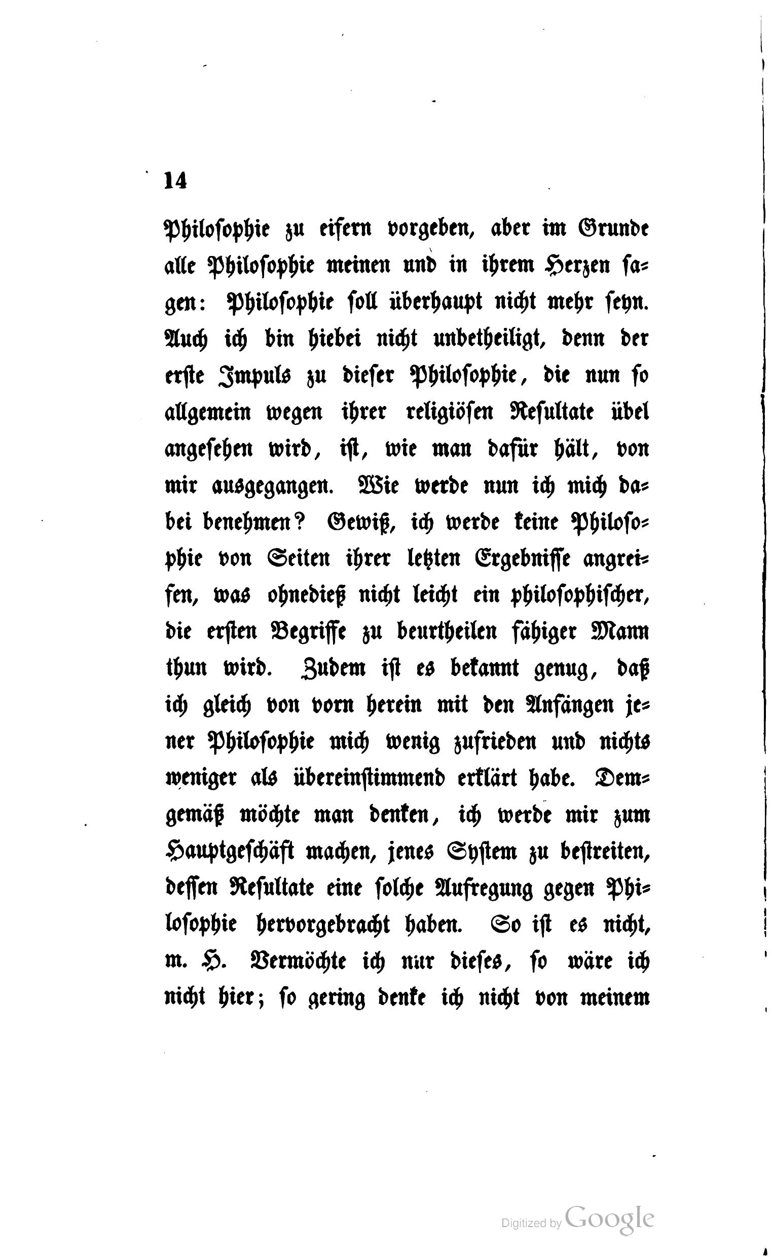 Das Leben behält aber am Ende immer Recht, und so droht denn zuletzt von dieser Seite wirklich der Philosophie selbst Gefahr. Schon stehen sie bereit, die gegen eine bestimmte Philosophie zu eifern vorgeben, aber im Grunde alle Philosophie meinen, und in ihrem Herzen sagen: Philosophie soll überhaupt nicht mehr seyn. Auch ich bin hiebei nicht unbetheiligt, denn der erste Impuls zu dieser Philosophie, die nun so allgemein wegen ihrer religiösen Resultate übel angesehen wird, ist, wie man dafür hält, von mir ausgegangen. Wie werde nun ich mich dabei benehmen? Gewiß, ich werde keine Philosophie von Seiten ihrer letzten Ergebnisse angreifen, was ohnedieß nicht leicht ein philosophischer, die ersten Begriffe zu beurtheilen fähiger Mann thun wird. Zudem ist es bekannt genug, daß ich gleich von vorn herein mit den Anfängen jener Philosophie mich wenig zufrieden und nichts weniger als übereinstimmend erklärt habe. Demgemäß möchte man denken, ich werde mir zum Hauptgeschäft machen, jenes System zu bestreiten, dessen Resultate eine solche Aufregung gegen Philosophie hervorgebracht haben. So ist es nicht, m. H. Vermöchte ich nur dieses, so wäre ich nicht hier; so gering denke ich nicht von meinem Beruf. Ein solches unerfreuliches Geschäft überlasse ich gern andern. Unerfreulich nenne ich es; denn es ist schon immer traurig, etwas, das mit besonderer Energie zusammengefügt worden, von selbst sich auflösen zu sehen. Die geistige und moralische Welt ist in sich so zertrennt, so zur Anarchie geneigt, daß man froh seyn darf, wenn, wie immer, wenn auch nur für den Augenblick ein Vereinigungspunkt gegeben ist. Noch trauriger aber ist, etwas zu zerstören, wenn man nichts an dessen Stelle zu setzen hat. Mach' es besser! sagt man mit Recht dem, der bloß tadelt, und eben so Recht hatte ein Mann, den ich aufrichtig bedaure, nicht mehr unter den Lebenden hier gefunden zu haben, der mit lobenswerther Offenheit sagte: »ein System müsse man einmal haben, und ein System könne nur durch ein System widerlegt werden, so lang dem bestehenden kein anderes haltbares entgegengesetzt sey, möge man ihn bei diesem lassen.«
