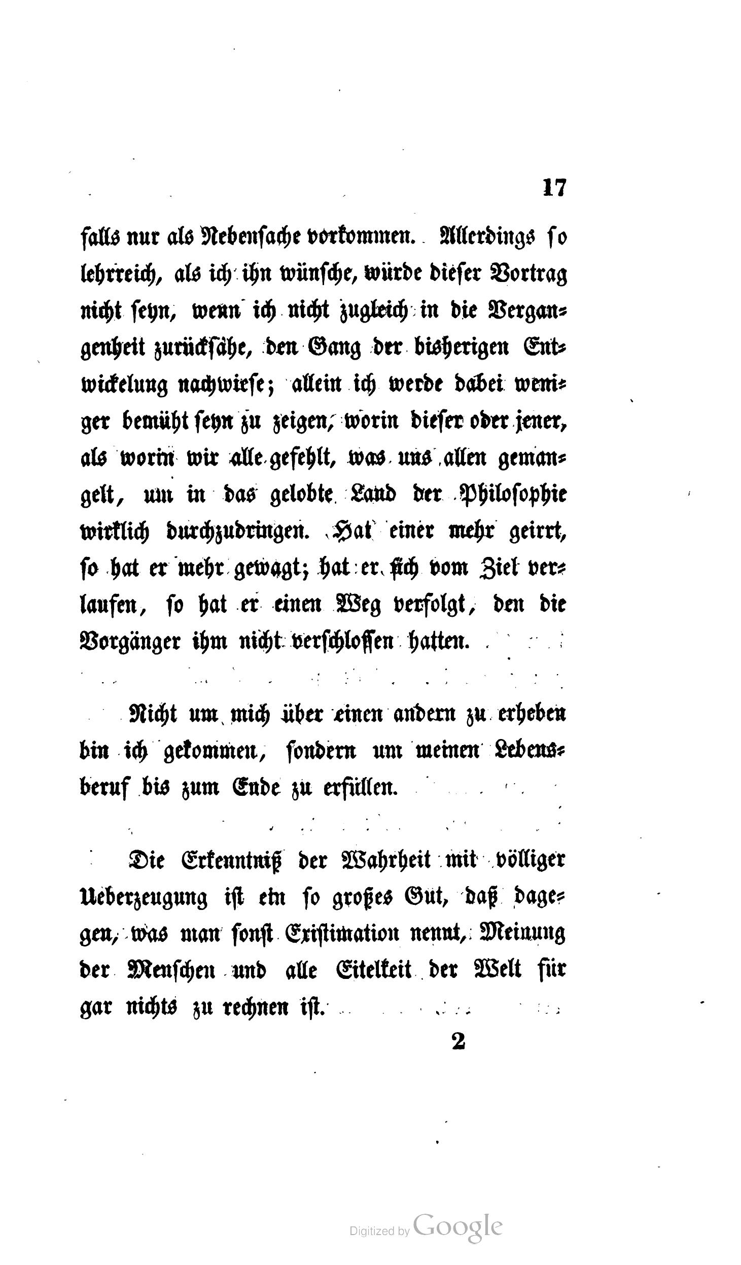 Also – Polemik, was man gewöhnlich so nennt; als Zweck wird sie nie erscheinen und jedenfalls nur als Nebensache vorkommen. Allerdings so lehrreich, als ich ihn wünsche, würde dieser Vortrag nicht seyn, wenn ich nicht zugleich in die Vergangenheit zurücksähe, den Gang der bisherigen Entwickelung nachwiese; allein ich werde dabei weniger bemüht seyn zu zeigen, worin dieser oder jener, als worin wir alle gefehlt, was uns allen gemangelt, um in das gelobte Land der Philosophie wirklich durchzudringen. Hat einer mehr geirrt, so hat er mehr gewagt; hat er sich vom Ziel verlaufen, so hat er einen Weg verfolgt, den die Vorgänger ihm nicht verschlossen hatten.
