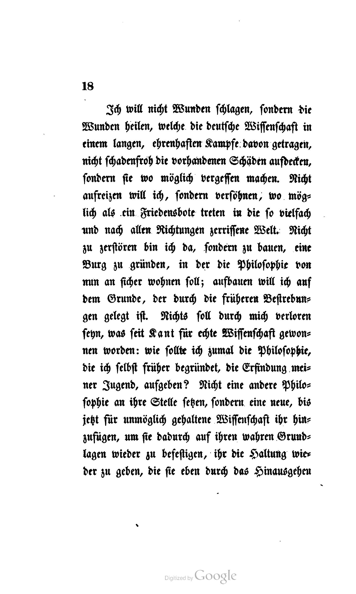 Ich will nicht Wunden schlagen, sondern die Wunden heilen, welche die deutsche Wissenschaft in einem langen, ehrenhaften Kampfe davon getragen, nicht schadenfroh die vorhandenen Schäden aufdecken, sondern sie wo möglich vergessen machen. Nicht aufreizen will ich, sondern versöhnen, wo möglich als ein Friedensbote treten in die so vielfach und nach allen Richtungen zerrissene Welt. Nicht zu zerstören bin ich da, sondern zu bauen, eine Burg zu gründen, in der die Philosophie von nun an sicher wohnen soll; aufbauen will ich auf dem Grunde, der durch die früheren Bestrebungen gelegt ist. Nichts soll durch mich verloren seyn, was seit Kant für echte Wissenschaft gewonnen worden: wie sollte ich zumal die Philosophie, die ich selbst früher begründet, die Erfindung meiner Jugend, aufgeben? Nicht eine andere Philosophie an ihre Stelle setzen, sondern eine neue, bis jetzt für unmöglich gehaltene Wissenschaft ihr hinzufügen, um sie dadurch auf ihren wahren Grundlagen wieder zu befestigen, ihr die Haltung wieder zu geben, die sie eben durch das Hinausgehen über ihre natürlichen Grenzen – eben dadurch verloren hat, daß man etwas, das nur Bruchstück eines höheren Ganzen seyn konnte, selbst zum Ganzen machen wollte – dieß ist die Aufgabe und die Absicht.
