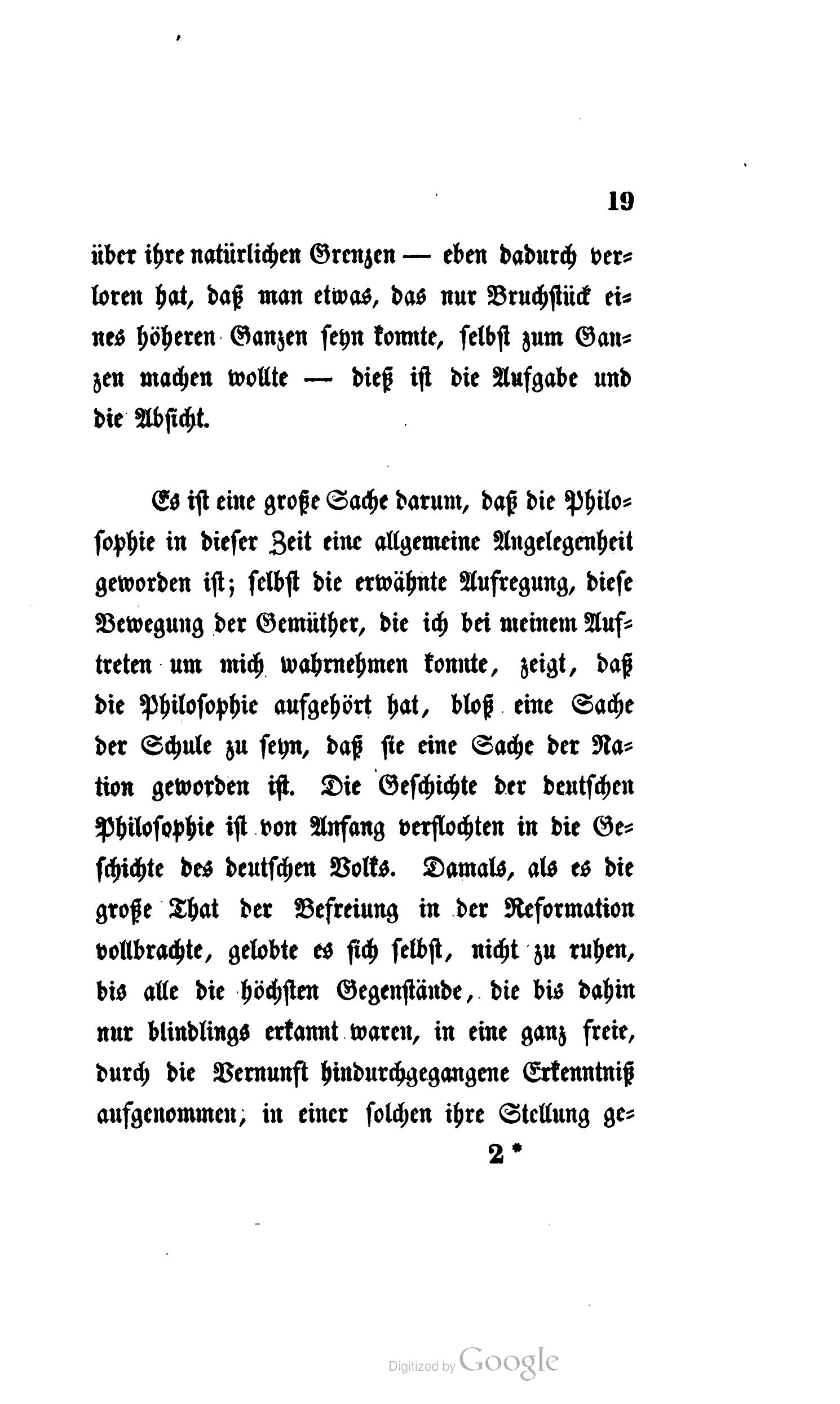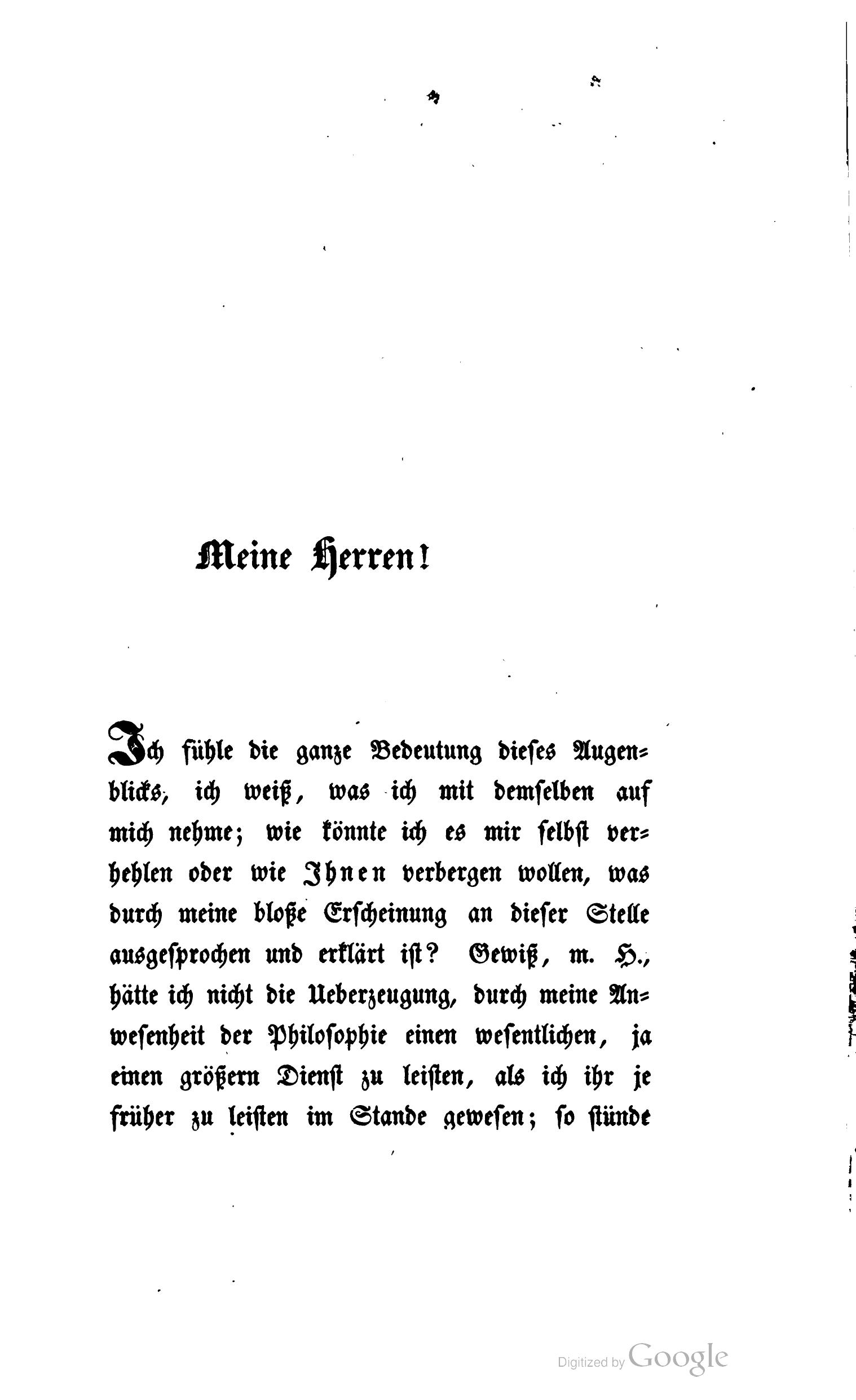 Es ist eine große Sache darum, daß die Philosophie in dieser Zeit eine allgemeine Angelegenheit geworden ist; selbst die erwähnte Aufregung, diese Bewegung der Gemüther, die ich bei meinem Auftreten um mich wahrnehmen konnte, zeigt, daß die Philosophie aufgehört hat, bloß eine Sache der Schule zu seyn, daß sie eine Sache der Nation geworden ist. Die Geschichte der deutschen Philosophie ist von Anfang verflochten in die Geschichte des deutschen Volks. Damals, als es die große That der Befreiung in der Reformation vollbrachte, gelobte es sich selbst, nicht zu ruhen, bis alle die höchsten Gegenstände, die bis dahin nur blindlings erkannt waren, in eine ganz freie, durch die Vernunft hindurchgegangene Erkenntniß aufgenommen, in einer solchen ihre Stellung gefunden hätten. In der Zeit der tiefsten Erniedrigung hielt Philosophie den Deutschen aufrecht, über den Trümmern untergegangener Herrlichkeit hielten Männer von Kraft das Panier deutscher Wissenschaft hoch empor, um das die beste Jugend sich sammelte. In den Schulen der Philosophen – wer gedenkt hier nicht Fichte's, wer nicht zugleich Schleiermacher's? – fanden manche die Entschlossenheit, in den Kämpfen um Philosophie den Muth und die Besonnenheit, die sich nachher auf ganz andern Schlachtfeldern erprobte. – Auch später noch blieb Philosophie der Deutschen Ruhm und Erbtheil. Sollte nun diese lange ruhmvolle Bewegung mit einem schmählichen Schiffbruch enden, mit Zerstörung aller großen Ueberzeugungen und somit der Philosophie selbst? Nimmermehr! Weil ich ein Deutscher bin, weil ich alles Weh und Leid wie alles Glück und Wohl Deutschlands in meinem Herzen mitgetragen und mitempfunden, darum bin ich hier: denn das Heil der Deutschen ist in der Wissenschaft.