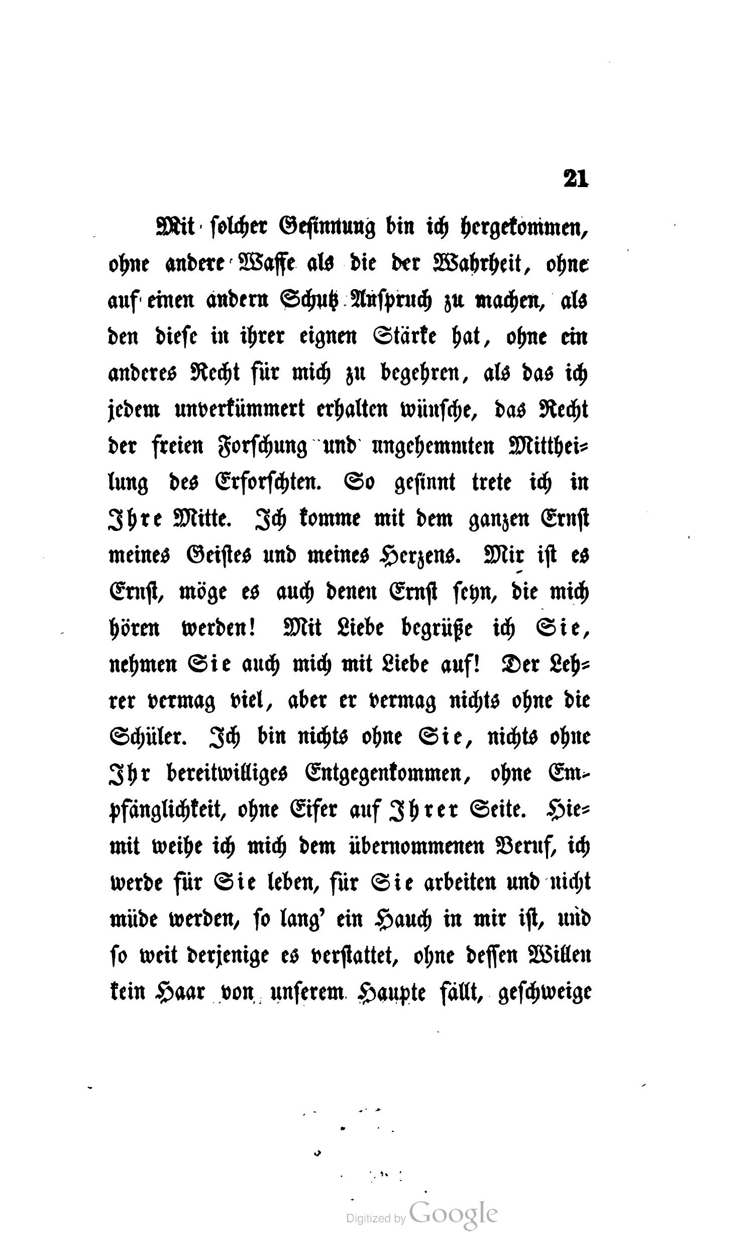 Mit solcher Gesinnung bin ich hergekommen, ohne andere Waffe als die der Wahrheit, ohne auf einen andern Schutz Anspruch zu machen, als den diese in ihrer eignen Stärke hat, ohne ein anderes Recht für mich zu begehren, als das ich jedem unverkümmert erhalten wünsche, das Recht der freien Forschung und ungehemmten Mittheilung des Erforschten. So gesinnt trete ich in Ihre Mitte. Ich komme mit dem ganzen Ernst meines Geistes und meines Herzens. Mir ist es Ernst, möge es auch denen Ernst seyn, die mich hören werden! Mit Liebe begrüße ich Sie, nehmen Sie auch mich mit Liebe auf! Der Lehrer vermag viel, aber er vermag nichts ohne die Schüler. Ich bin nichts ohne Sie, nichts ohne Ihr bereitwilliges Entgegenkommen, ohne Empfänglichkeit, ohne Eifer auf Ihrer Seite. Hiemit weihe ich mich dem übernommenen Beruf, ich werde für Sie leben, für Sie arbeiten und nicht müde werden, so lang' ein Hauch in mir ist, und so weit derjenige es verstattet, ohne dessen Willen kein Haar von unserem Haupte fällt, geschweige ein tiefempfundenes Wort, ein echtes Erzeugniß unseres Innern, ein Lichtgedanke unseres nach Wahrheit und Freiheit ringenden Geistes verloren geht.