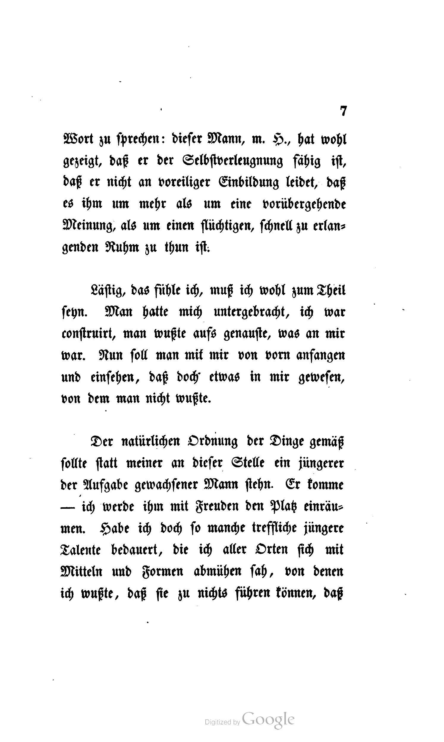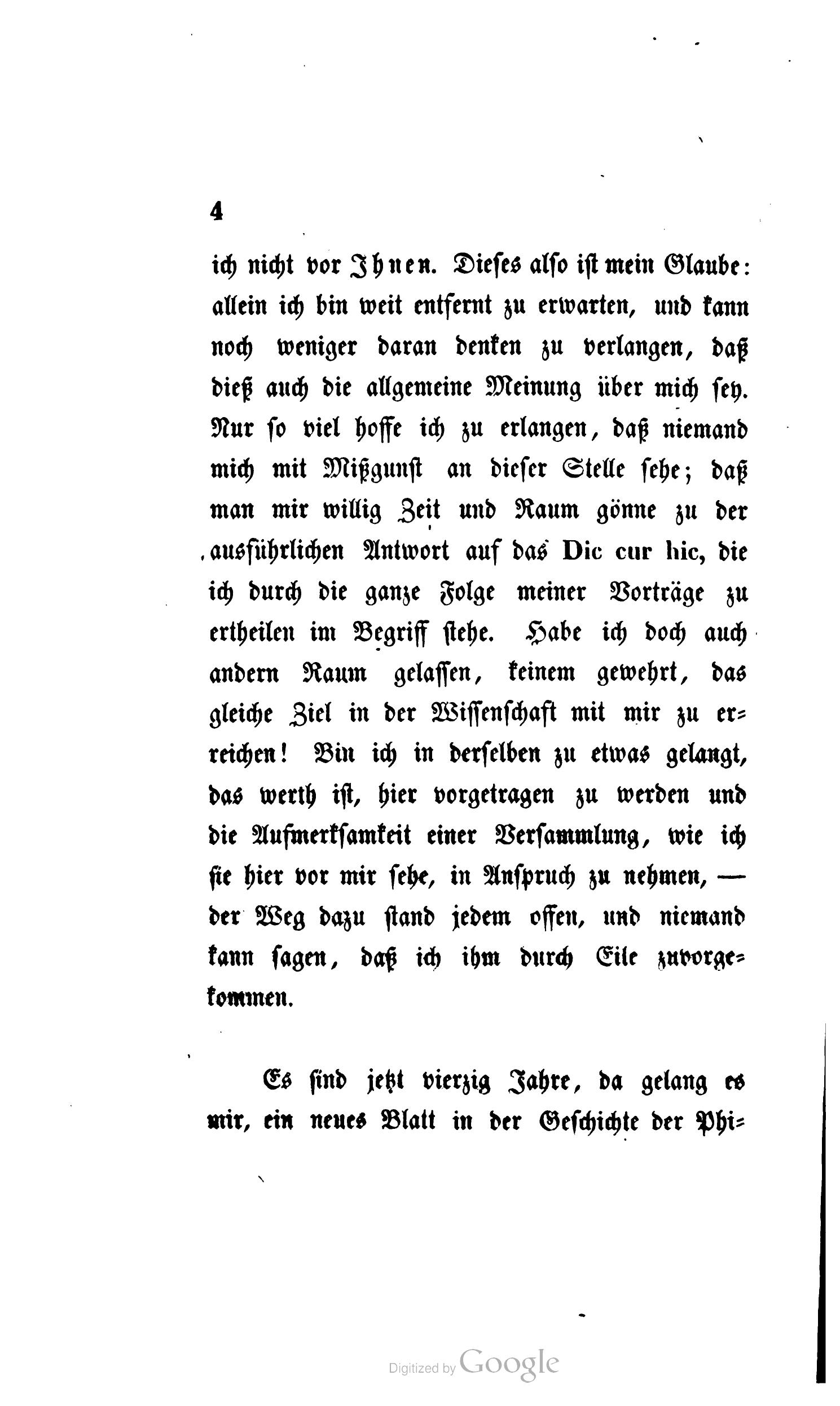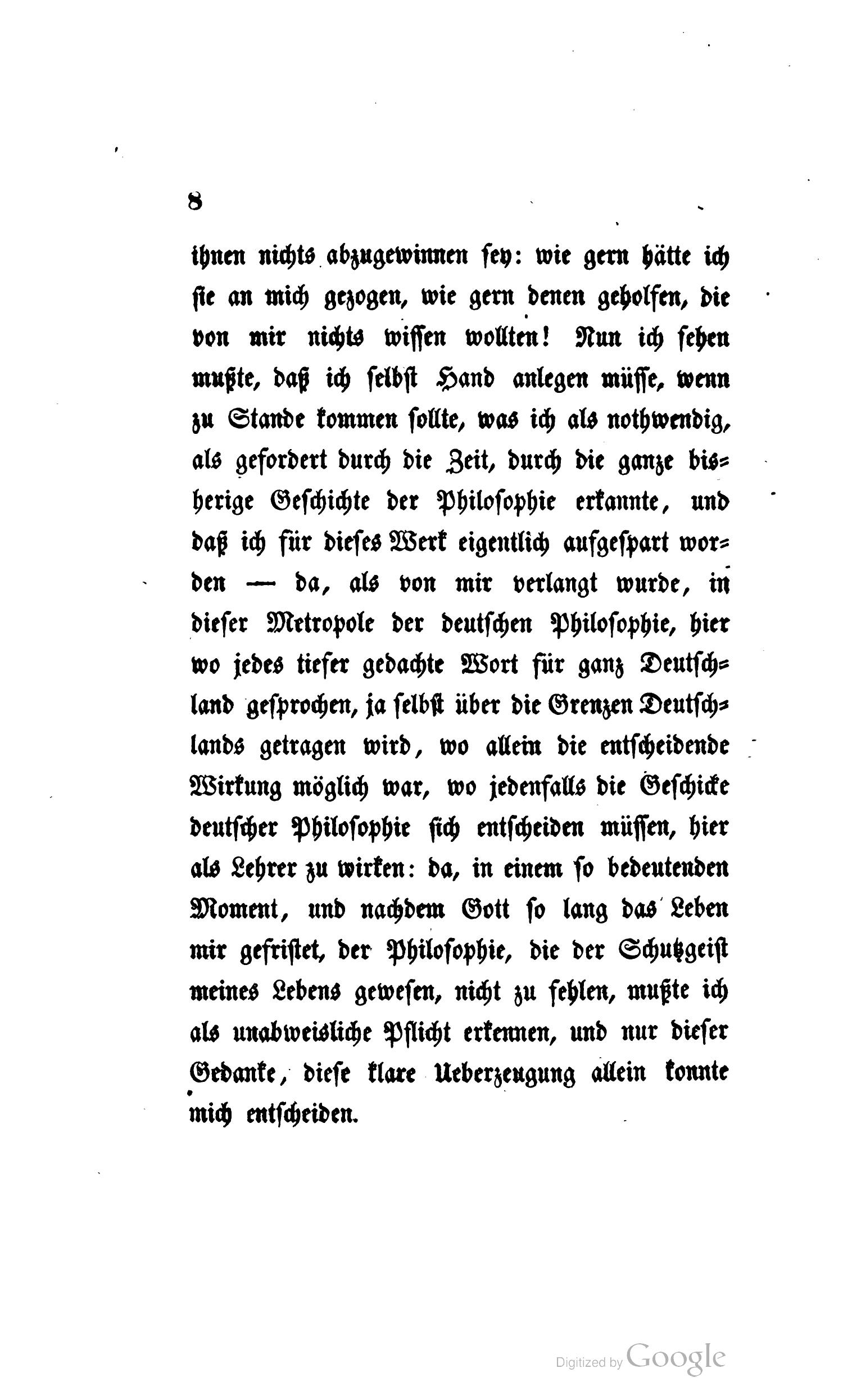 Der natürlichen Ordnung der Dinge gemäß sollte statt meiner an dieser Stelle ein jüngerer der Aufgabe gewachsener Mann stehn. Er komme – ich werde ihm mit Freuden den Platz einräumen. Habe ich doch so manche treffliche jüngere Talente bedauert, die ich aller Orten sich mit Mitteln und Formen abmühen sah, von denen ich wußte, daß sie zu nichts führen können, daß ihnen nichts abzugewinnen sey: wie gern hätte ich sie an mich gezogen, wie gern denen geholfen, die von mir nichts wissen wollten! Nun ich sehen mußte, daß ich selbst Hand anlegen müsse, wenn zu Stande kommen sollte, was ich als nothwendig, als gefordert durch die Zeit, durch die ganze bisherige Geschichte der Philosophie erkannte, und daß ich für dieses Werk eigentlich aufgespart worden – da, als von mir verlangt wurde, in dieser Metropole der deutschen Philosophie, hier wo jedes tiefer gedachte Wort für ganz Deutschland gesprochen, ja selbst über die Grenzen Deutschlands getragen wird, wo allein die entscheidende Wirkung möglich war, wo jedenfalls die Geschicke deutscher Philosophie sich entscheiden müssen, hier als Lehrer zu wirken: da, in einem so bedeutenden Moment, und nachdem Gott so lang das Leben mir gefristet, der Philosophie, die der Schutzgeist meines Lebens gewesen, nicht zu fehlen, mußte ich als unabweisliche Pflicht erkennen, und nur dieser Gedanke, diese klare Ueberzeugung allein konnte mich entscheiden.