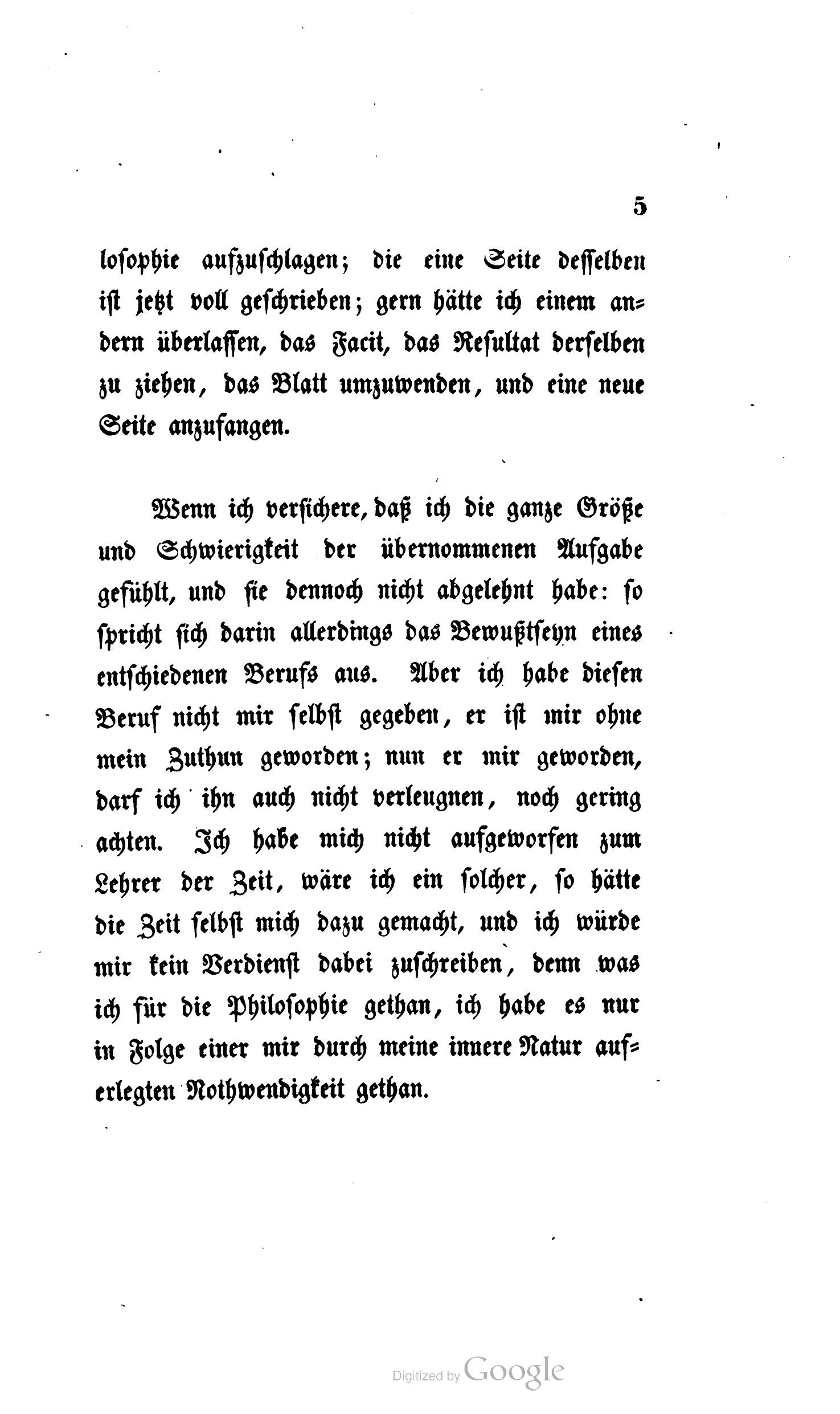 Wenn ich versichere, daß ich die ganze Größe und Schwierigkeit der übernommenen Aufgabe gefühlt, und sie dennoch nicht abgelehnt habe: so spricht sich darin allerdings das Bewußtseyn eines entschiedenen Berufs aus. Aber ich habe diesen Beruf nicht mir selbst gegeben, er ist mir ohne mein Zuthun geworden; nun er mir geworden, darf ich ihn auch nicht verleugnen, noch gering achten. Ich habe mich nicht aufgeworfen zum Lehrer der Zeit