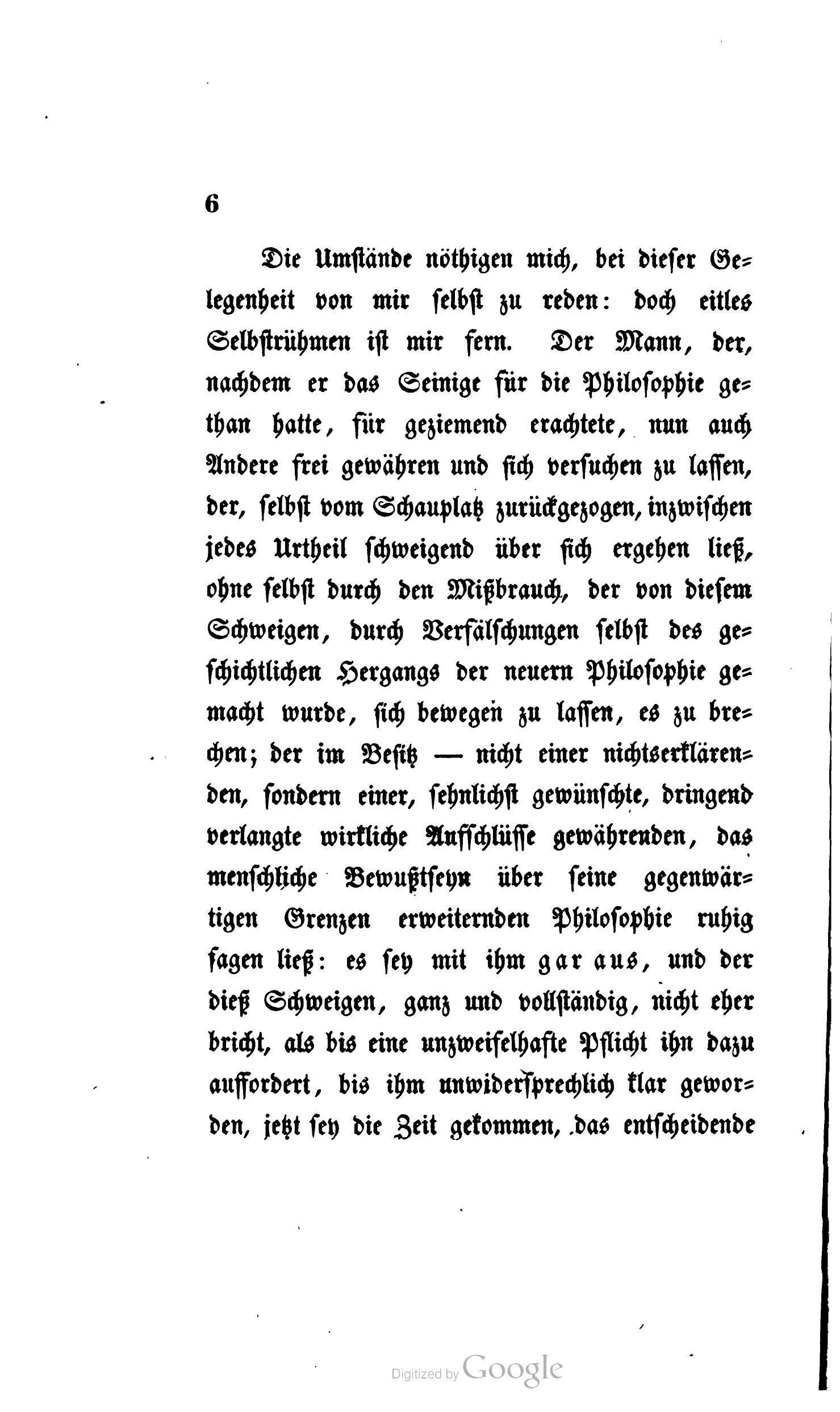 Die Umstände nöthigen mich, bei dieser Gelegenheit von mir selbst zu reden: doch eitles Selbstrühmen ist mir fern. Der Mann, der, nachdem er das Seinige für die Philosophie gethan hatte, für geziemend erachtete, nun auch Andere frei gewähren und sich versuchen zu lassen, der, selbst vom Schauplatz zurückgezogen, inzwischen jedes Urtheil schweigend über sich ergehen ließ, ohne selbst durch den Mißbrauch, der von diesem Schweigen, durch Verfälschungen selbst des geschichtlichen Hergangs der neuern Philosophie gemacht wurde, sich bewegen zu lassen, es zu brechen; der im Besitz – nicht einer nichtserklärenden, sondern einer, sehnlichst gewünschte, dringend verlangte wirkliche Aufschlüsse gewährenden, das menschliche Bewußtseyn über seine gegenwärtigen Grenzen erweiternden Philosophie ruhig sagen ließ: es sey mit ihm gar aus, und der dieß Schweigen, ganz und vollständig, nicht eher bricht, als bis eine unzweifelhafte Pflicht ihn dazu auffordert, bis ihm unwidersprechlich klar geworden, jetzt sey die Zeit gekommen, das entscheidende Wort zu sprechen: dieser Mann, m. H., hat wohl gezeigt, daß er der Selbstverleugnung fähig ist, daß er nicht an voreiliger Einbildung leidet, daß es ihm um mehr als um eine vorübergehende Meinung, als um einen flüchtigen, schnell zu erlangenden Ruhm zu thun ist.